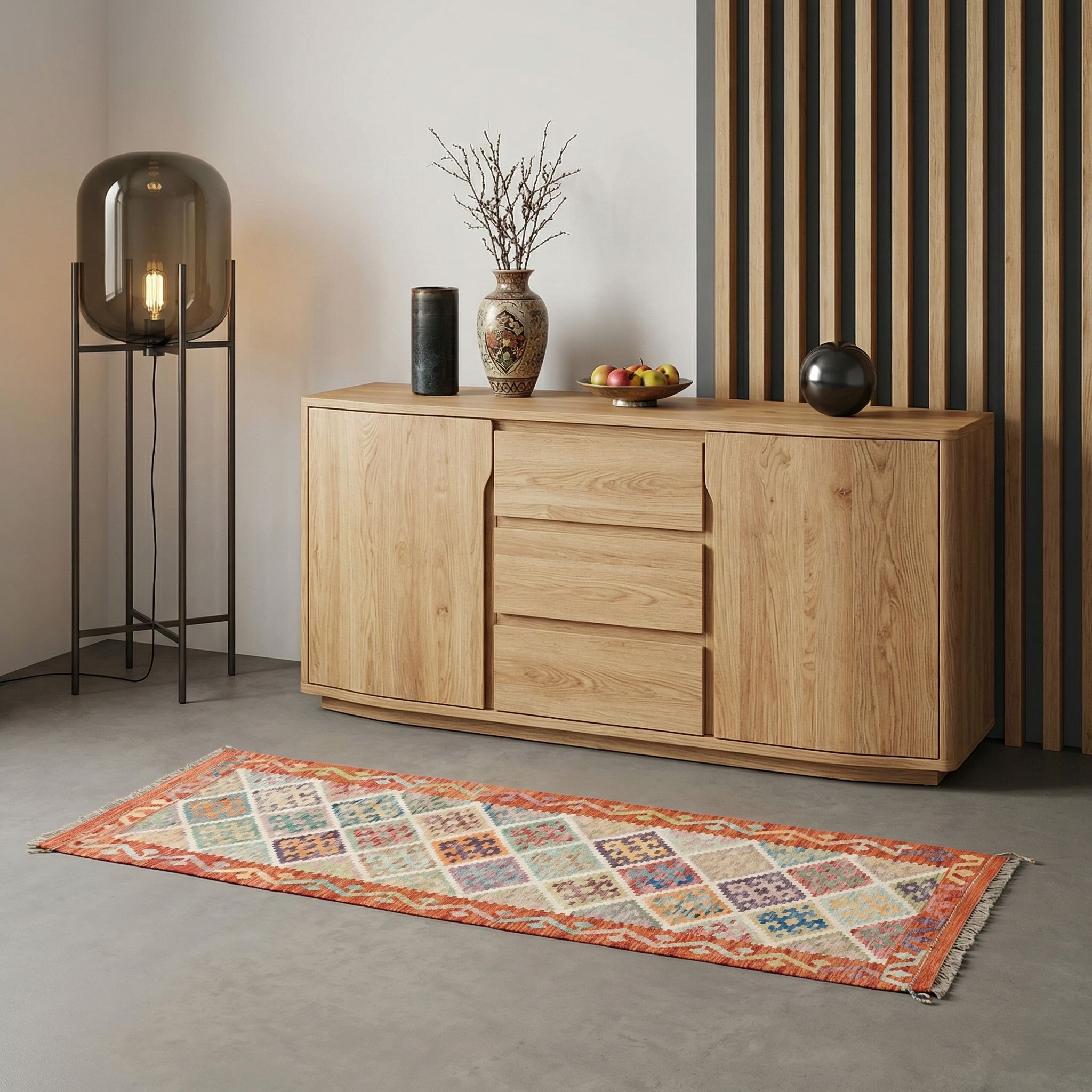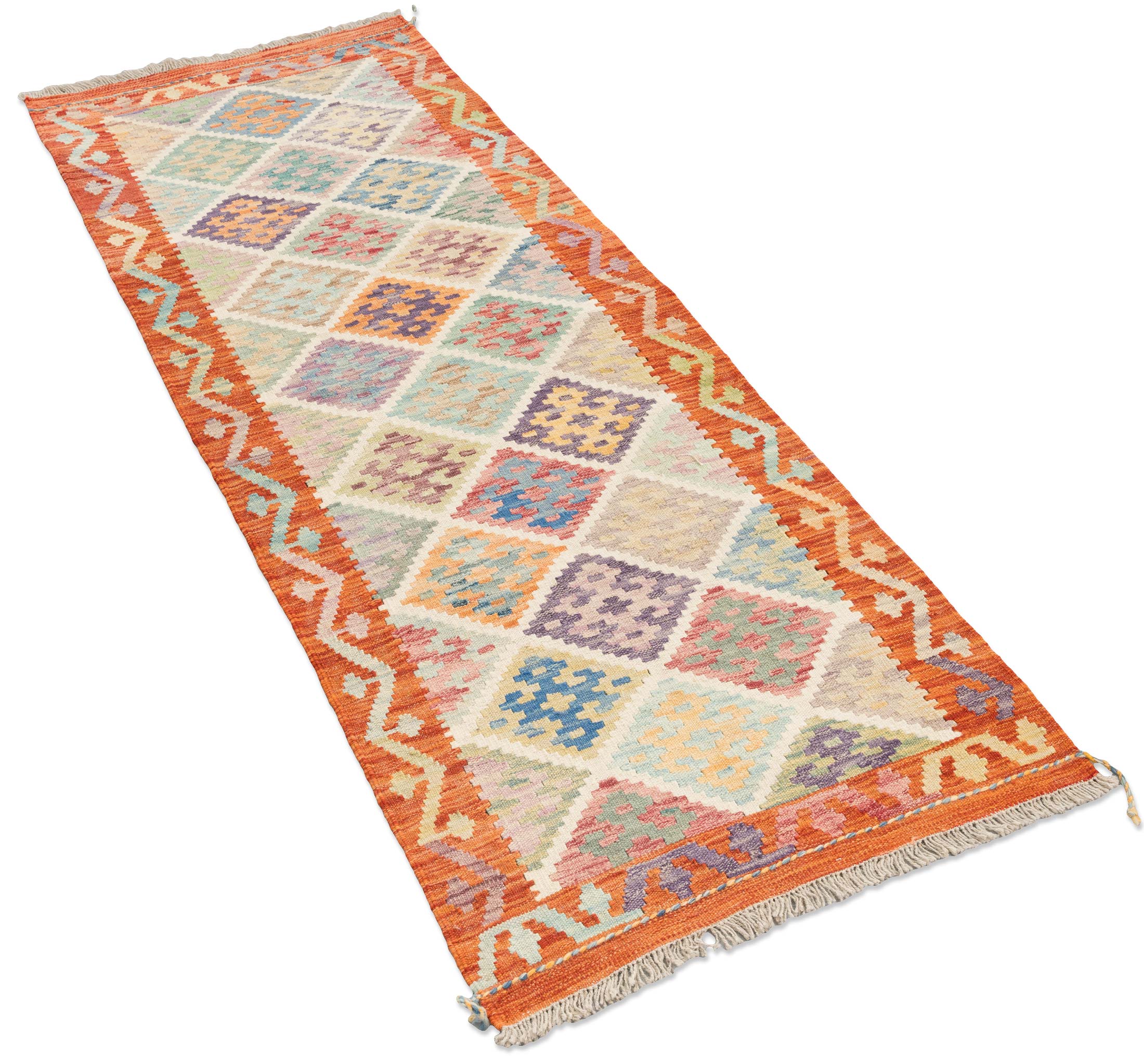 Hier präsentieren wir den einzigartigen handgewebten Ghazghar Kelim aus Afghanistan. Die Hauptfarbe dieses Teppichs ist ein warmes, erdiges Orange, das die Ränder des Designs dominiert und dem Raum eine behagliche Atmosphäre verleiht. Ergänzt wird es durch ein reiches Violett, das zusammen mit einem lebendigen Türkis und einem sanften Beige die zentralen Muster bildet. Diese farbenfrohe Kombination aus geometrischen Rautenmustern reflektiert die traditionelle Nomadenkunst und erzeugt ein ...mehr Beschreibung