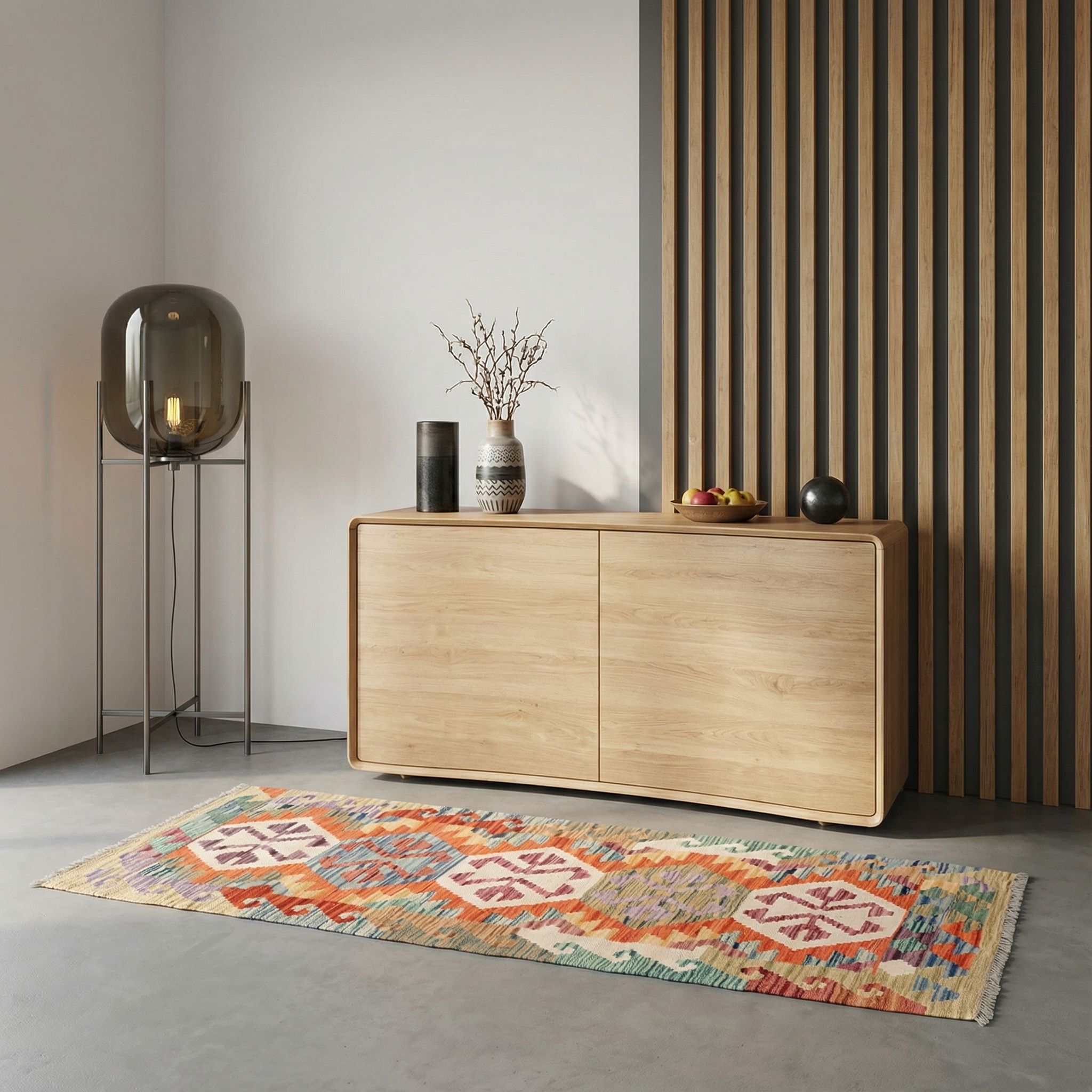 Hier präsentieren wir Ihnen den faszinierenden Ghazghar-Kelim, ein handgewebtes Meisterwerk aus Afghanistan. Die Hauptfarbe dieses Teppichs ist ein kräftiges Orange, das seine Wärme ausstrahlt und von einem sanften Beige ergänzt wird. Hinzu kommen ein lebendiges Blau und ein weiches Violett, die gemeinsam eine harmonische Farbpalette bilden. Der Teppich ist reich an Mustern, die traditionelle Nomadenmotive widerspiegeln und ihm eine lebendige und zugleich erdige Ausstrahlung ...mehr Beschreibung