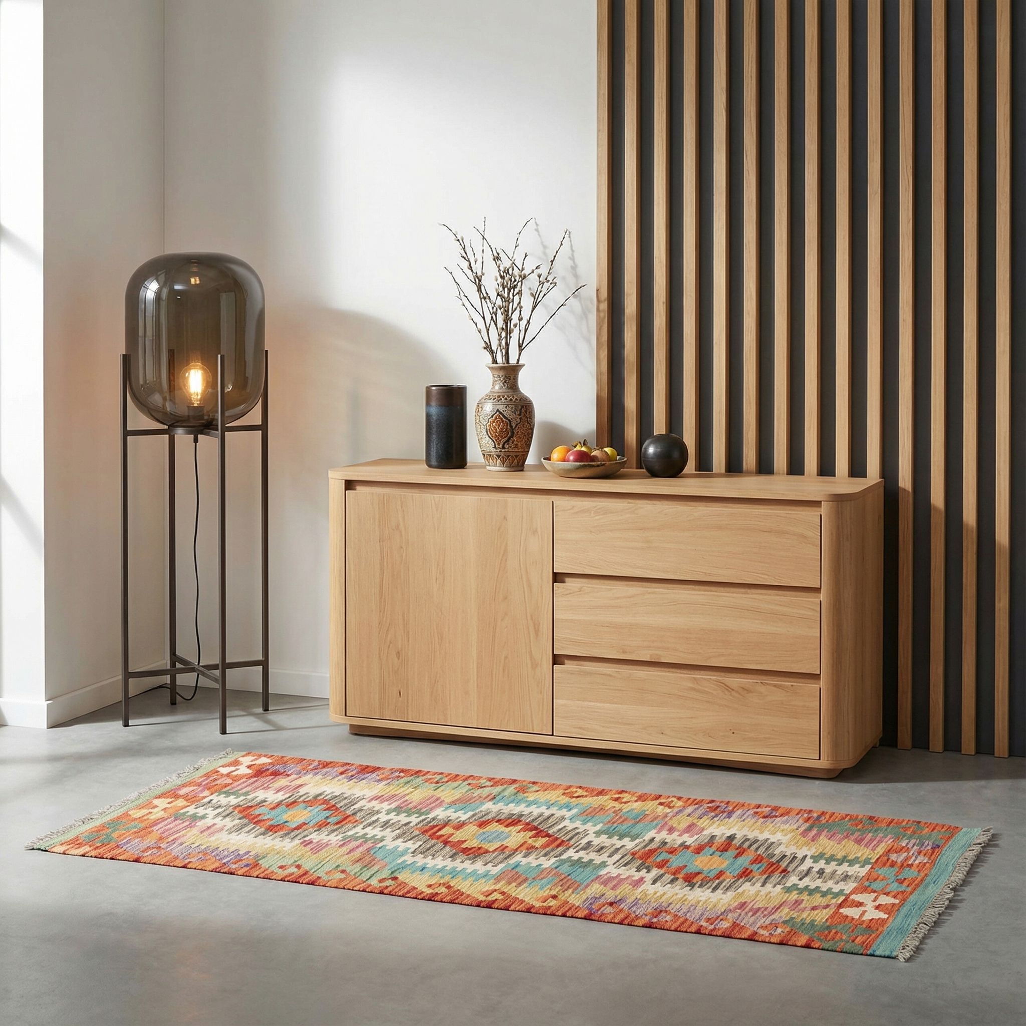 Dieser handgewebte Ghazghar-Kelim aus Afghanistan beeindruckt mit einem reichen Farbenspiel, bei dem ein warmes Orange als Hauptfarbe dominiert. Begleitet wird es von lebendigem Türkis, sanftem Beige und einem intensiven Rotton, der an Terrakotta erinnert. Diese harmonische Farbpalette wird durch fröhliche Akzente in Rosa, Gelb und Violett ergänzt, die dem Teppich eine lebendige und einladende Atmosphäre verleihen.Die geometrischen Muster, inspiriert von alten Nomadenkulturen, sind in ...