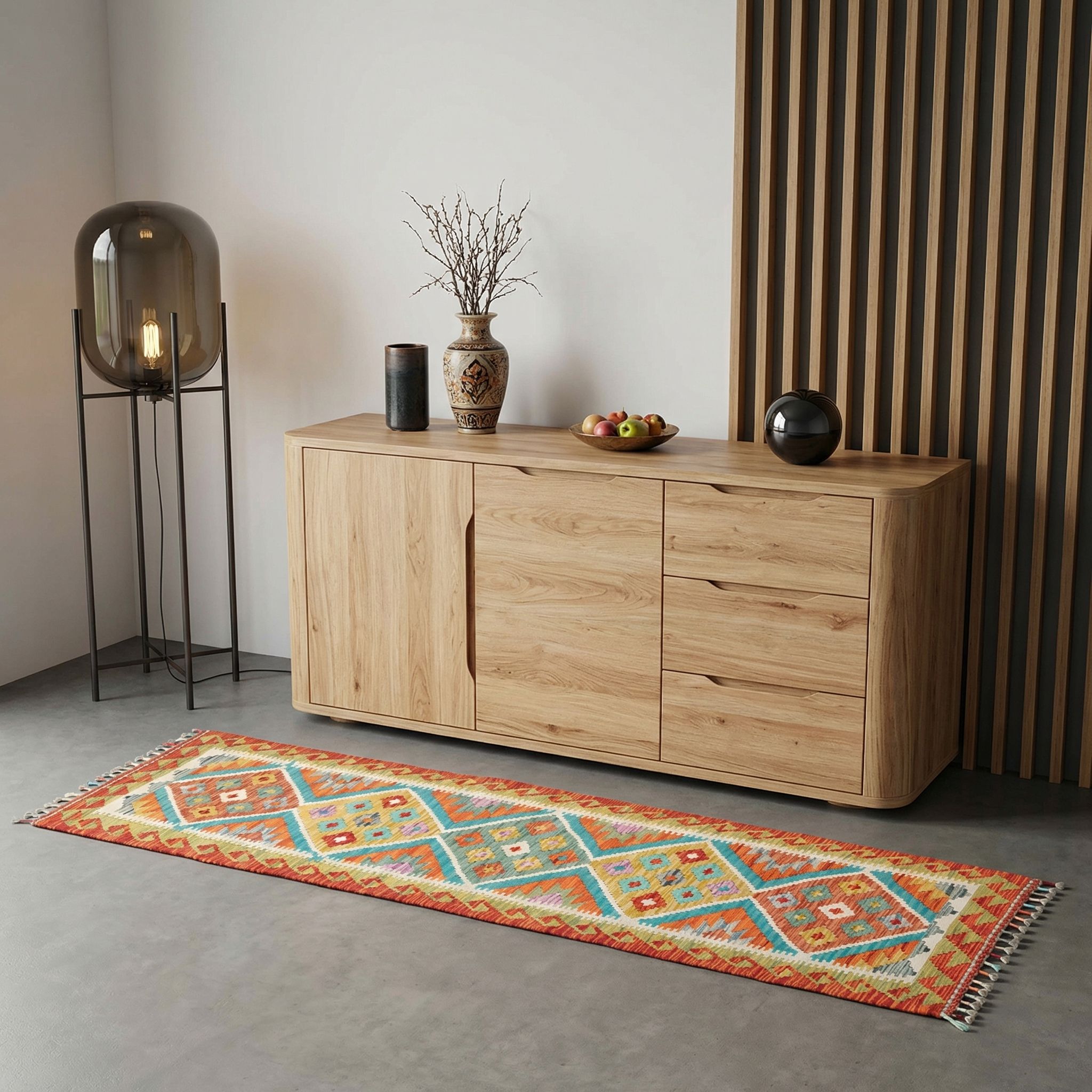 Hier präsentieren wir Ihnen einen bezaubernden Ghazghar-Kelim aus Afghanistan, der mit seiner warmen, erdigen Farbpalette besticht. Die Hauptfarbe dieses handgewebten Meisterwerks ist ein kräftiges Terrakotta-Rot, das sich harmonisch mit weiteren Haupttönen wie einem lebhaften Türkis, einem sonnigen Gelb und einem sanften Beige ergänzt. Diese Farben schaffen zusammen ein fröhliches und dennoch ausgewogenes Gesamtbild, das den Charme alter Nomadenkulturen widerspiegelt.Die ...