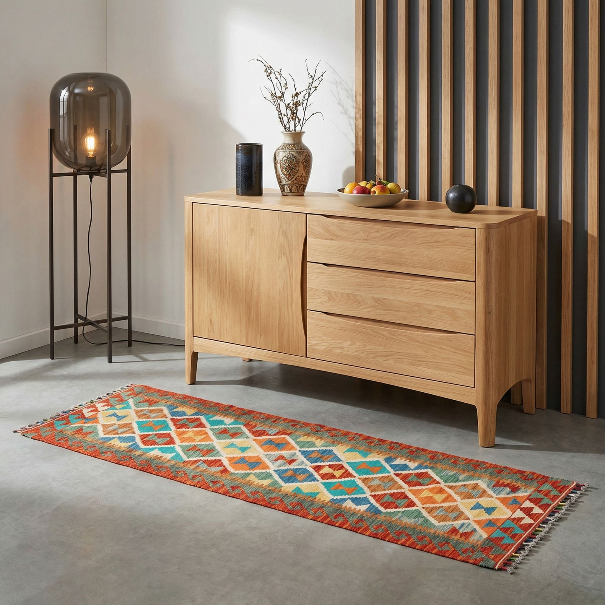 Hier präsentieren wir Ihnen einen beeindruckenden handgewebten Ghazghar-Kelim aus Afghanistan. Die Hauptfarbe dieses Teppichs ist ein lebhaftes Rot, das durch warme Orangetöne ergänzt wird. Weitere wichtige Farben sind ein sanftes Türkis und ein erdiges Beige, die in harmonischen Kontrasten zueinander stehen. Diese Farbenvielfalt wird durch fröhliche Akzente in Gelb und Blau ergänzt, die dem Kelim eine lebendige Ausstrahlung verleihen.Die geometrischen Muster erstrecken sich über den ...