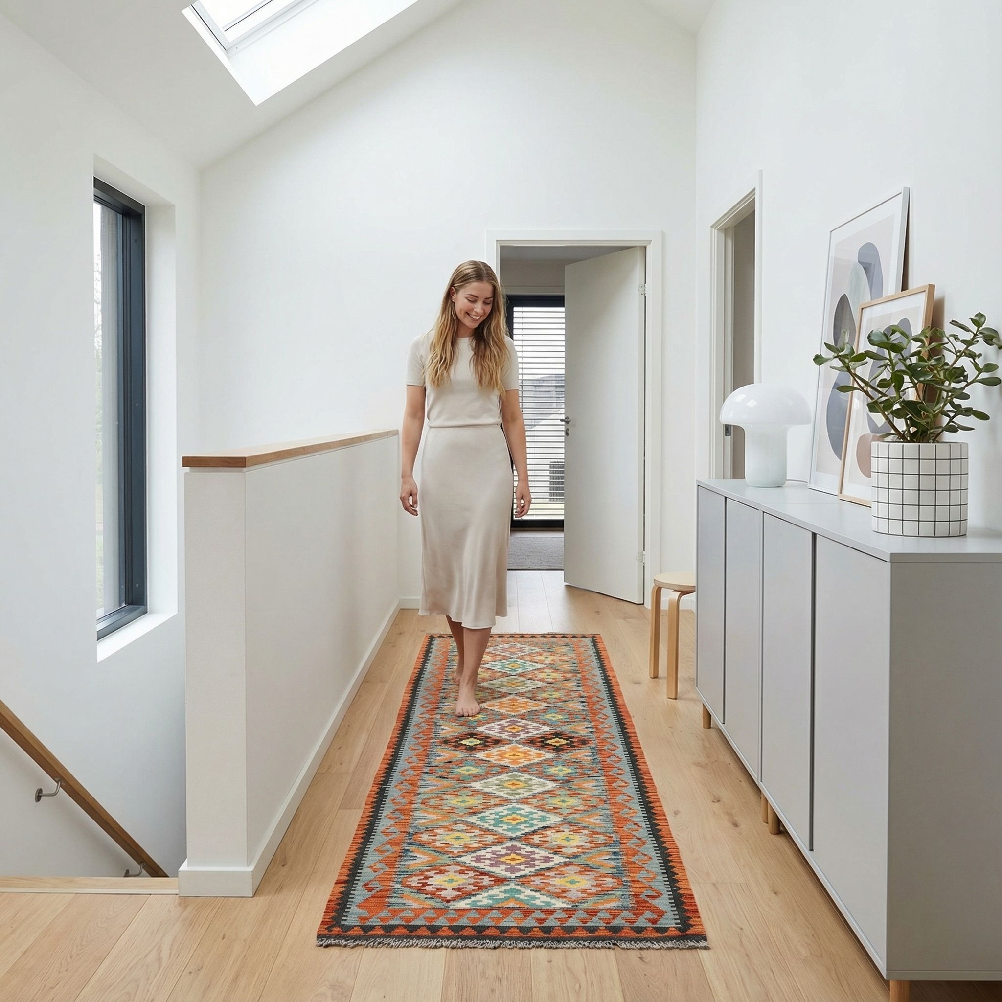 Obwohl der skandinavische Stil oft zurückhaltend ist, fungiert dieser farbenfrohe Kelim als belebender Mittelpunkt, der die nordische Kühle mit wohliger Wärme füllt. Die geometrische Klarheit der Muster passt zur Formsprache des Scandi-Designs, während die handversponnene Wolle für den unverzichtbaren „Hygge“-Faktor sorgt. Als spannender Kontrast zu weißen Wänden und hellen Hölzern bringt das Unikat Leben und Struktur in Ihr Zuhause, ohne die optische Ruhe zu stören. Mit diesem Teppich beweisen Sie Gespür für Qualität und verleihen dem minimalistischen Look eine persönliche, warme Note.
