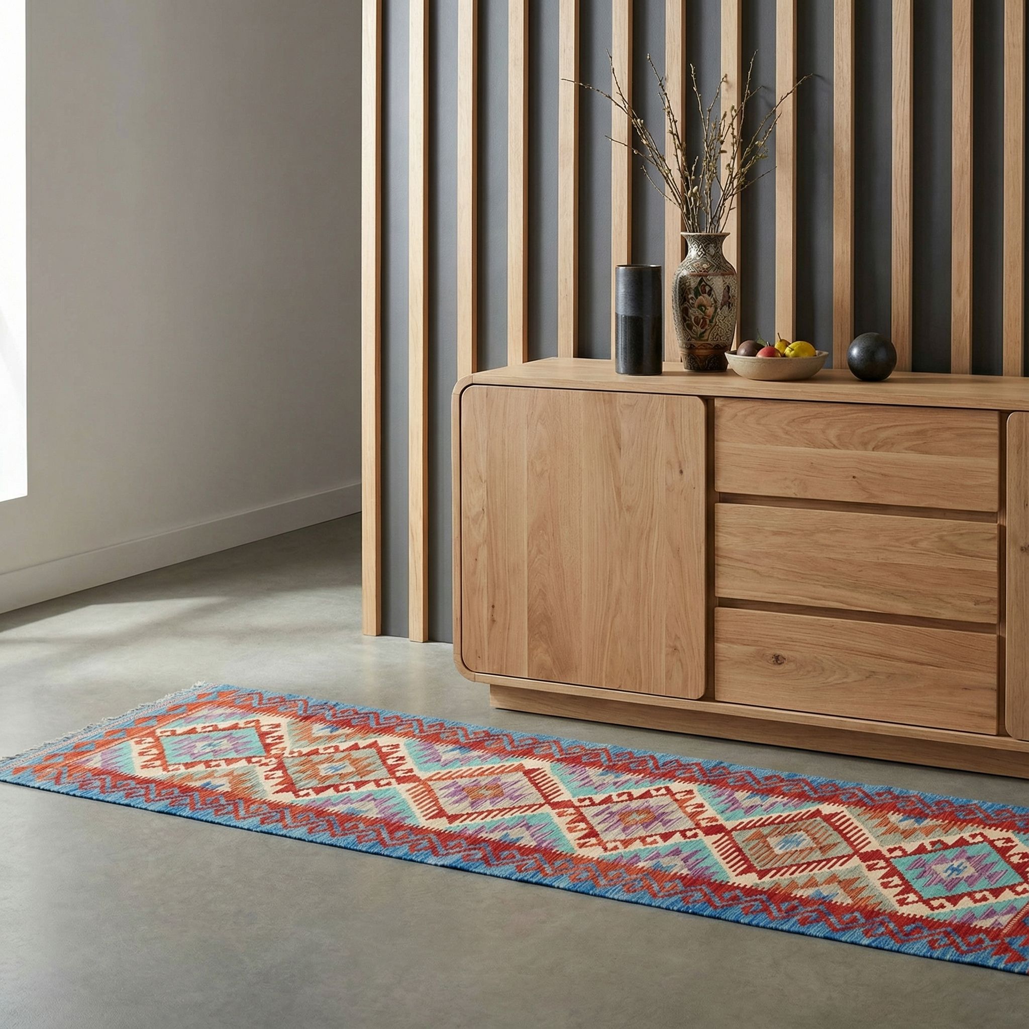 Als mutiger und warmer Farbtupfer durchbricht dieser Webkelim die oft monochrome Strenge des skandinavischen Designs und sorgt für das gewisse Extra an "Hygge". Die Verwendung hochwertigster Naturmaterialien entspricht tief dem nordischen Wunsch nach Nachhaltigkeit und Authentizität im Wohnraum. Nutzen Sie diesen Läufer als gezielten Stilbruch, um einem cleanen Raum mehr Persönlichkeit und lebendige Struktur zu verleihen. Die handgewebte Qualität sorgt dabei für eine warme Haptik, die kalte Wintertage sofort gemütlicher macht.