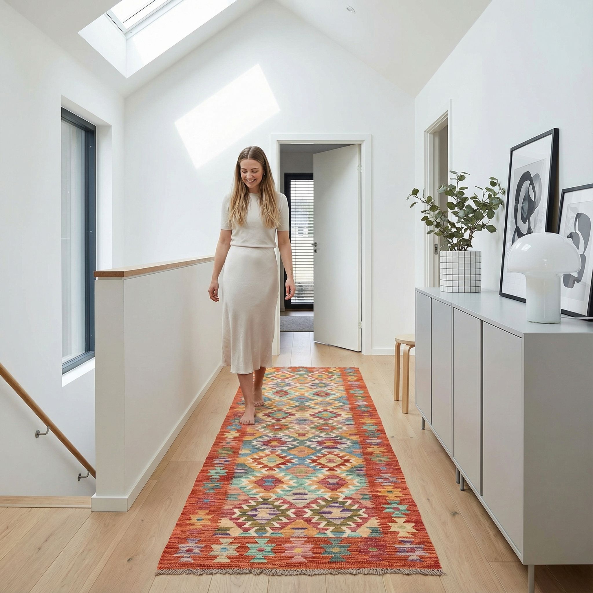 Hier präsentieren wir Ihnen einen beeindruckenden handgewebten Kelim aus Afghanistan, der durch seine warme und einladende Farbgebung besticht. Die Hauptfarbe ist ein lebhaftes Rot, das durch Schattierungen von Orange, Blau und Grün ergänzt wird. Diese harmonischen Farben schaffen ein lebendiges und dennoch ausgewogenes Gesamtbild. Der Teppich zeigt traditionelle Nomadenmuster, die in einem komplexen geometrischen Design angeordnet sind, das an die reiche Handwerkskunst Afghanistans ...mehr Beschreibung