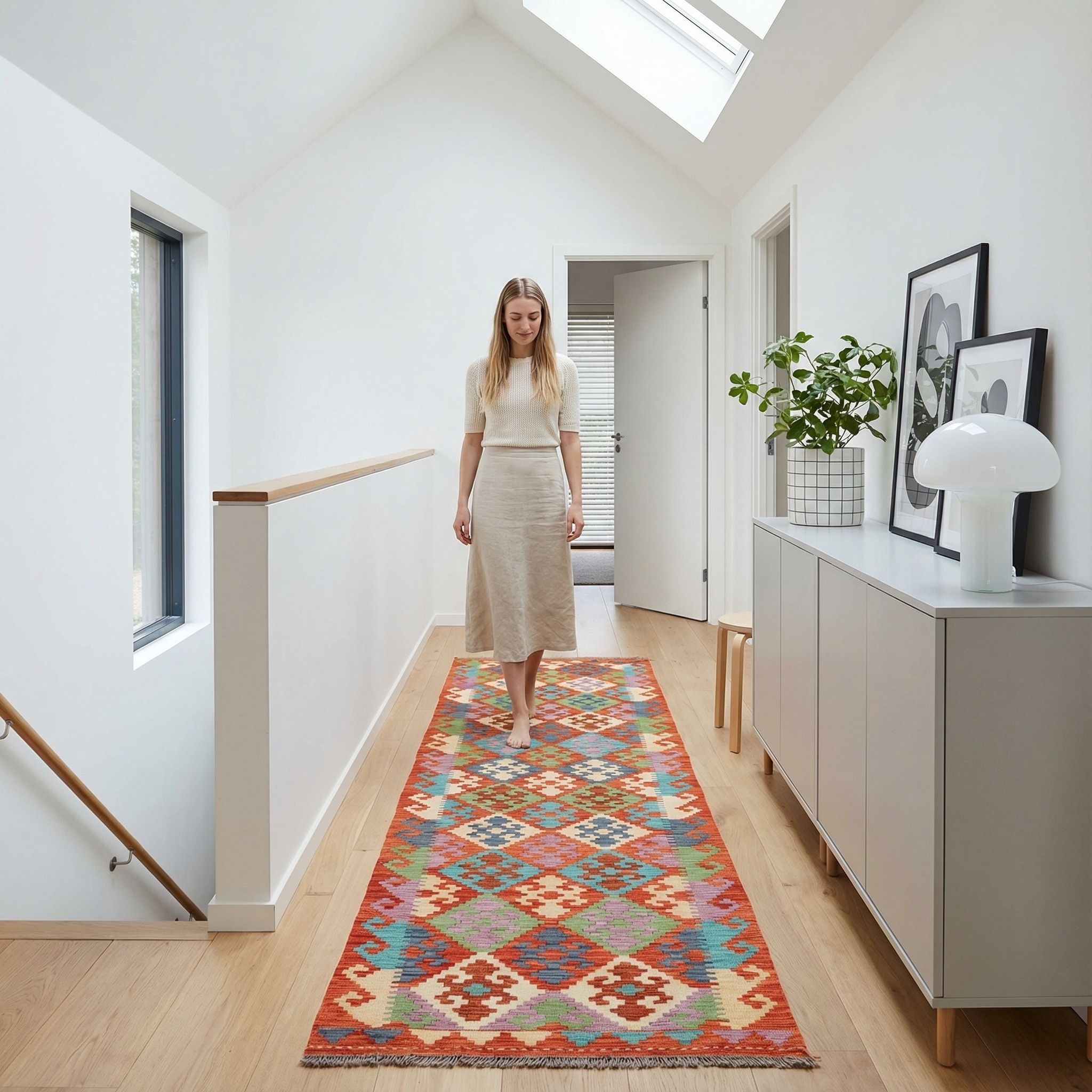 Dieser handgewebte Kelim aus der renommierten Mesgarzadeh-Kollektion präsentiert sich in einem intensiven Ziegelrot als Hauptfarbe, die dem Teppich eine warme und einladende Ausstrahlung verleiht. Begleitet wird diese von einem weichen Creme, einem lebendigen Grün und einem sanften Violett, die harmonisch miteinander verschmelzen und dem Teppich ein buntes, fröhliches Gesamtbild verleihen.Die Musterung des Kelims zeigt klassische Nomadenmotive mit geometrischen Formen, die in einem sich ...