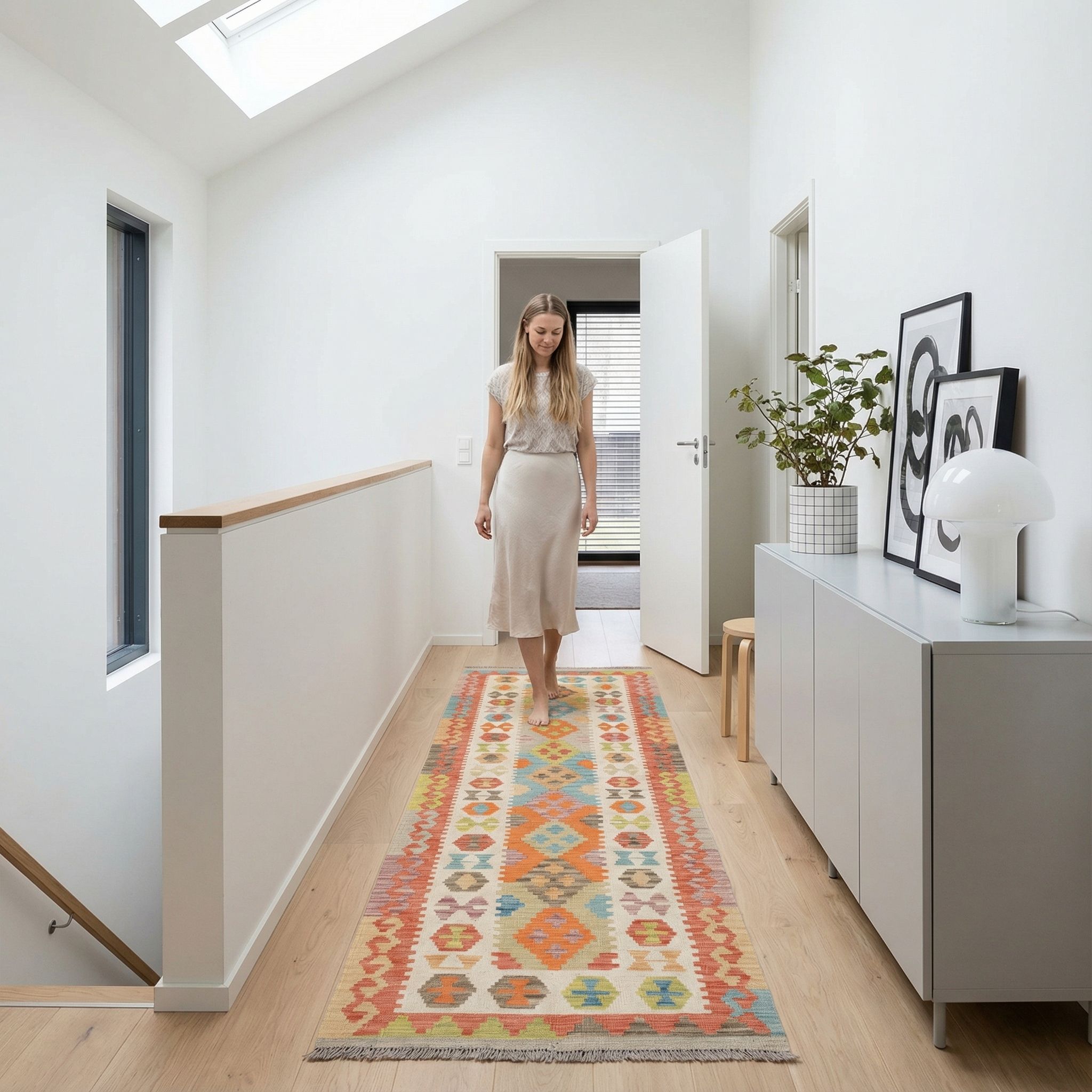 In einem cleanen, zeitgenössischen Ambiente fungiert dieser Kelim als raffinierter Weichzeichner, der die Strenge moderner Linienführung stilvoll aufbricht. Die geometrischen Muster korrespondieren spannend mit minimalistischen Möbeln, während die Naturfarben Wärme in kühle Farbkonzepte aus Weiß oder Grau bringen. Als hochwertiges Einzelstück beweist der Teppich, dass traditionelles Handwerk und modernes Design eine faszinierende Symbiose eingehen können. Er verleiht dem Raum Charakter und Bodenständigkeit, ohne dabei die moderne Ästhetik zu überladen.