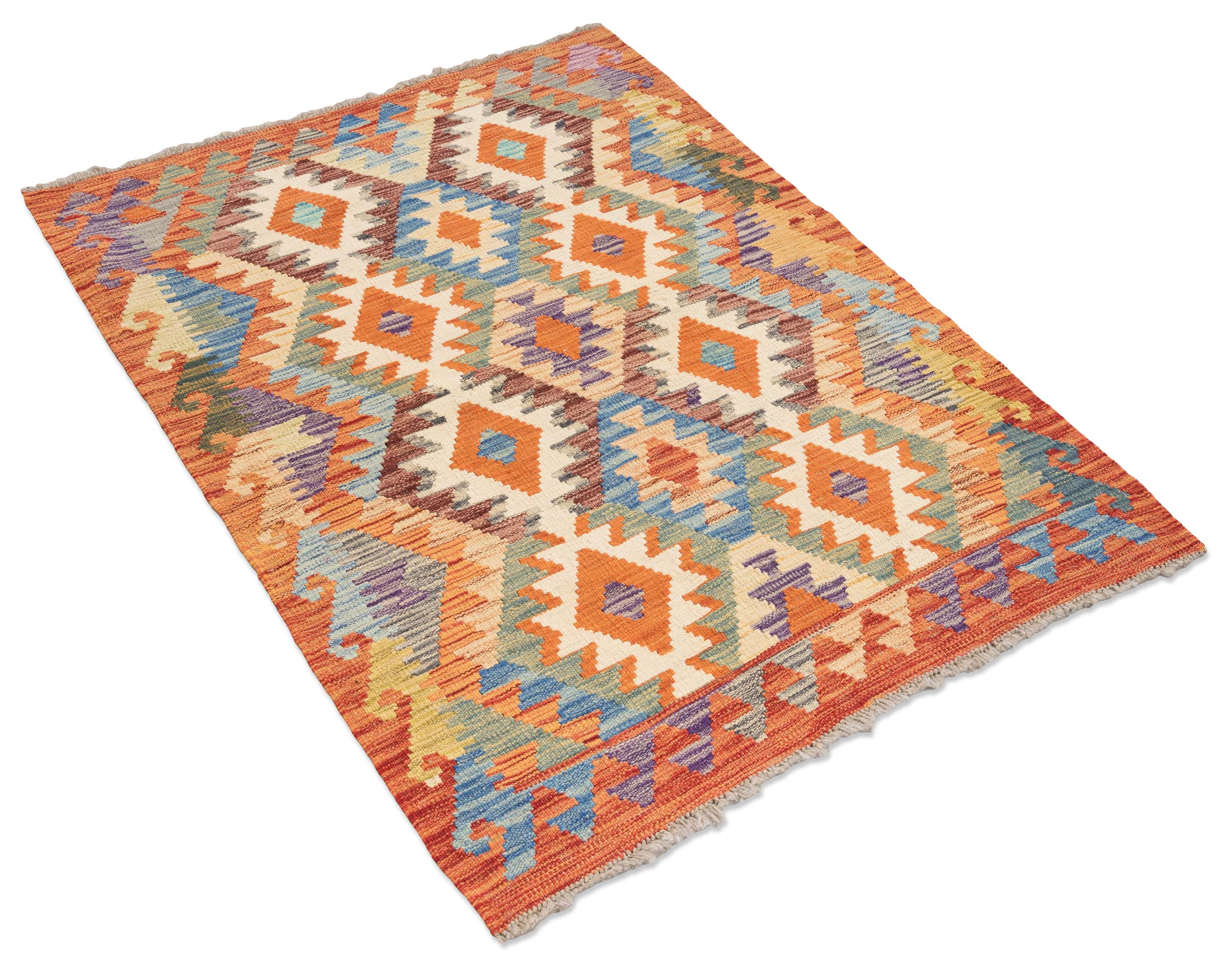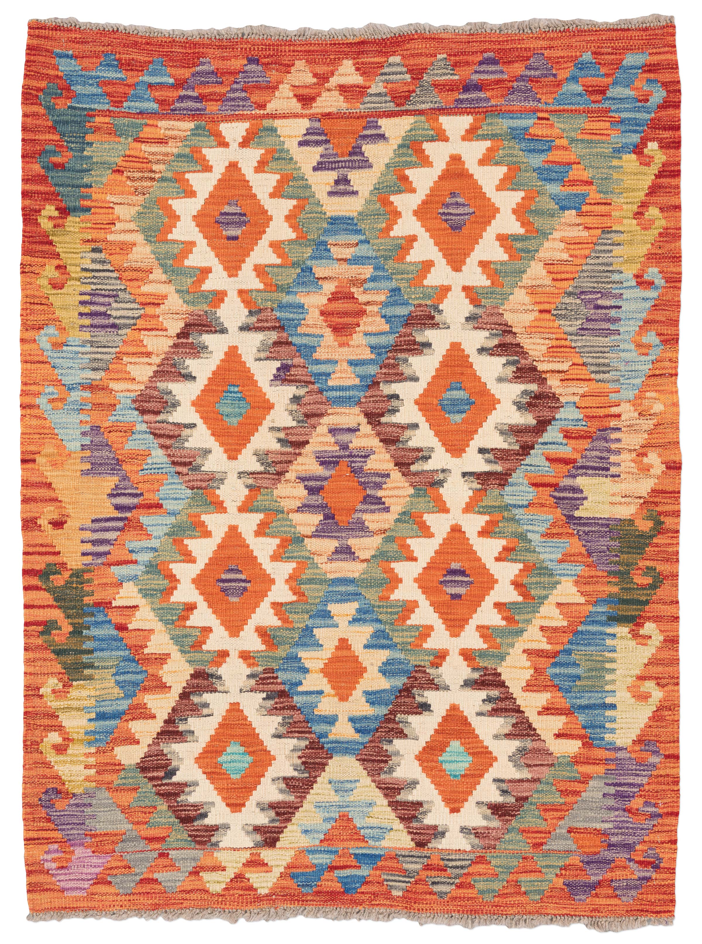 Hier präsentieren wir Ihnen den beeindruckenden handgewebten Ghazghar-Kelim aus Afghanistan, der mit seinem leuchtenden Farbspiel und traditionellen Mustern begeistert. Die Hauptfarbe dieses Kelims ist ein warmes Rostrot, das die gesamte Komposition dominiert. Ergänzt wird es durch ein lebendiges Blau, ein sanftes Cremeweiß und erdige Brauntöne. Diese Farben harmonieren perfekt miteinander und verleihen dem Teppich eine warme, einladende Ausstrahlung.