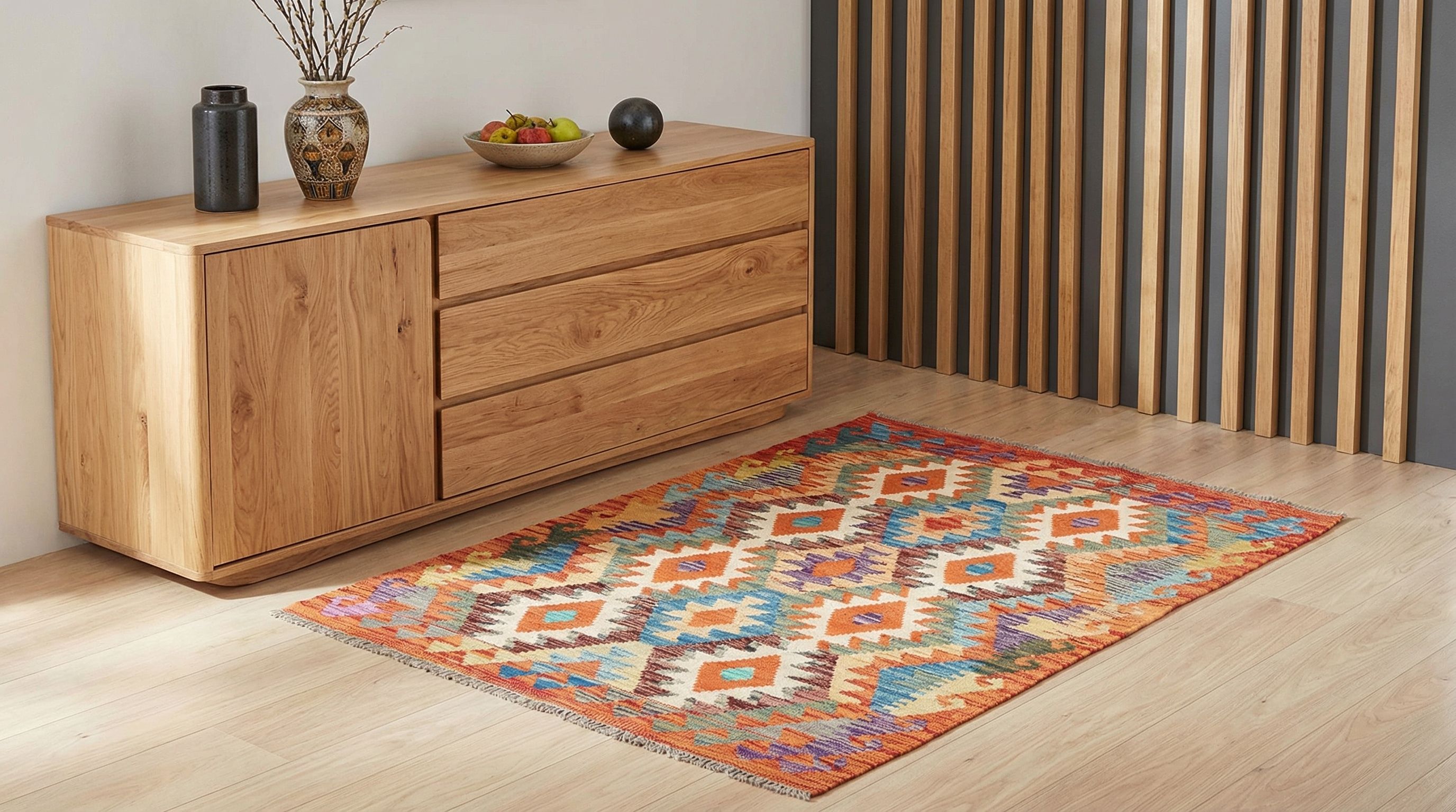 Im skandinavischen Stil dient dieser farbenfrohe Kelim als wärmender Hygge-Garant, der die Dominanz von Weiß- und Grautönen stilvoll durchbricht. Das geometrische Design fügt sich überraschend gut in die geradlinige nordische Formensprache ein, während die natürlichen Materialien für die nötige haptische Wärme sorgen. Er fungiert als gemütliche Insel auf hellen Holzböden und verleiht dem minimalistischen Raum Charakter, ohne ihn zu überladen. Die hohe Qualität der handversponnenen Wolle trifft dabei genau den skandinavischen Anspruch an langlebiges, funktionales und ehrliches Design.