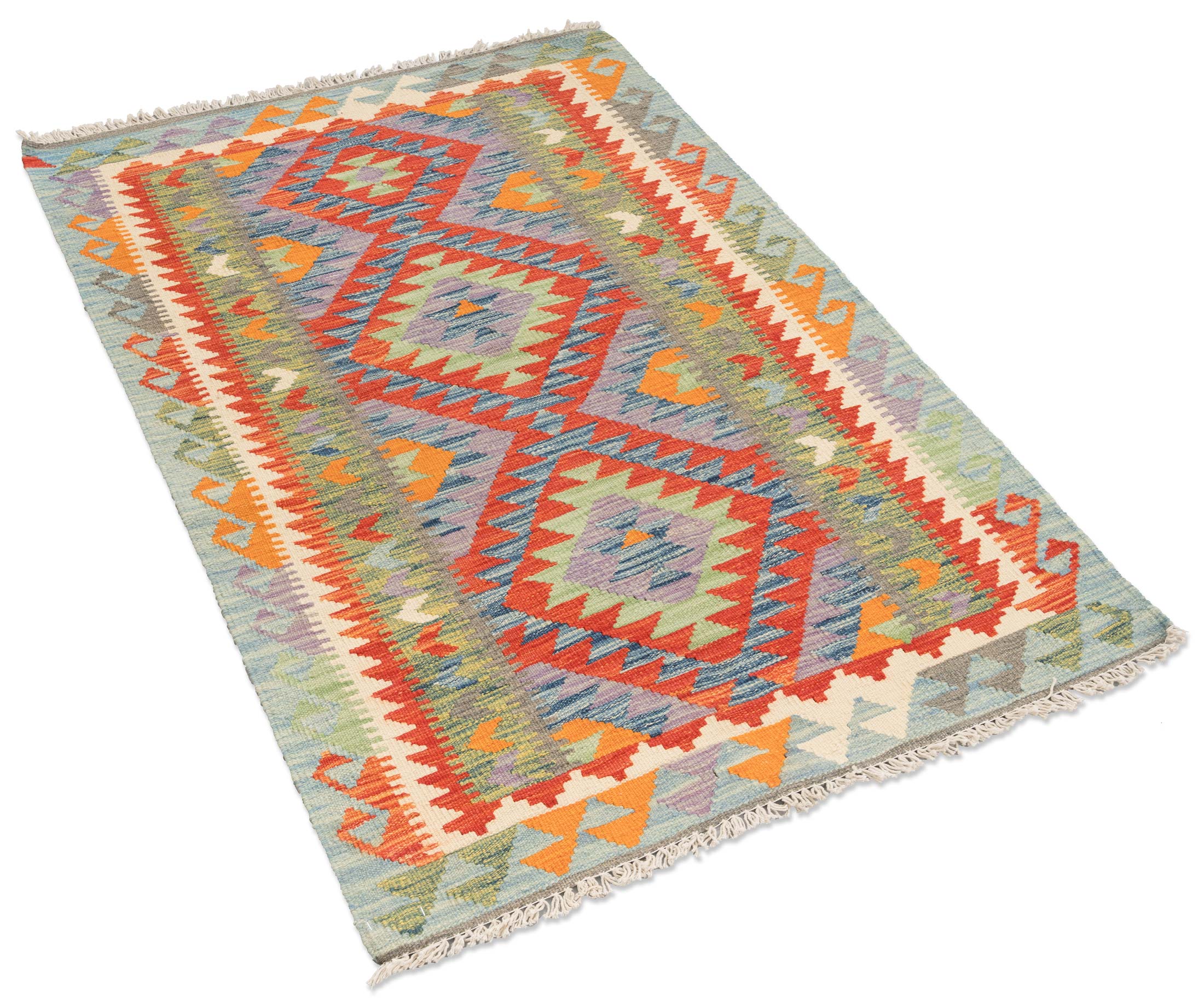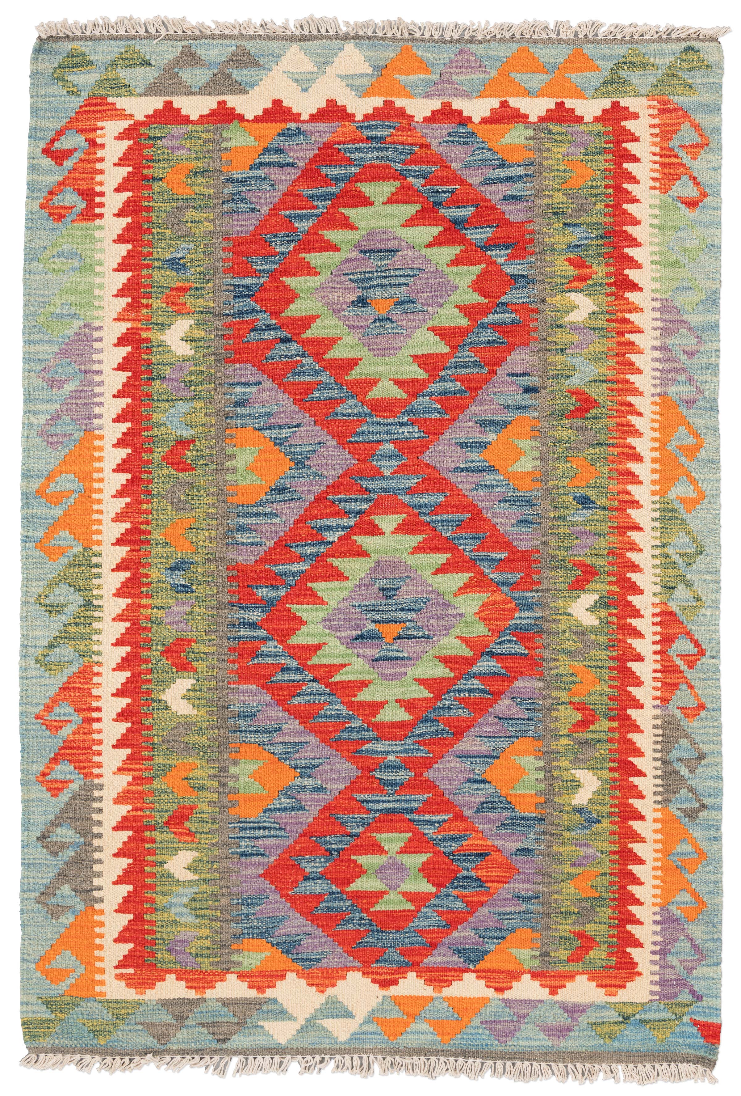 Hier präsentieren wir den handgewebten Kelim Ghazghar aus Afghanistan, der durch seine lebendige Farbpalette und traditionelle Muster besticht. Die Hauptfarbe dieses beeindruckenden Teppichs ist ein leuchtendes Rot, das sofort ins Auge fällt. Ergänzt wird diese durch ein sanftes Grün, ein warmes Orange und ein beruhigendes Blau. Diese harmonische Kombination aus Naturfarben verleiht dem Kelim seine unverwechselbare Ausstrahlung.Der Teppich zeigt ein reiches Spektrum an geometrischen ...