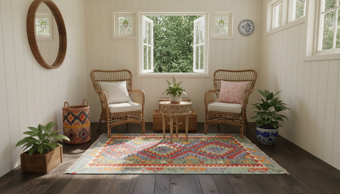 Handgewebte Kelims werden auf einem Webstuhl hergestellt, welcher zuerst aus horizontalen aufgespannten Fäden (der Kette) besteht. Die Kette kann aus Baumwolle oder Schafwolle oder in seltenen Fällen aus Seide bestehen. Durch die Kette wird dann vertikal (der Schuss) ab wechselnd oberhalb und unterhalb der Kette durchgezogen. Der Webvorgang ist relativ einfach, aber er erfordert Geschick und Erfahrung, um ein gleichmäßiges und kunstvolles Bildmuster zu erzeugen. Die Qualität und ...mehr Infos zur Handarbeit