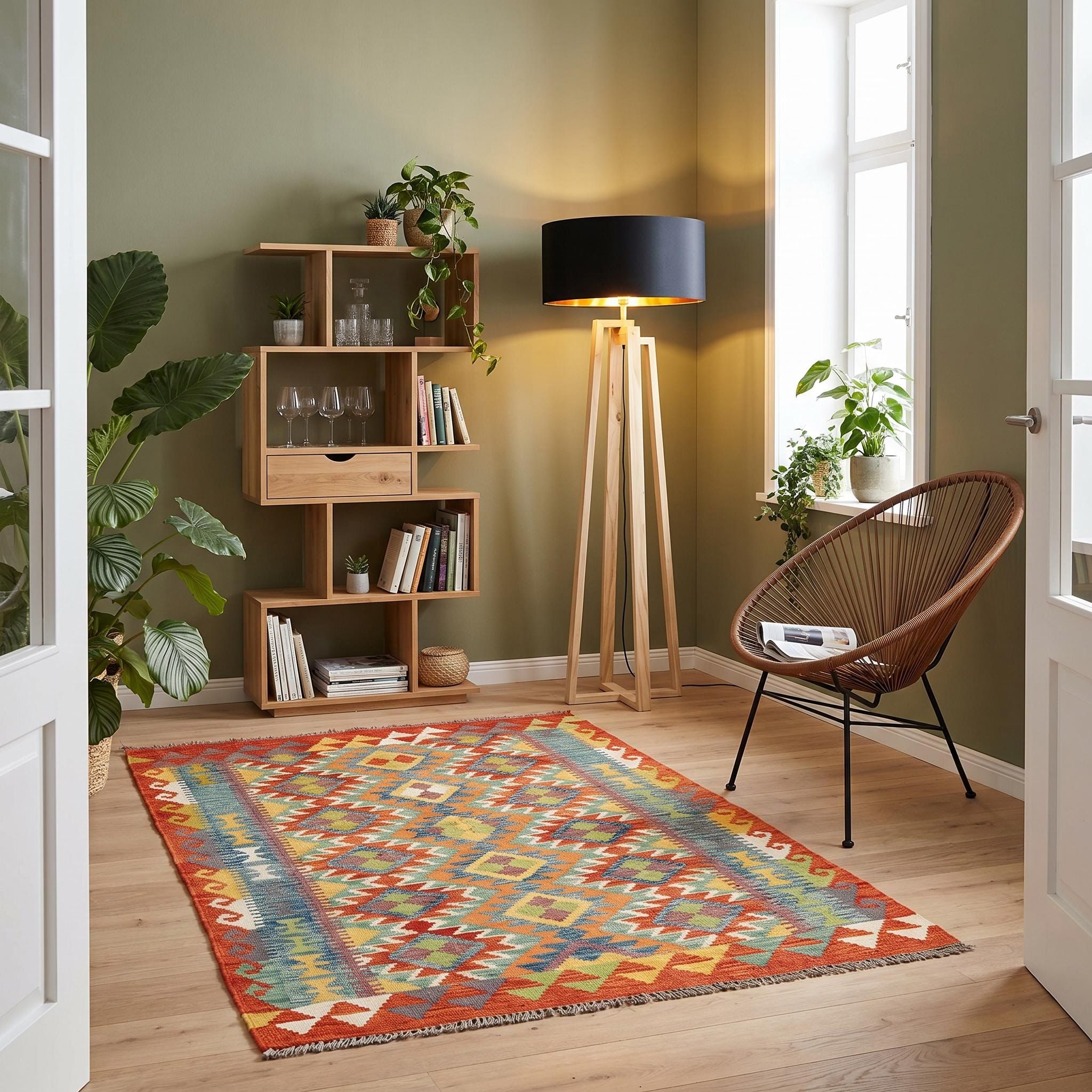 Die rustikale Anmutung der handversponnenen Schafwolle harmoniert wunderbar mit den natürlichen Holzoberflächen und Leinenstoffen des New-Country-Styles. Mit seinem warmen, erdigen Colorit schafft der Kelim sofort eine behagliche Atmosphäre, die Ihrem Landhaus-Look Frische und Bodenständigkeit verleiht. Die lebendigen, aber natürlichen Farben setzen einen fröhlichen Kontrast zu hellen Möbeln und unterstreichen den gemütlichen, familiären Charakter des Raumes. Als handgewebtes Original bringt er genau jene Wertigkeit und Tradition mit, die ein modernes Landhaus-Interieur so einladend und authentisch macht.