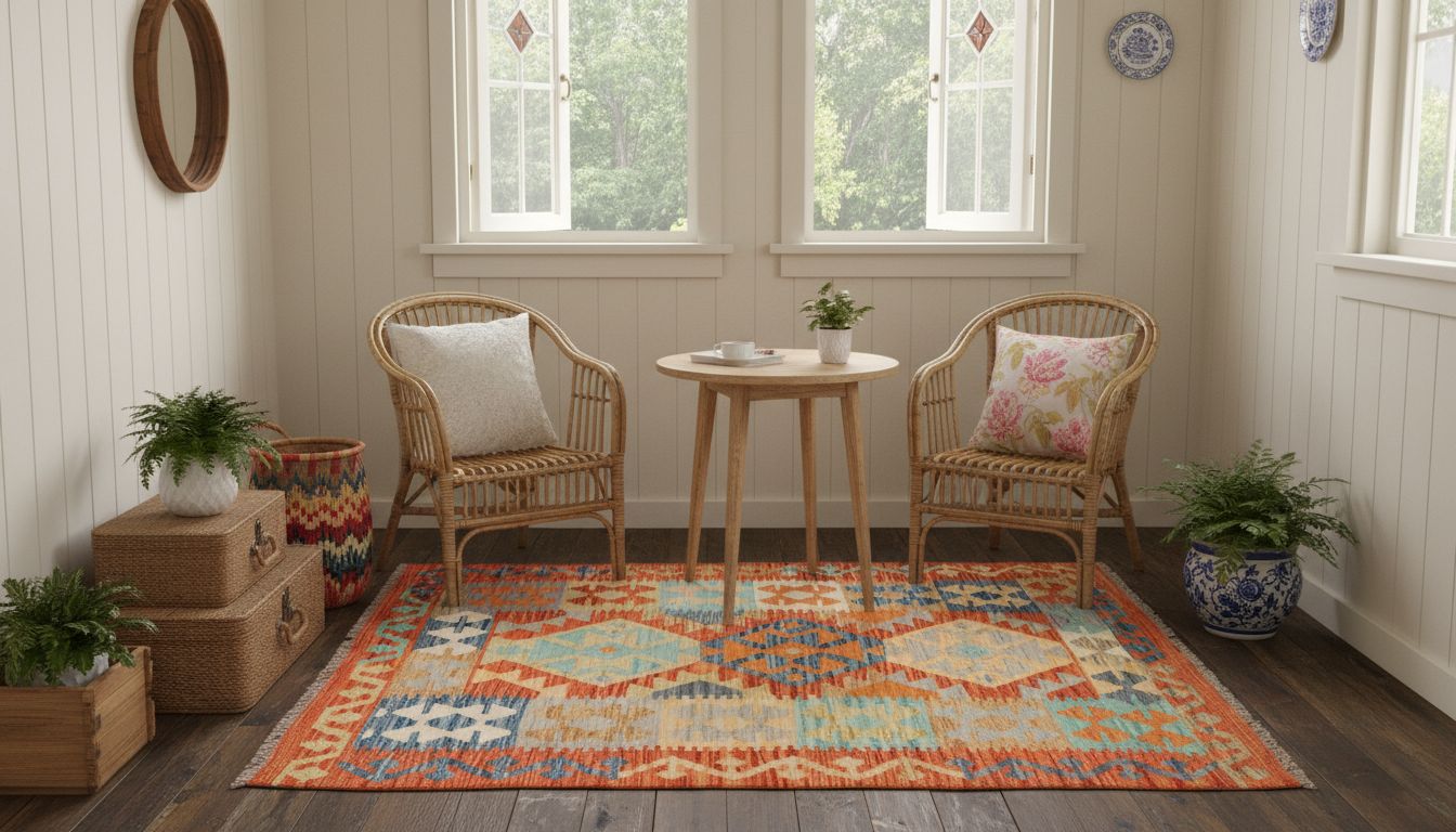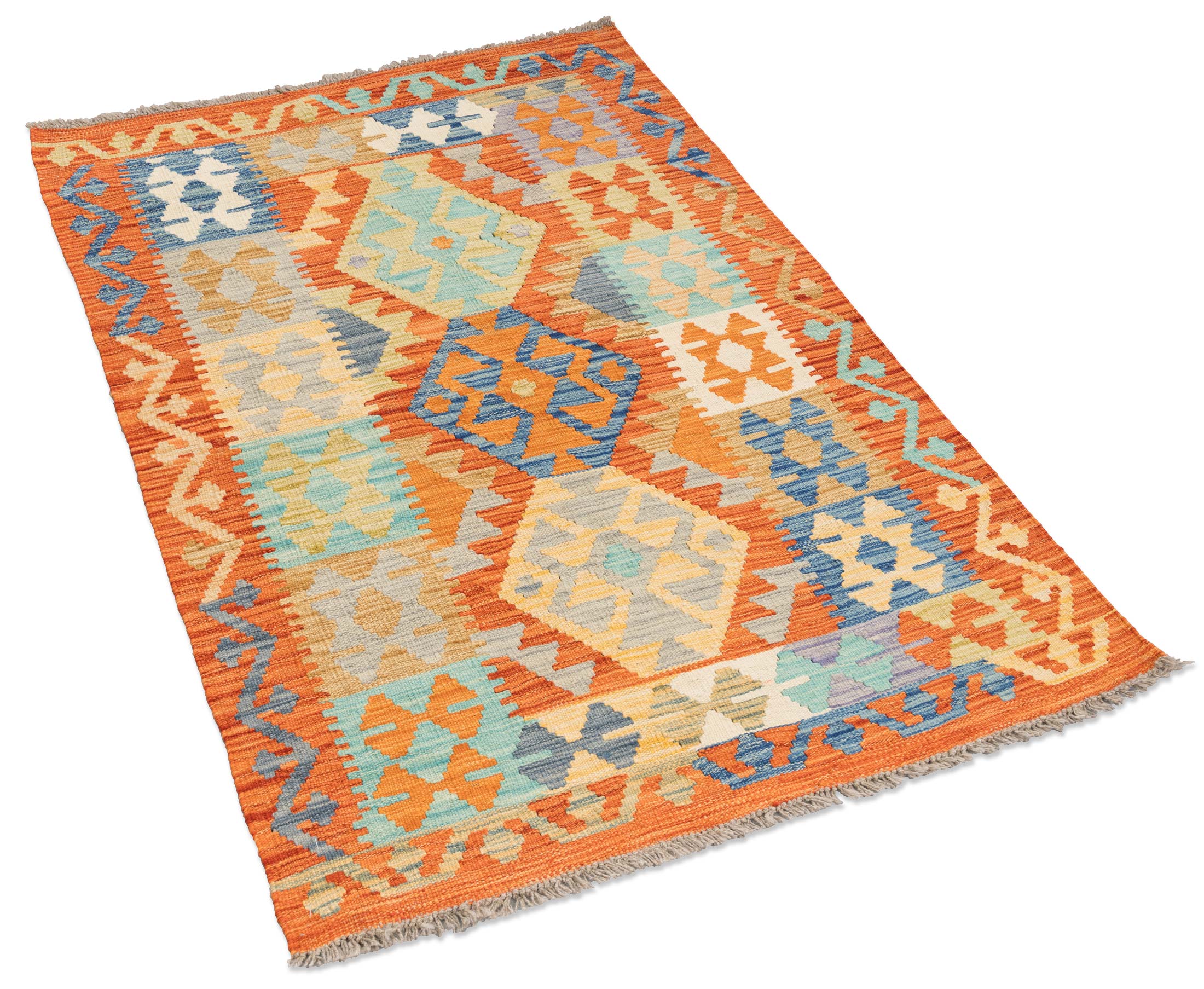 Hier präsentieren wir den faszinierenden handgewebten Kelim Ghazghar aus Afghanistan. Die Hauptfarbe dieses einzigartigen Teppichs ist ein kräftiges Rostrot, das Wärme und Lebendigkeit in jeden Raum bringt. Begleitend dazu finden sich ein sanftes Türkis, ein tiefes Blau und ein warmes Beige, die harmonisch miteinander interagieren und die traditionellen Nomadenmuster lebhaft zur Geltung bringen.Dieser Teppich besticht durch seine geometrischen Muster, die in klaren, kräftigen Linien ...
