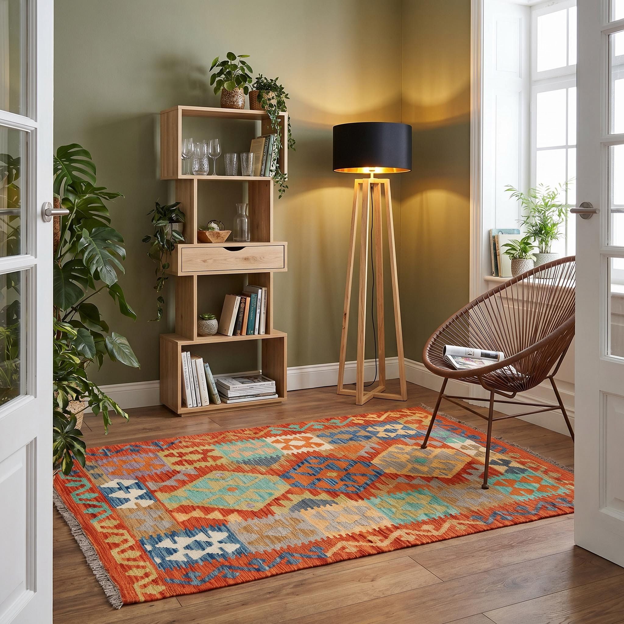 In einem modernen, reduzierten Wohnambiente setzt dieser farbenfrohe Kelim als bewusster Stilbruch einen spannenden und kunstvollen Akzent. Die geometrische Klarheit der Schlitzkelim-Technik korrespondiert hervorragend mit geradlinigem Design, während die warme Wolle die Strenge des Raumes sanft aufbricht. Das erdige Colorit verleiht kühlen Contemporary-Interieurs sofortige Behaglichkeit, ohne dabei grell oder überladen zu wirken. So verbinden Sie zeitgenössische Eleganz mit der Seele traditioneller Handwerkskunst zu einem einzigartigen und hochwertigen Raumgefühl.
