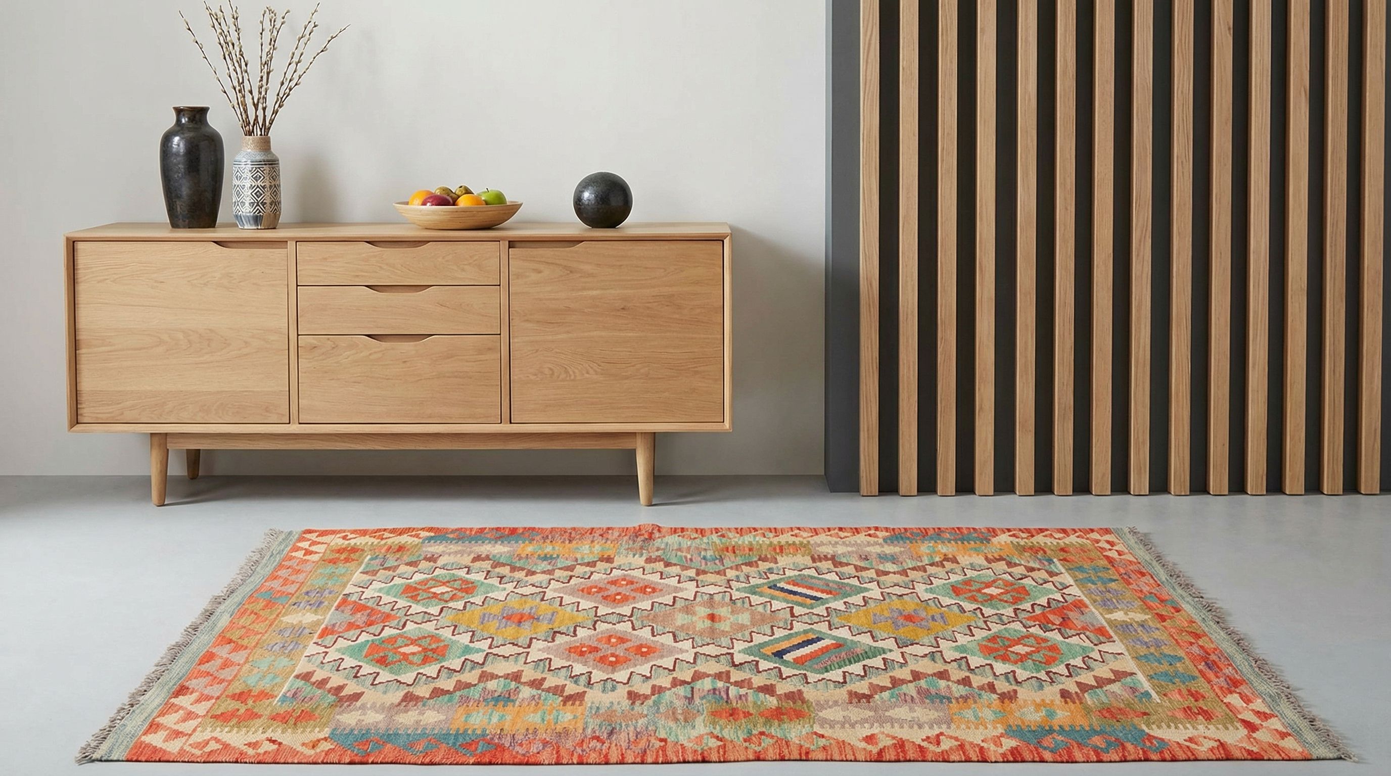 In der reduzierten nordischen Einrichtung sorgt dieser farbenfrohe Kelim für die unverzichtbare Portion „Hygge“ und durchbricht sanft die Dominanz von Weiß und hellem Holz. Die natürliche Textur der handversponnenen Wolle bringt Wärme und haptische Qualität in den Raum, was den skandinavischen Look erst richtig wohnlich macht. Die klaren geometrischen Rautenmuster passen hervorragend zur nordischen Formensprache, setzen aber gleichzeitig einen lebendigen, farblichen Kontrapunkt. Mit diesem hochwertigen Unikat beweisen Sie Mut zur Individualität und schaffen eine einladende Insel der Gemütlichkeit inmitten kühler Eleganz.
