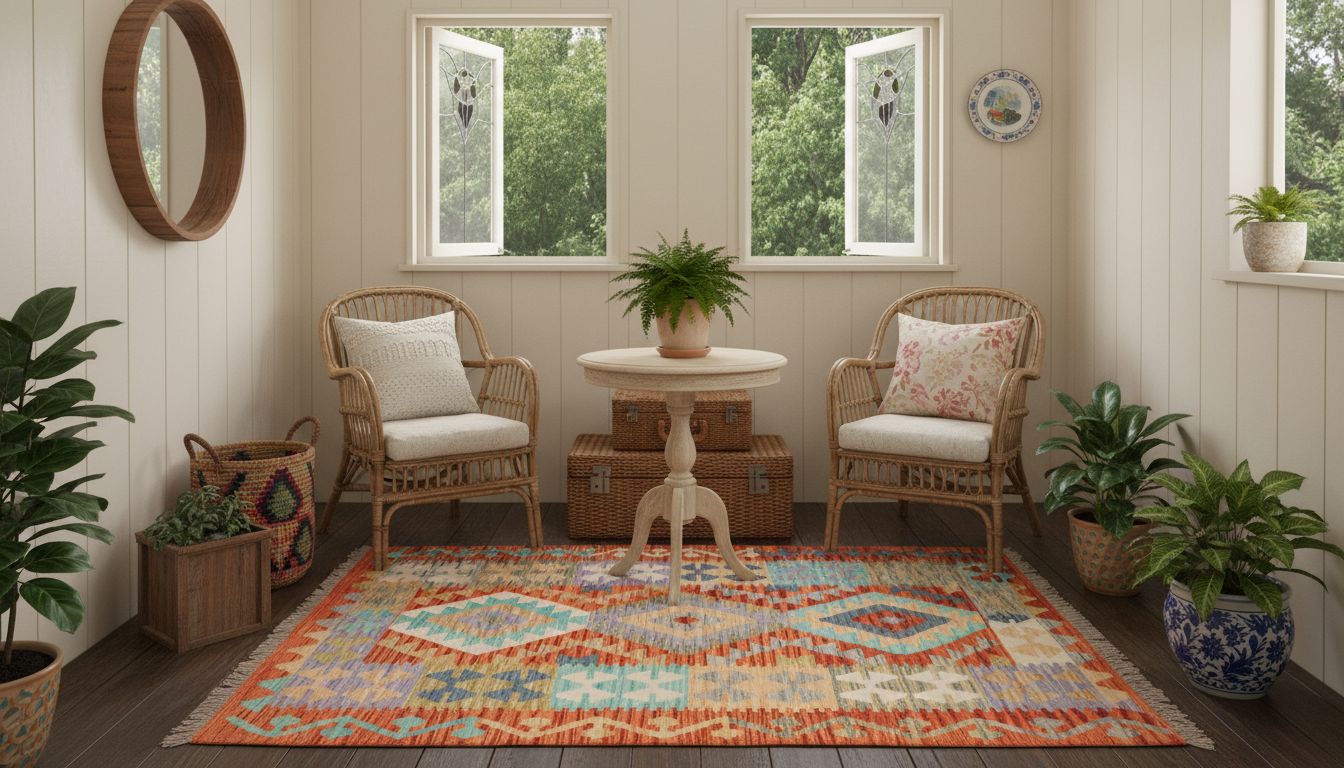 Handgewebte Kelims werden auf einem Webstuhl hergestellt, welcher zuerst aus horizontalen aufgespannten Fäden (der Kette) besteht. Die Kette kann aus Baumwolle oder Schafwolle oder in seltenen Fällen aus Seide bestehen. Durch die Kette wird dann vertikal (der Schuss) ab wechselnd oberhalb und unterhalb der Kette durchgezogen. Der Webvorgang ist relativ einfach, aber er erfordert Geschick und Erfahrung, um ein gleichmäßiges und kunstvolles Bildmuster zu erzeugen. Die Qualität und ...mehr Infos zur Handarbeit