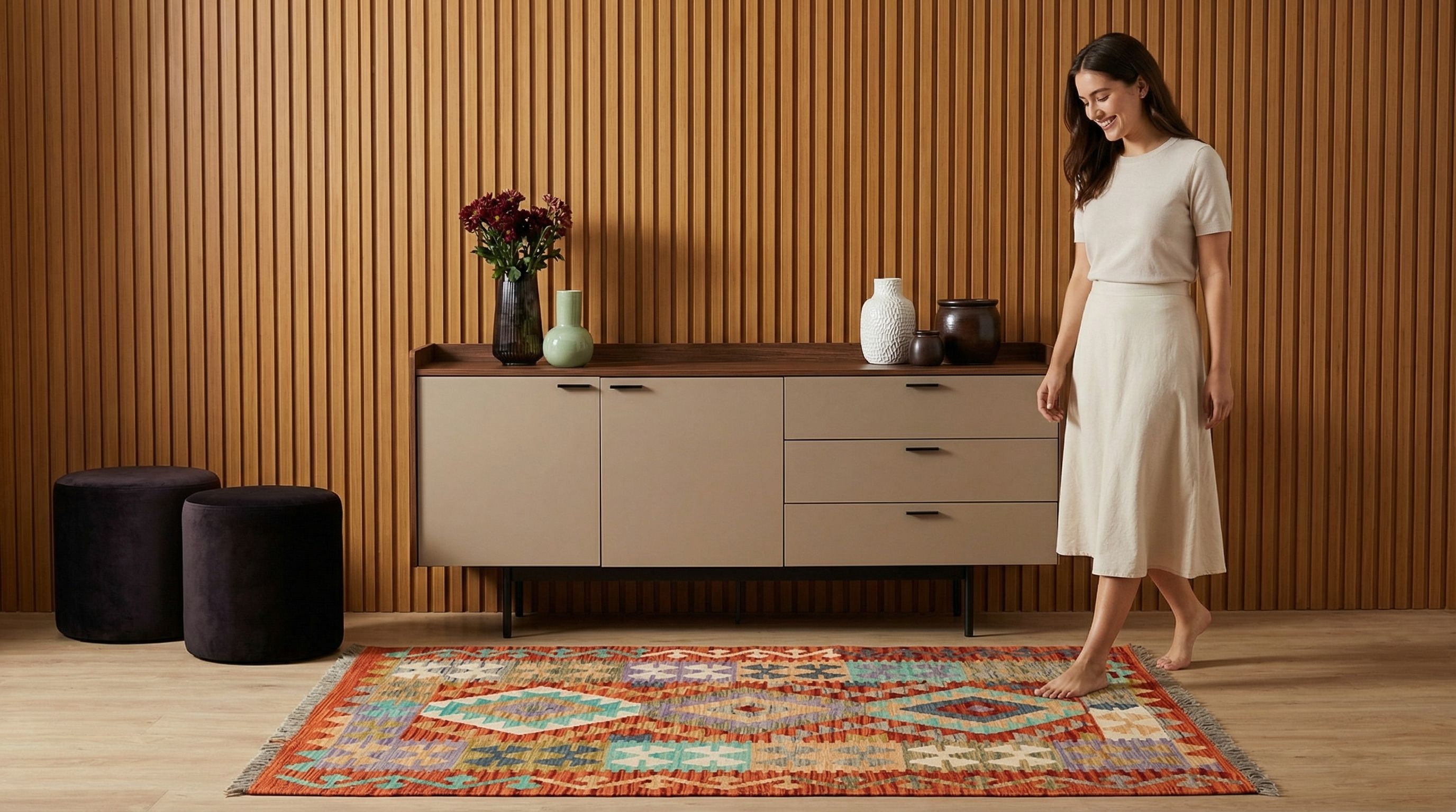 In einem modernen, reduzierten Wohnambiente setzt dieser farbenfrohe Kelim als bewusster Stilbruch ein aufregendes, designorientiertes Statement. Die geometrischen Muster der Schlitzkelim-Technik korrespondieren spannend mit den klaren Linien moderner Möbel, während die warme Schafwolle die Strenge des Contemporary-Looks sanft aufbricht. Er verleiht dem Raum sofort Seele und Charakter, ohne dabei grell zu wirken oder die zeitgenössische Eleganz zu stören. So verbinden Sie aktuelles Design mit zeitloser Handwerkskunst zu einer kuratierten Wohnatmosphäre, die höchste Qualität beweist.