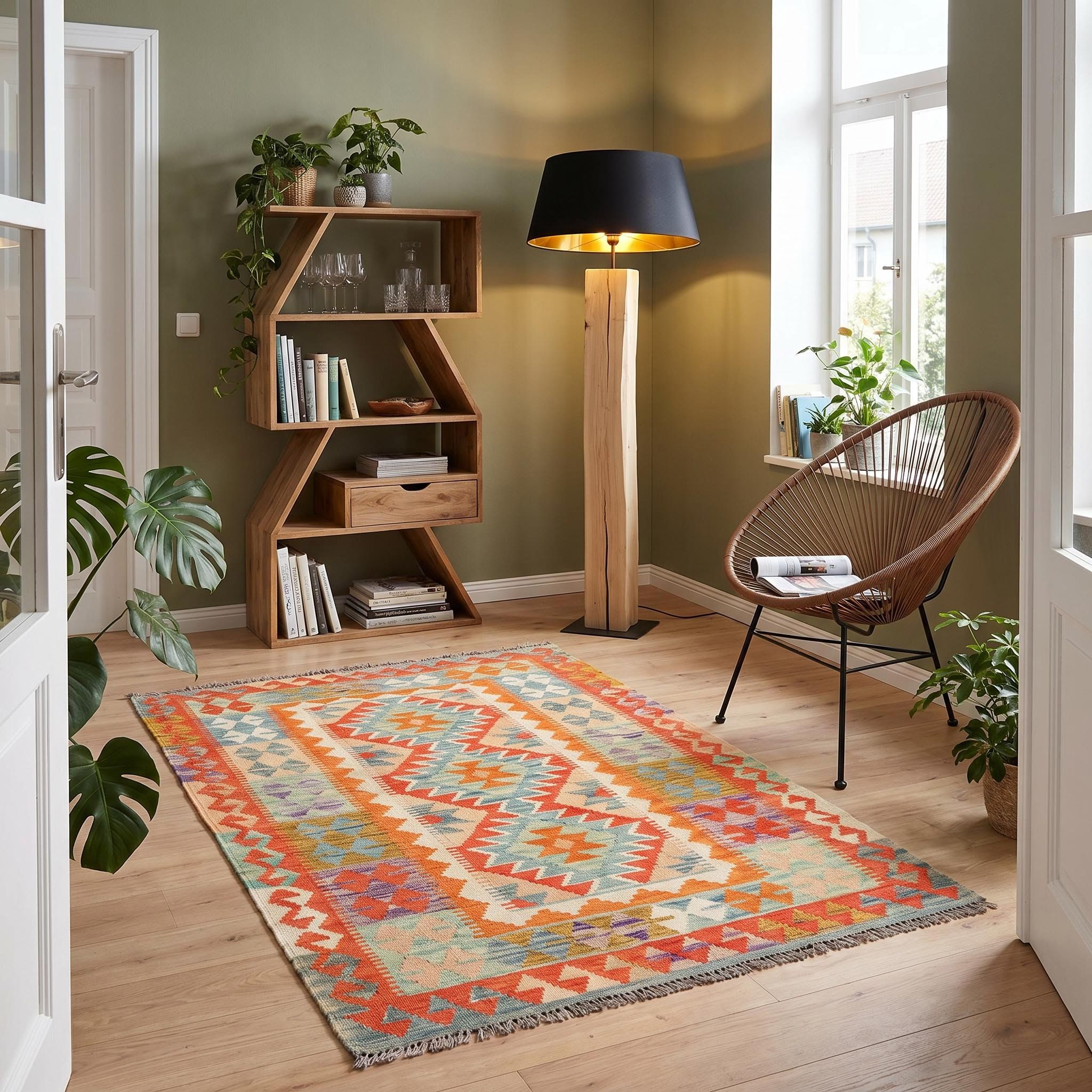 Im aufgeräumten skandinavischen Stil fungiert dieser farbenfrohe Kelim als lebendiges Highlight, das sofort für das gewünschte „Hygge“-Gefühl sorgt. Die klaren geometrischen Formen des Teppichs korrespondieren mit dem nordischen Designanspruch, während die natürliche Wolle die nötige Wärme gegen weiße Wände und helles Holz setzt. Er wirkt als gemütliche Insel im Raum und bricht die monochrome Palette mit seinen freundlichen Naturfarben auf, ohne dabei aufdringlich zu wirken. Dieses hochwertige Einzelstück beweist, dass funktionales Design und traditionelle Handwerkskunst eine wunderbare Symbiose eingehen können.