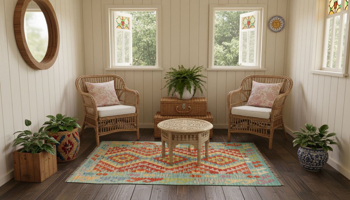 Hier präsentieren wir Ihnen den handgewebten Kelim Ghazghar aus Afghanistan, der mit seiner einzigartigen Farbgebung und Musterung überzeugt. Die Hauptfarbe dieses Teppichs ist ein lebhaftes Türkis, das die Basis für das gesamte Design bildet. Dazu gesellen sich warme Rot- und Orangetöne, die zusammen mit einem erdigen Beige und frischen Grüntönen harmonisch interagieren. Diese Farben verleihen dem Kelim eine fröhliche Ausstrahlung, die jeden Raum zum Leuchten bringt.Das Muster ist ...
