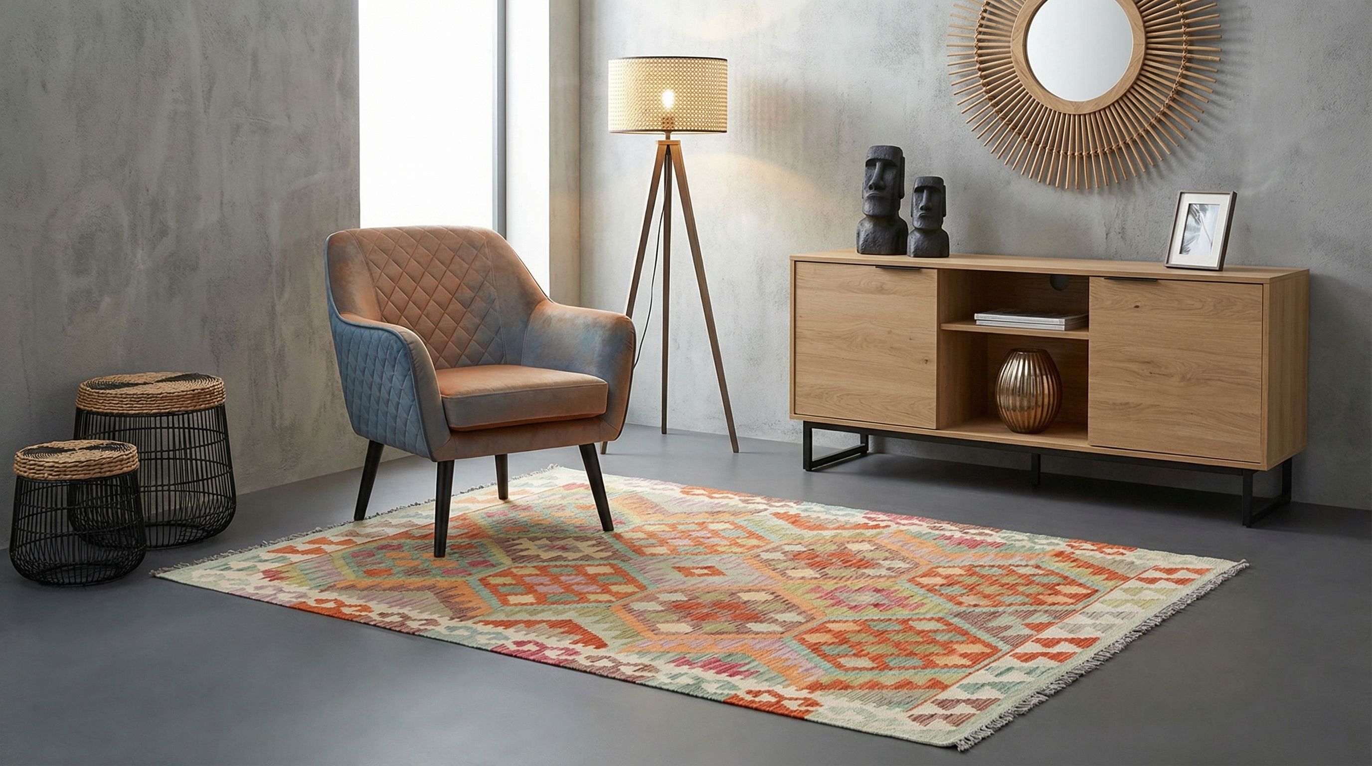 Im rauen Industrial-Style, der von Beton, Stahl und offenem Mauerwerk dominiert wird, sorgt dieser authentische Nomadenteppich für den entscheidenden Gegenpol an Wärme und Behaglichkeit. Die sichtbare Struktur der handgewebten Wolle und die natürlichen Farbvariationen brechen die Kühle der Loft-Atmosphäre auf, ohne ihr die Edge zu nehmen. Als bewusster Stilbruch verleiht der traditionelle Ghazghar-Kelim dem Raum eine gelebte Geschichte und mildert den strengen Fabrikcharakter sanft ab. Er ist das perfekte Verbindungselement, um einen coolen Industrieraum wirklich bewohnbar und einladend zu gestalten.