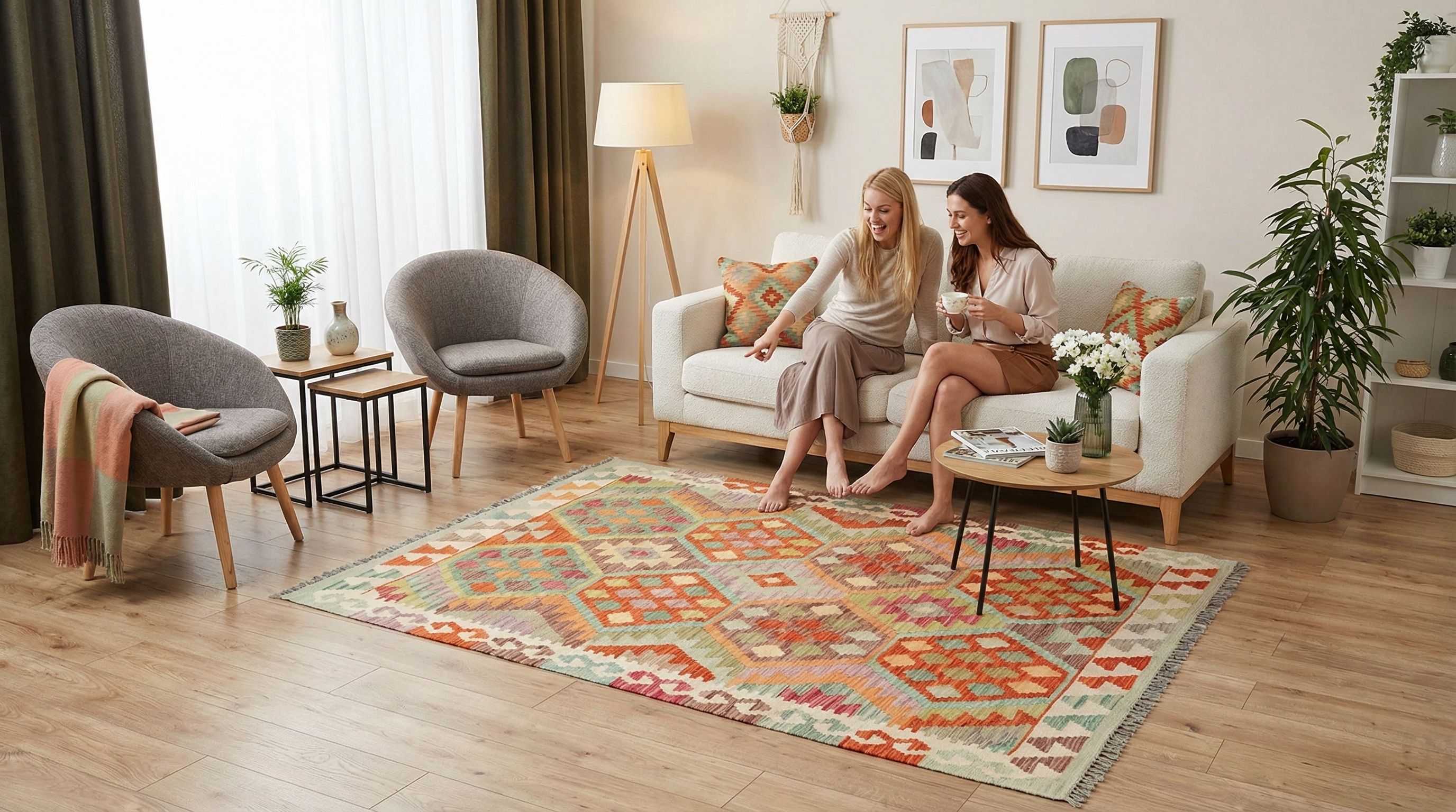 Obwohl musterreich, passt dieser Kelim dank seiner gedämpften Naturfarben und dem Fokus auf nachhaltige, hochwertige Materialien perfekt zum skandinavischen Stil. Er bringt die nötige Portion „Hygge“ in das helle, nordische Ambiente und bricht die Dominanz von Weiß und Grau mit seinen warmen, aber unaufdringlichen Akzenten auf. Die handversponnene Wolle sorgt für ein haptisches Erlebnis, das den Raum sofort weicher und wohnlicher macht, ohne die optische Klarheit zu stören. Hier fungiert der Teppich als gemütlicher Anker, der die nordische Vorliebe für Natur und Handwerk zelebriert.