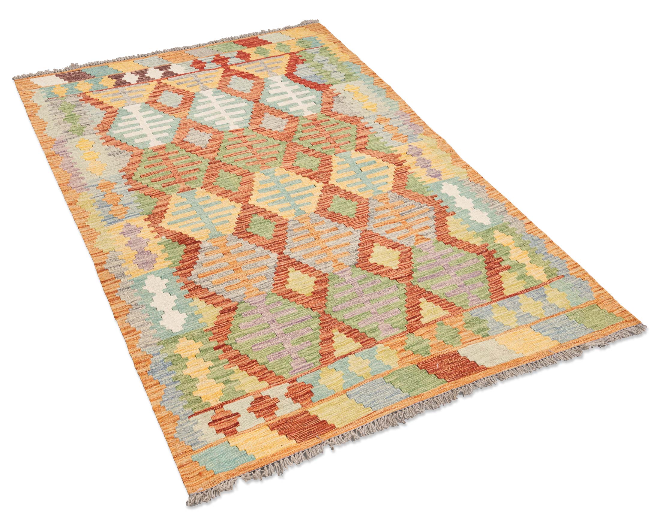 Hier präsentieren wir Ihnen einen außergewöhnlichen handgewebten Kelim aus Afghanistan, der mit seinen warmen Erdtönen und lebendigen Mustern begeistert. Die Hauptfarbe dieses Teppichs ist ein intensives Rot, das in harmonischem Zusammenspiel mit erfrischendem Grün, sanftem Beige und belebendem Blau steht. Diese Farbkombination verleiht dem Kelim eine fröhliche und zugleich elegante Ausstrahlung.