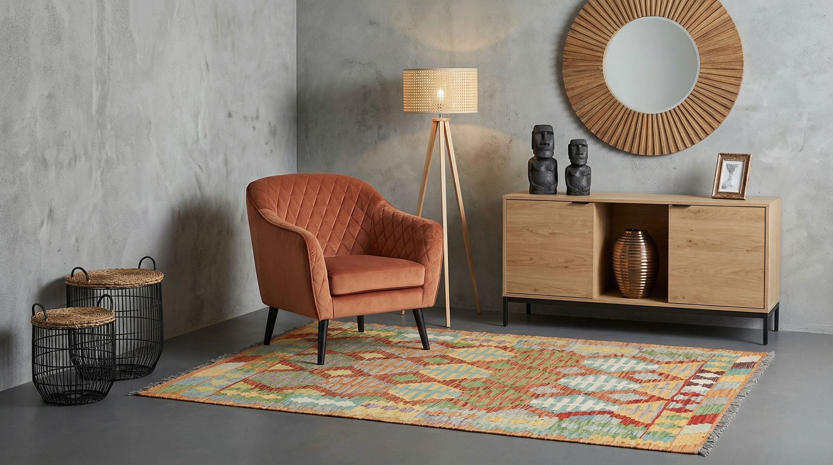 Als farbenfrohes Herzstück bricht dieser Kelim die oft monochrome Palette des skandinavischen Stils auf und sorgt für eine große Portion „Hygge“-Wärme. Die geometrischen Formen korrespondieren hervorragend mit der nordischen Designsprache, während die bunten Naturfarben Leben auf weiße Dielen oder helle Böden bringen. Die reine Schafwolle entspricht dem skandinavischen Fokus auf nachhaltige, natürliche Materialien und hochwertige Texturen. So verwandelt der Teppich einen cleanen Raum in einen behaglichen Rückzugsort voller Persönlichkeit und Charakter.