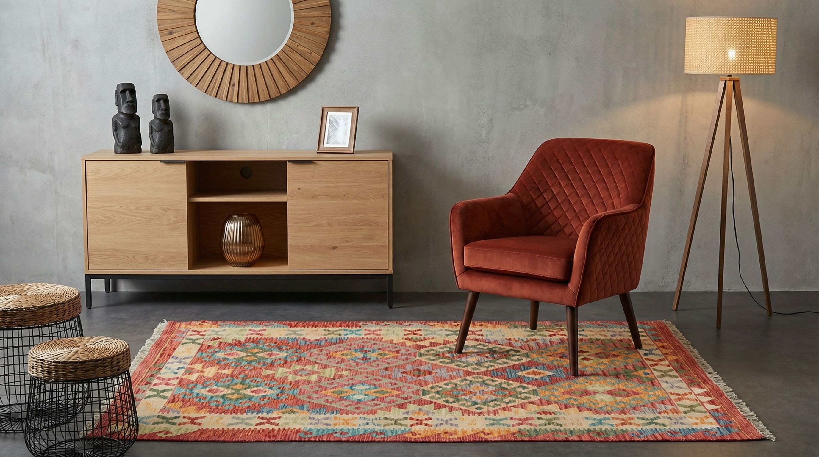 Hier präsentieren wir den faszinierenden Ghazghar-Kelim, ein beeindruckendes Kunstwerk aus handgewebter Schafwolle. Die Hauptfarbe dieses Teppichs ist ein warmes Rostrot, das durch Akzente in sanftem Türkis, lebendigem Orange und zartem Creme ergänzt wird. Diese harmonische Farbpalette verleiht jedem Raum eine einladende und behagliche Atmosphäre. Zusätzlich finden sich auch fröhliche, bunte Muster, die an die traditionellen Motive alter Nomadenkulturen erinnern.Der Teppich ist ...
