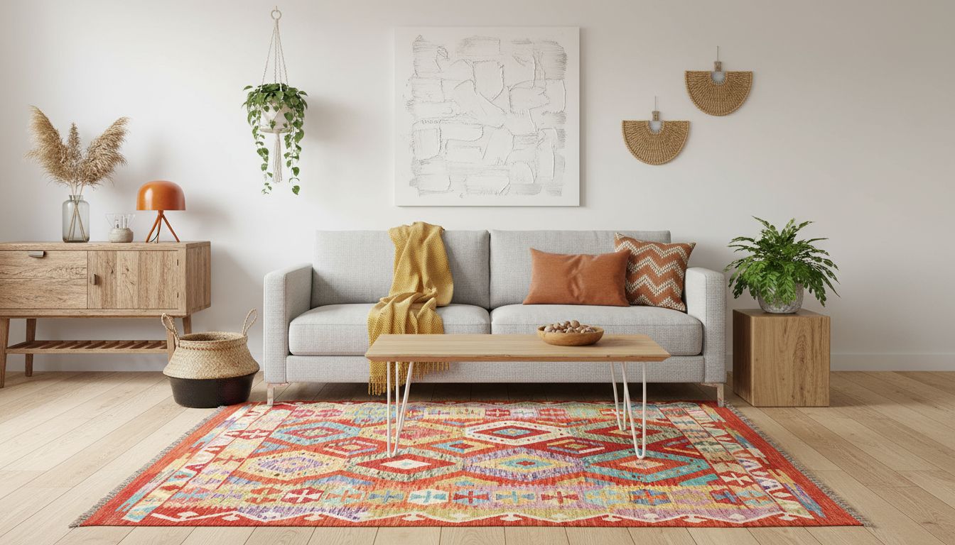 Hier präsentieren wir den beeindruckenden Ghazghar-Kelim, ein Meisterwerk aus Afghanistan, das durch seine warme, erdige Farbpalette besticht. Die Hauptfarbe dieses handgewebten Teppichs ist ein kräftiges Rot, das durch natürliche Farbstoffe aus handversponnener Schafwolle gewonnen wurde. Ergänzt wird dieses Rot durch lebendige Türkistöne, sanfte Gelbschattierungen und ein harmonisches Violett, die dem Teppich eine fröhliche Ausstrahlung verleihen.Das geometrische Muster, typisch ...