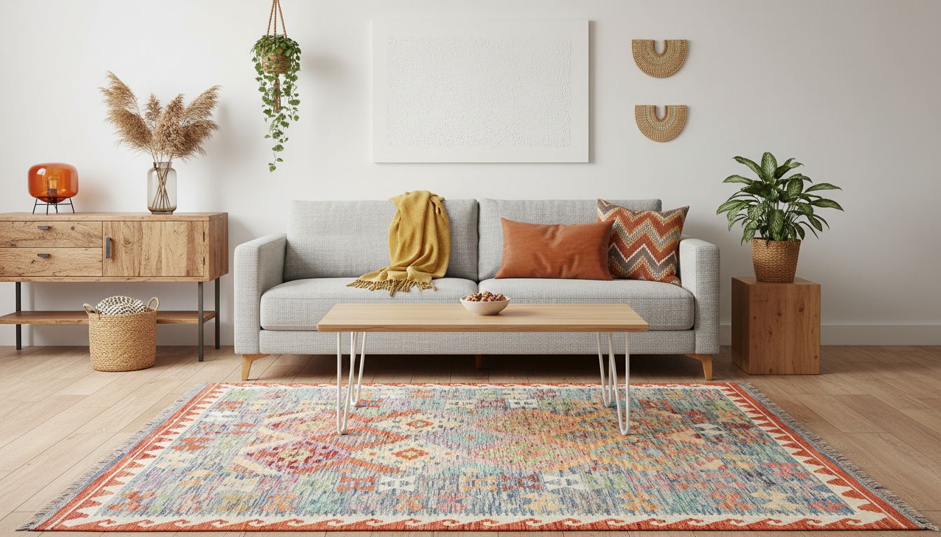 Dieser handgewebte Ghazghar-Kelim aus Afghanistan besticht durch seine lebendige Farbpalette und traditionelle Muster. Die Hauptfarbe des Teppichs ist ein kräftiges Rostrot, das den Rahmen und zentrale Muster dominiert. Begleitet wird es von einem sanften Cremeweiß, das die geometrischen Formen akzentuiert und dem Design Tiefe verleiht. Ein erfrischendes Türkis und ein warmes Orange ergänzen die Farbkomposition, während weitere Farben wie zartes Violett, Olivgrün und ein gedämpftes Blau ...mehr Beschreibung