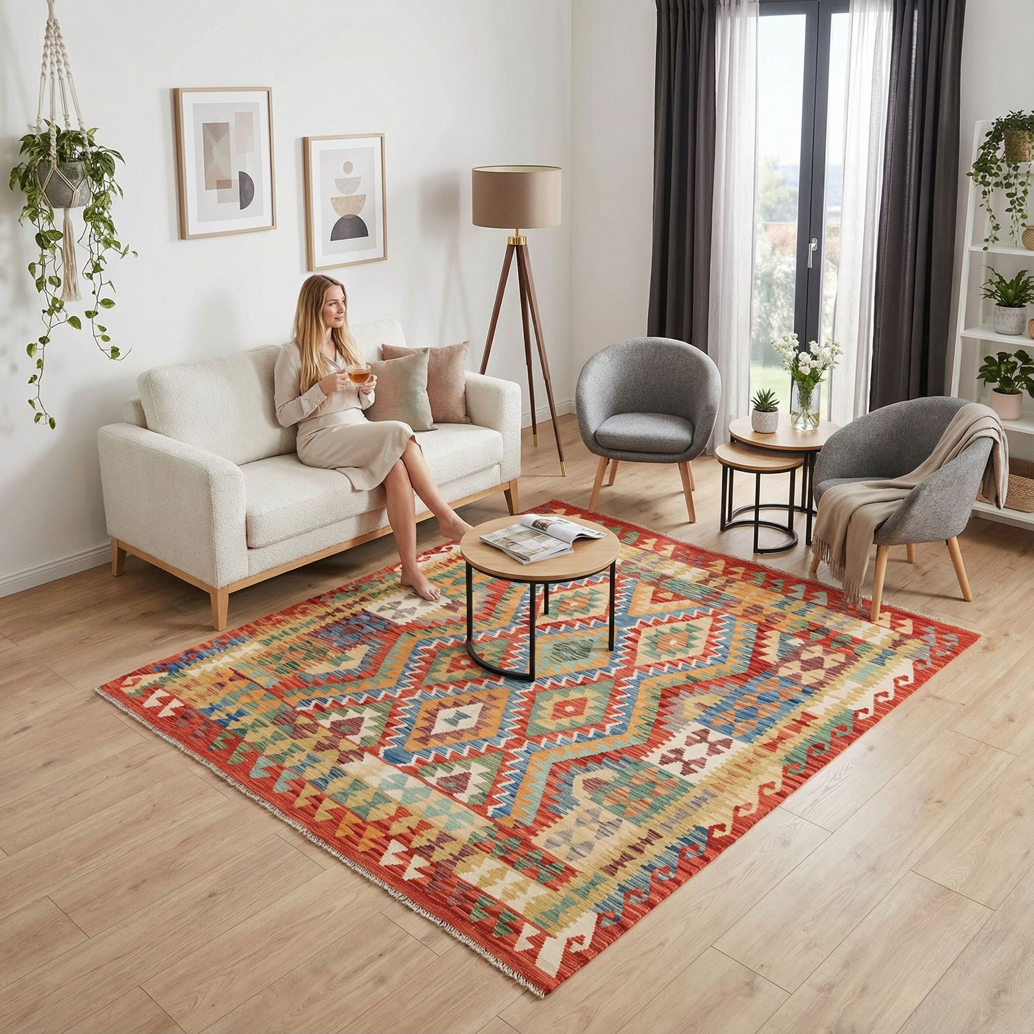 Als bewusster Stilbruch in einem cleanen Contemporary-Ambiente setzt dieser farbprächtige Kelim ein kunstvolles Statement, das moderne Strenge durch lebendige Tradition aufbricht. Die geometrische Formensprache des Teppichs korrespondiert hervorragend mit modernem Design, während die natürlichen Materialien einen spannenden Kontrast zu Glas und Hochglanzoberflächen bilden. Seine hochwertige Verarbeitung aus handversponnener Wolle genügt höchsten Qualitätsansprüchen und verleiht dem Raum eine exklusive, kuratierte Note. Nutzen Sie die beidseitige Verwendbarkeit dieses Unikats, um Ihrem modernen Wohnraum Flexibilität und eine unerwartete, behagliche Tiefe zu schenken.