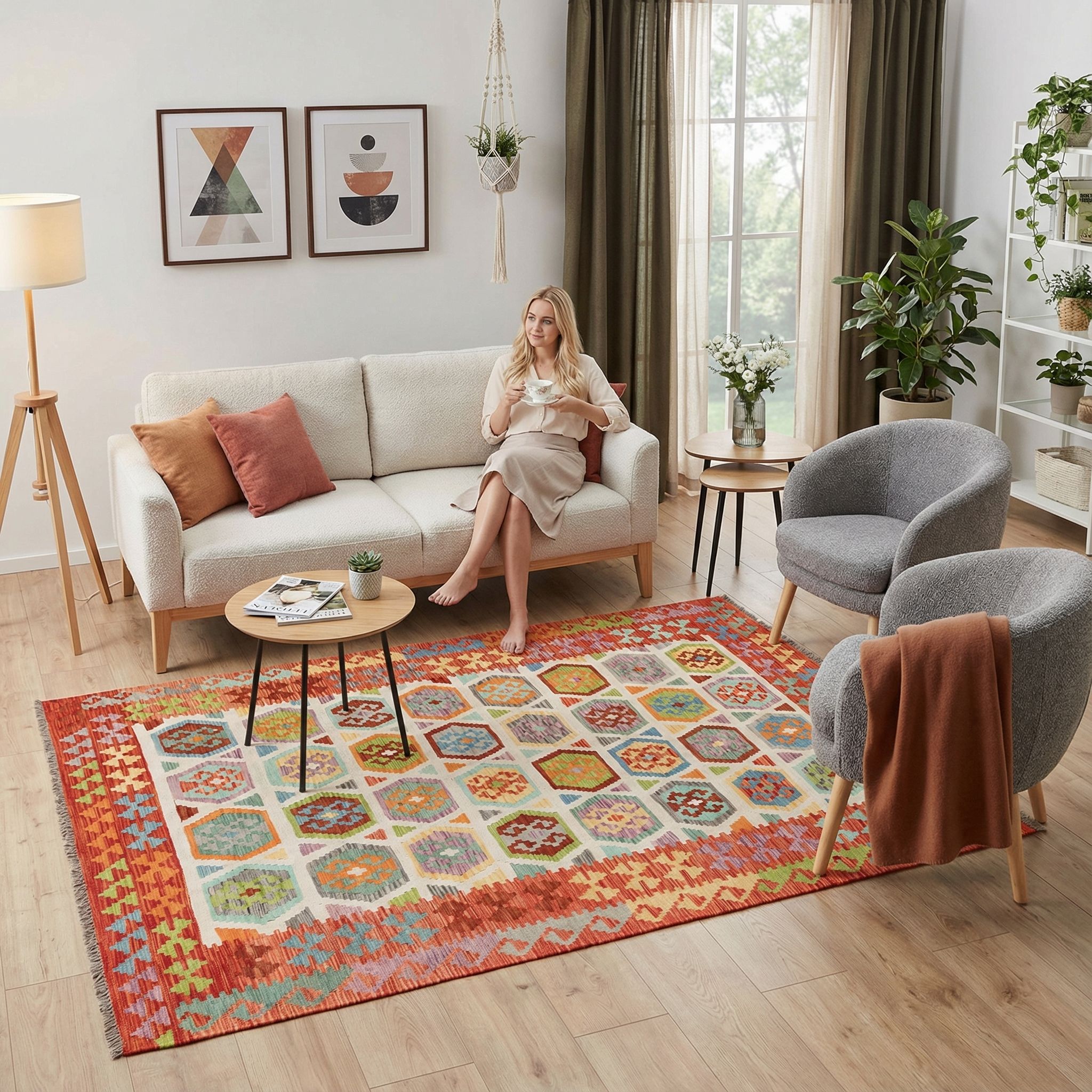 Entdecken Sie den faszinierenden handgewebten Ghazghar-Kelim aus Afghanistan, ein Meisterwerk aus handversponnener Schafwolle und Naturfarben. Die Hauptfarben dieses Teppichs sind ein warmes, erdiges Ziegelrot und Hellbeige, das von lebhaften Blautönen und frischem Grün ergänzt wird. Die harmonische Farbpalette verleiht jedem Raum eine behagliche und einladende Atmosphäre. Das geometrische Muster mit seinen sechseckigen Formen und traditionellen Nomadenmotiven ist charakteristisch für ...mehr Beschreibung