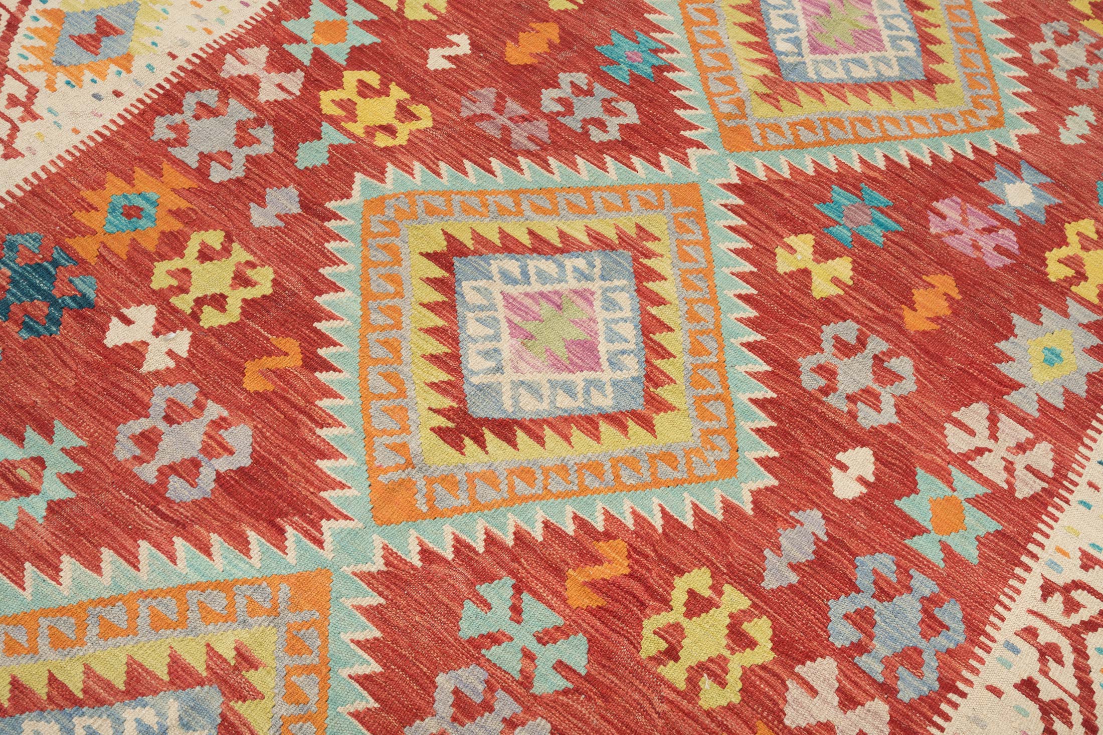 Dieser handgewebte Kelim aus Afghanistan, bekannt als Ghazghar, besticht durch seine warme, erdige Hauptfarbe Rot. Ergänzt wird das Design durch sanfte Akzente in Beige und lebendige Blautöne, die dem Teppich eine fröhliche, bunte Ausstrahlung verleihen. Das Muster ist geprägt von traditionellen Nomadenmotiven mit geometrischen Formen und Rauten, die eine harmonische Symmetrie schaffen. Hergestellt aus handversponnener Schafwolle und gefärbt mit natürlichen Farben, ist dieser Teppich beidseitig verwendbar und bietet höchste Qualität und Einzigartigkeit. Perfekt geeignet für glatte Böden, empfehlen wir die Verwendung einer rutschfesten Unterlage für optimalen Halt. Der Ghazghar-Kelim bringt eine einladende Atmosphäre in jeden Raum und verbindet traditionelle Handwerkskunst mit zeitloser Eleganz.