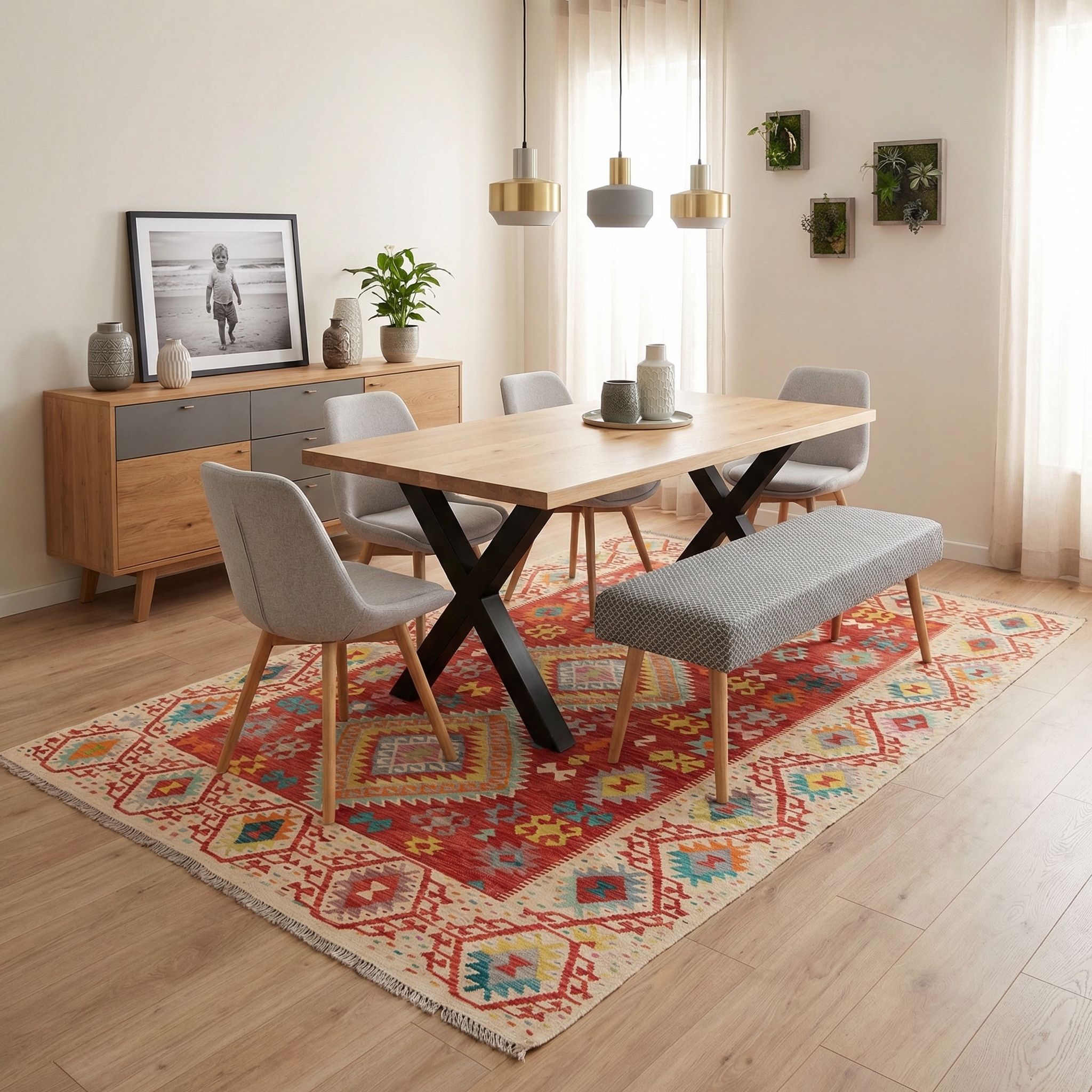 Im oft reduzierten und hellen skandinavischen Design fungiert dieser farbenfrohe Ghazghar-Kelim als warmer, einladender Anker, der sofortiges „Hygge“-Gefühl erzeugt. Die geometrische Formensprache korrespondiert hervorragend mit dem nordischen Design, während die natürliche Schafwolle die notwendige Textur und Wärme in die schlichte Umgebung bringt. Als hochwertiges Naturprodukt erfüllt er den skandinavischen Anspruch an Nachhaltigkeit und ehrliche Materialien perfekt. Der Teppich bricht die monochrome Palette sanft auf und setzt einen fröhlichen, aber bodenständigen Akzent, der den Raum wohnlich macht.