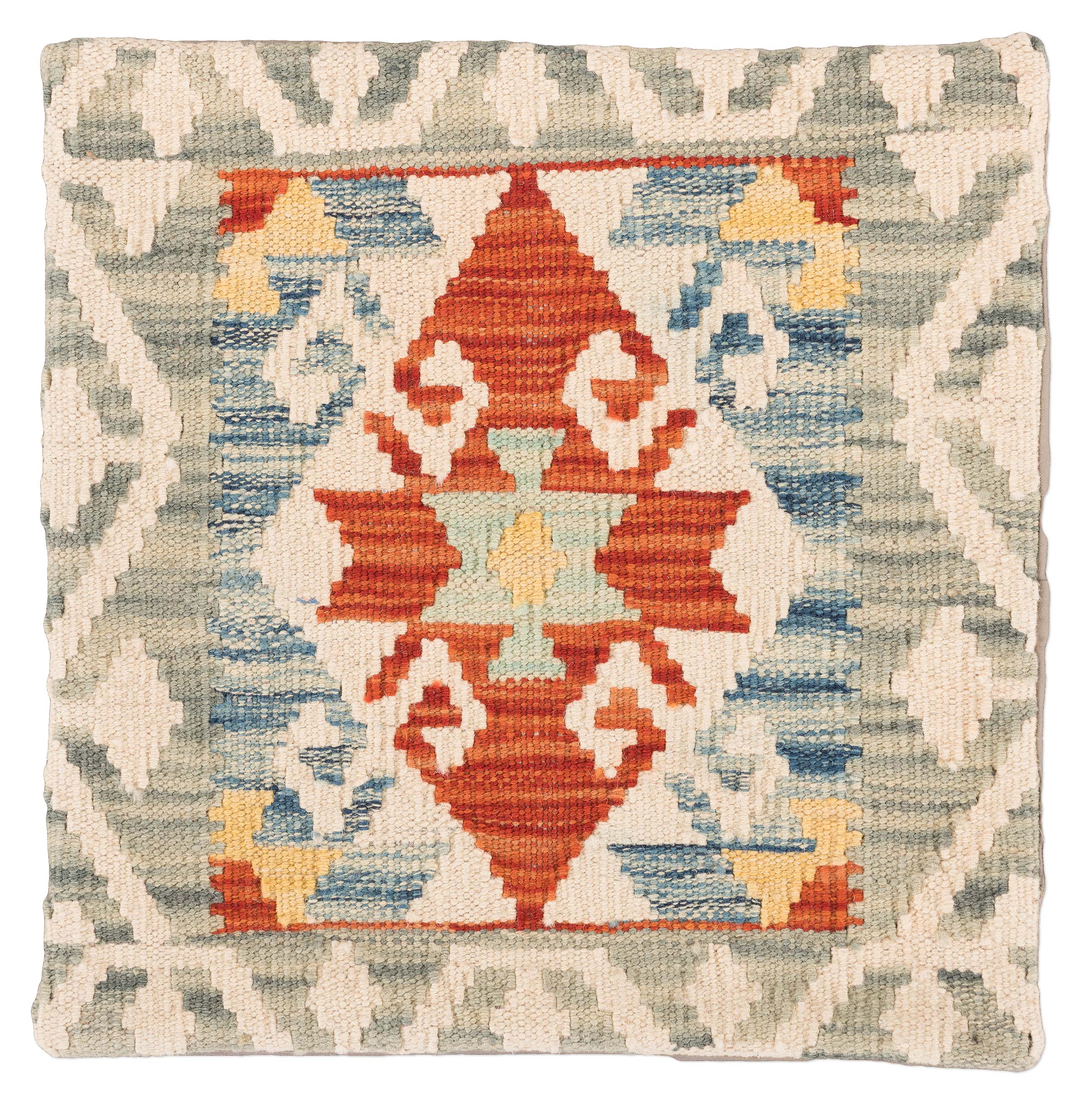 Hier präsentieren wir das Ghazghar-Kelimzierkissen, ein wahres Schmuckstück aus dem Herzen Afghanistans. Die Hauptfarbe dieses handgewebten Kunstwerks ist ein warmes Ziegelrot, das durch den Einsatz natürlicher Farbstoffe besonders lebendig wirkt. Begleitet wird es von einem sanften Beige, einem tiefen Blau und einem Hauch von Senfgelb, die das traditionelle Nomadenmuster eindrucksvoll zur Geltung bringen. Diese harmonische Farbpalette verleiht dem Kissen eine warme, einladende Ausstrahlung, ...mehr Beschreibung