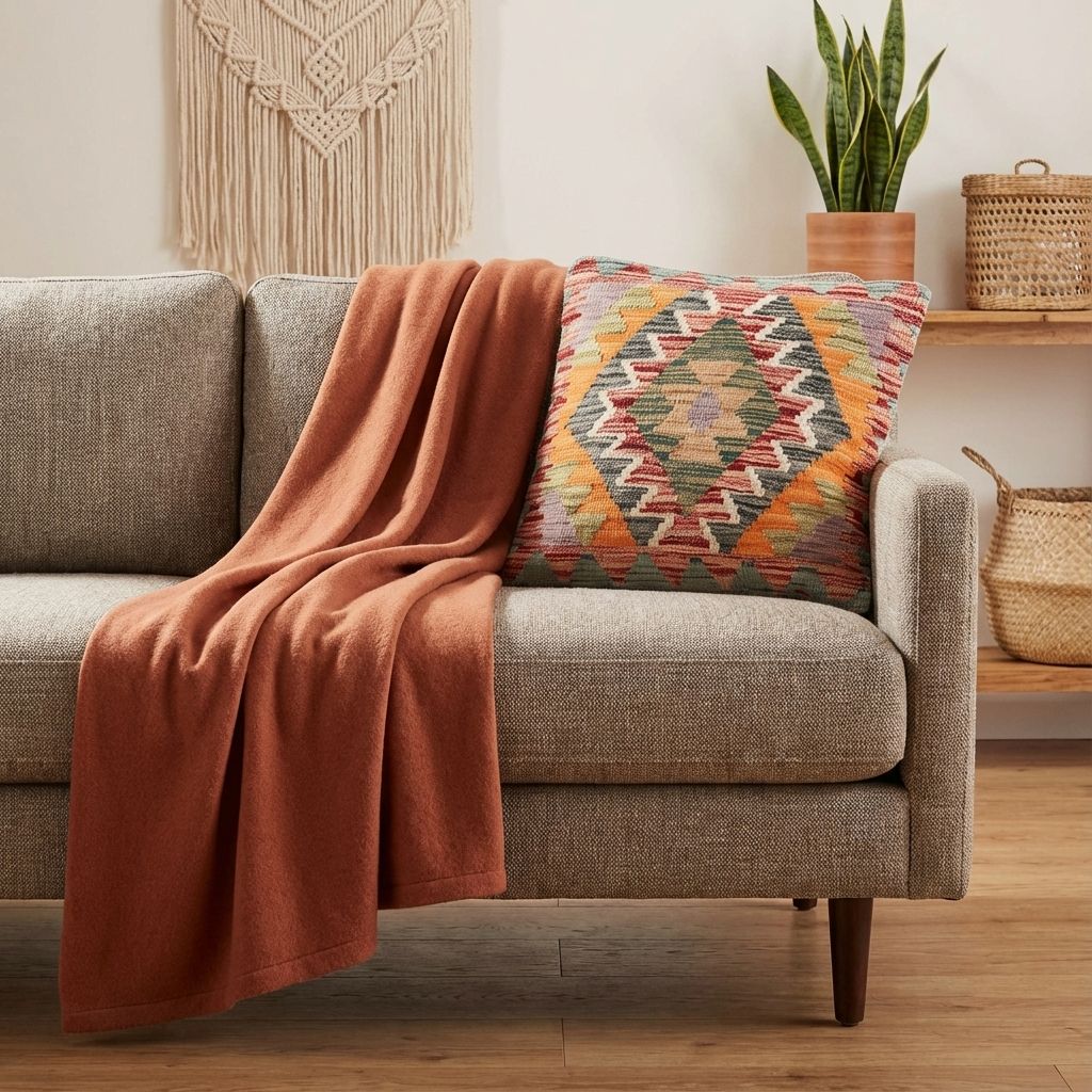 In einem reduzierten, modernen Ambiente fungiert dieses kunstvolle Kissen als raffinierter, wärmender Akzent, der die Brücke zwischen Tradition und Moderne schlägt. Das markante geometrische Rautenmuster wirkt zeitlos und bricht die Strenge minimalistischer Designermöbel gekonnt auf, ohne den klaren Look zu überladen. Die wundervoll warme Farbpalette verleiht kühlen, glatten Oberflächen sofort eine wohnliche Tiefe und eine hochwertige haptische Dimension. Es beweist eindrucksvoll, dass uralte Handwerkskunst perfekt in ein zeitgemäßes, designorientiertes Wohnambiente passt.