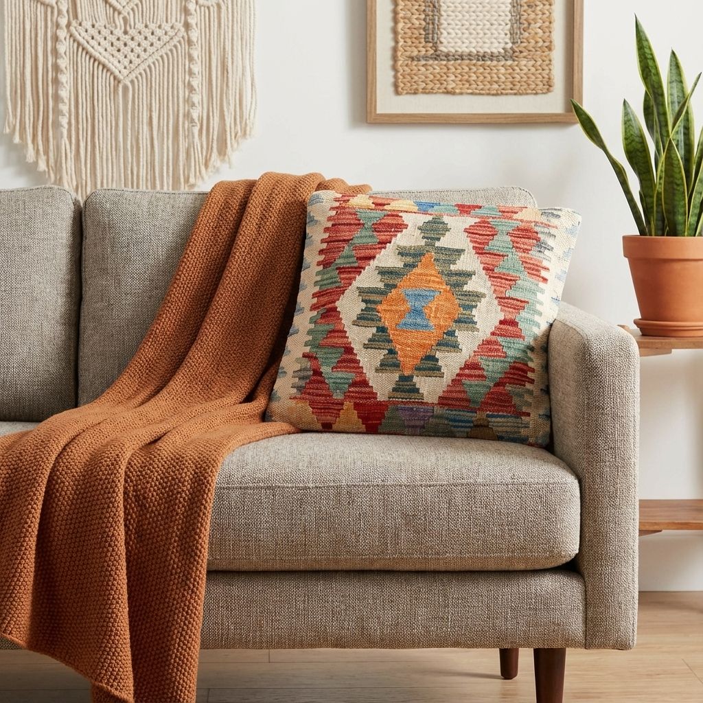 In einem reduzierten, modernen Ambiente fungiert dieses kunstvolle Kissen als raffinierter, wärmender Akzent, der die Brücke zwischen Tradition und Moderne schlägt. Das markante geometrische Rautenmuster wirkt zeitlos und bricht die Strenge minimalistischer Designermöbel gekonnt auf, ohne den klaren Look zu überladen. Die wundervoll warme Farbpalette verleiht kühlen, glatten Oberflächen sofort eine wohnliche Tiefe und eine hochwertige haptische Dimension. Es beweist eindrucksvoll, dass uralte Handwerkskunst perfekt in ein zeitgemäßes, designorientiertes Wohnambiente passt.