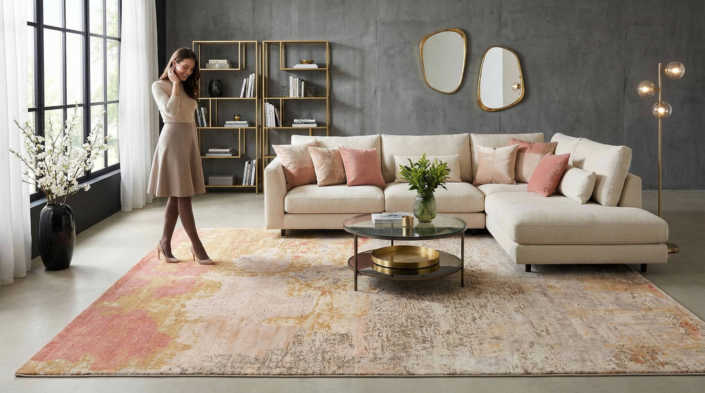 Dieser hochmoderne handgeknüpfte Designerteppich aus der Eterno-Kollektion präsentiert sich in einem beeindruckenden Zusammenspiel von Farben und Mustern. Die Hauptfarbe ist ein sanftes Beige, das dem Teppich eine ruhige und elegante Ausstrahlung verleiht. Ergänzt wird dieses durch ein zartes Rosé und ein warmes Goldgelb, die subtil ineinander übergehen und ein harmonisches Gesamtbild schaffen. Die Musterung ist abstrakt und modern, mit einer leichten Vintage-Note, die dem Teppich einen ...mehr Beschreibung