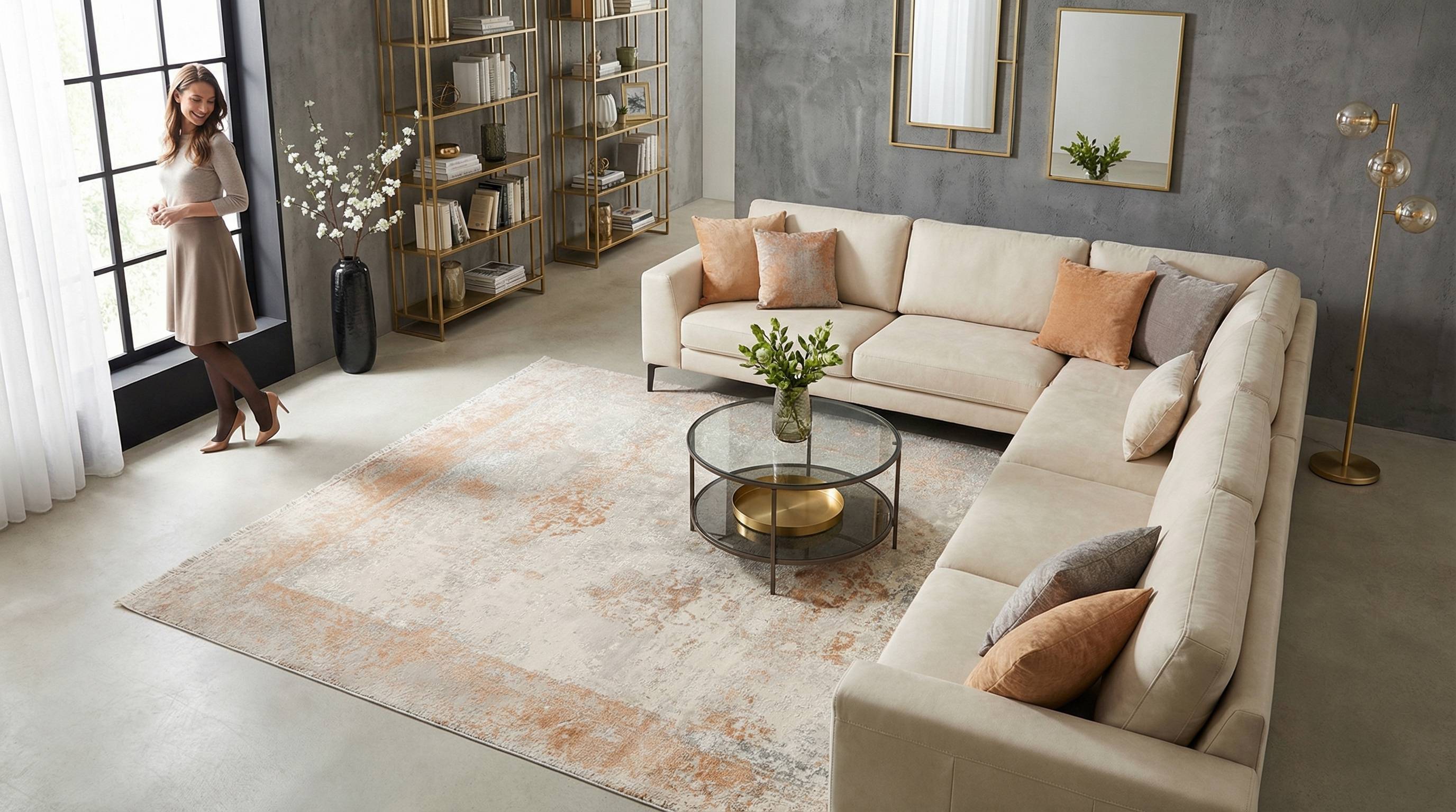 Hier präsentieren wir Ihnen den handgeknüpften Teppich Eterno aus Indien, ein Meisterwerk aus hochwertigen Materialien. Die Hauptfarbe ist ein sanftes Beige, das dem Teppich eine elegante und zeitlose Ausstrahlung verleiht. Ergänzt wird diese durch ein lebhaftes Rostorange, das subtile Akzente setzt und dem Design Tiefe verleiht. Ein zartes Graublau fügt eine zusätzliche Dimension hinzu, während die feinen Details in Creme den Vintage-Look vervollständigen.Der Teppich besticht durch ...