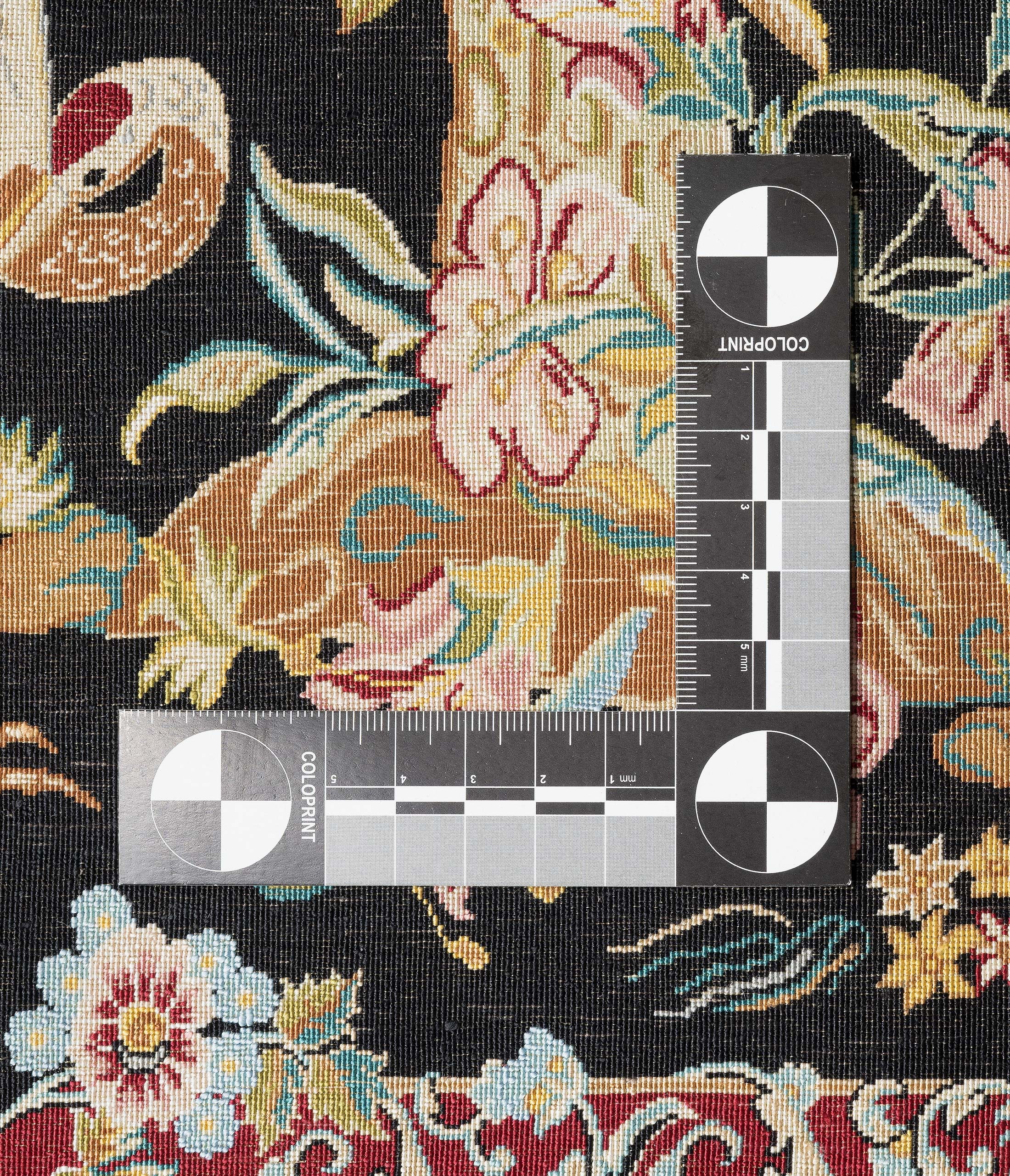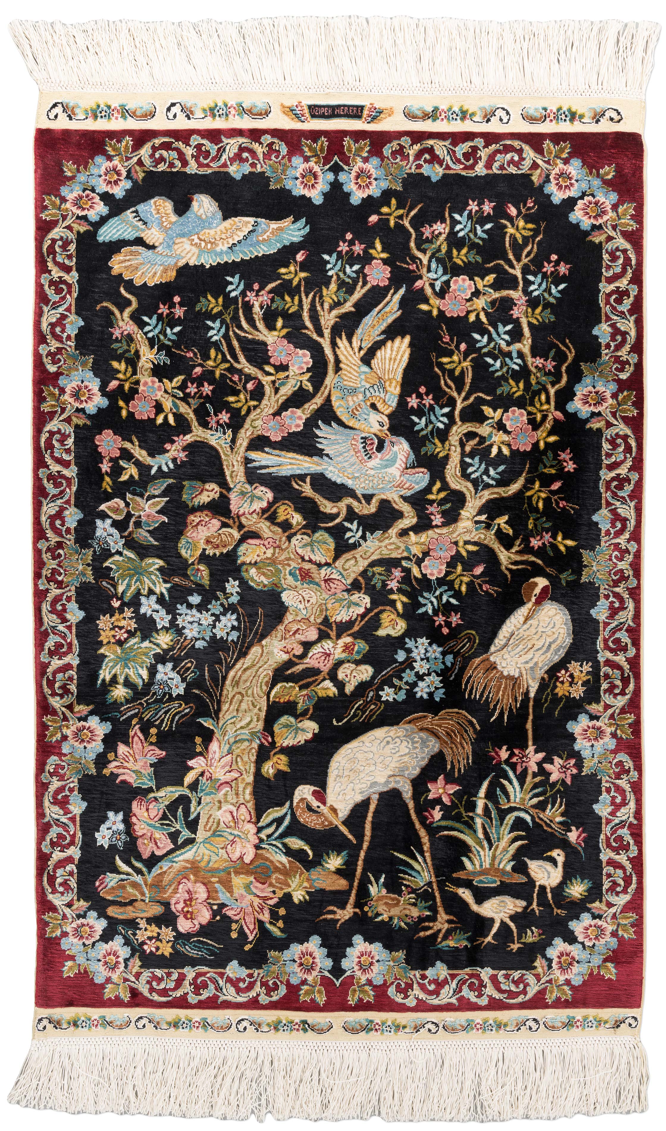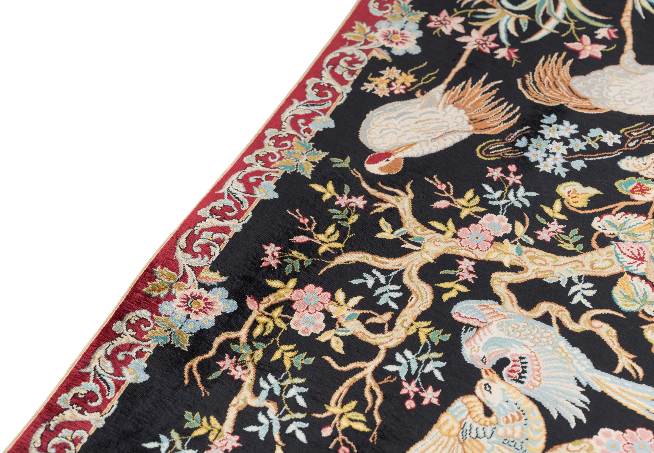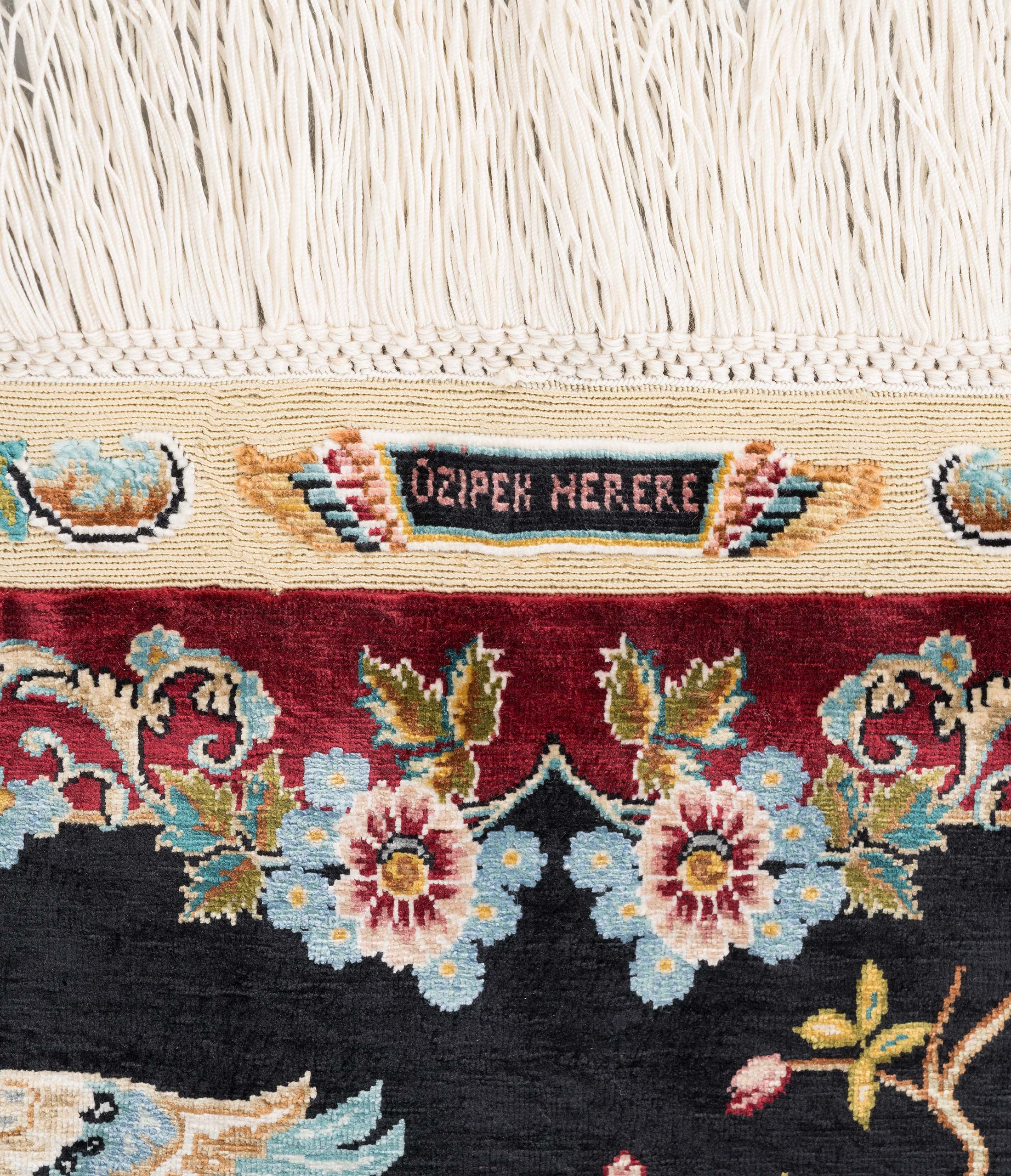 Dieser atemberaubende Hereke-Teppich aus reiner Naturseide, gefertigt in der renommierten Meisterwerkstatt Özipek, besticht durch seine extrem feine Handwerkskunst und die beeindruckende Anzahl von ca. 1.800.000 Knoten pro Quadratmeter. Die Hauptfarbe des Teppichs ist ein tiefes Schwarz, das eine elegante und edle Basis für die kunstvollen Muster bildet. Ergänzt wird dies durch ein reiches Burgunderrot, das die Bordüre schmückt und dem Teppich eine warme, luxuriöse Ausstrahlung verleiht. ...mehr Beschreibung