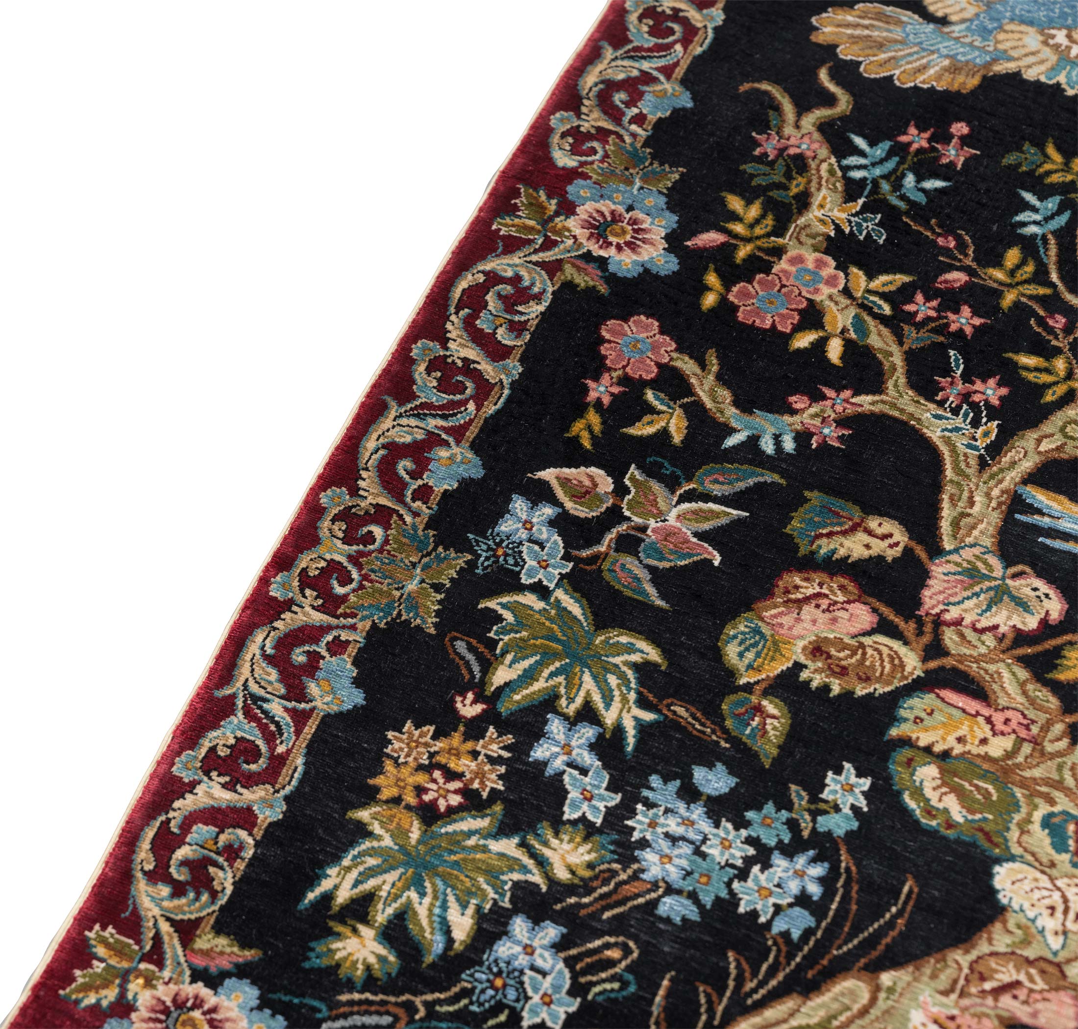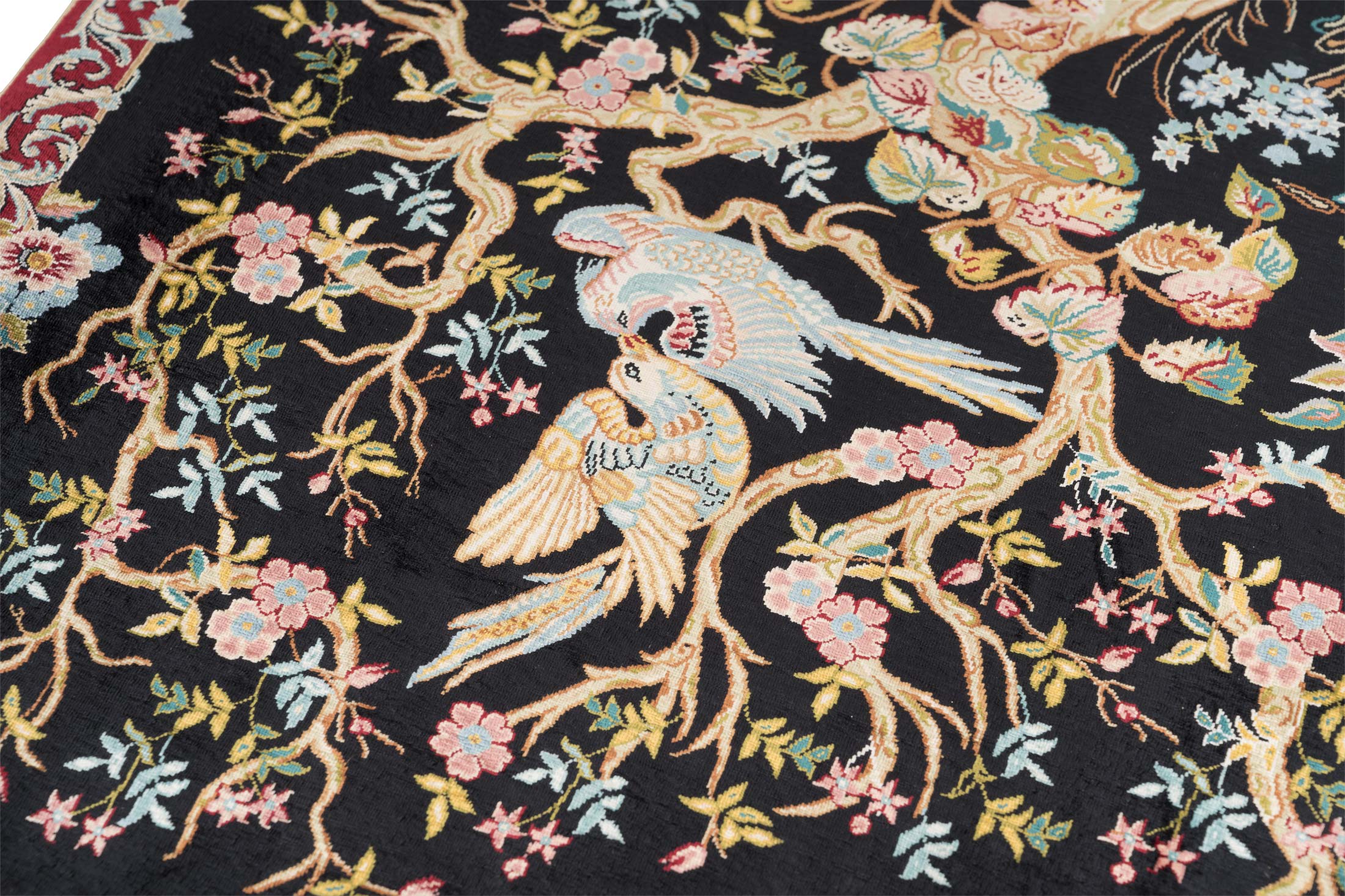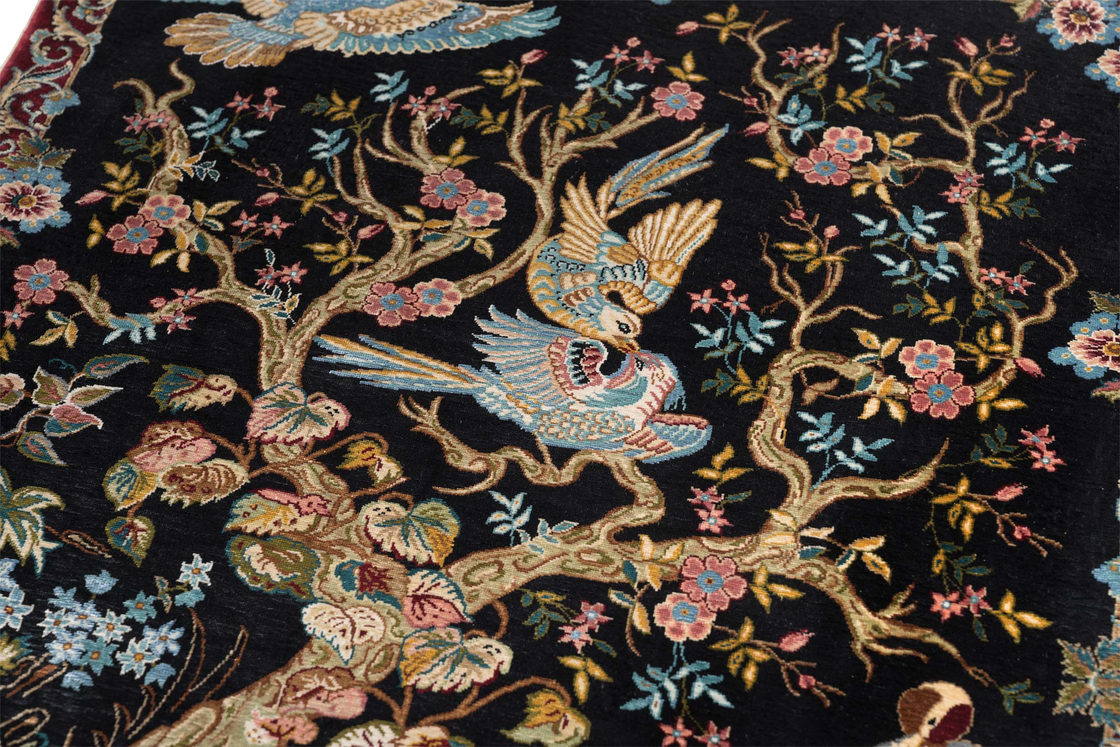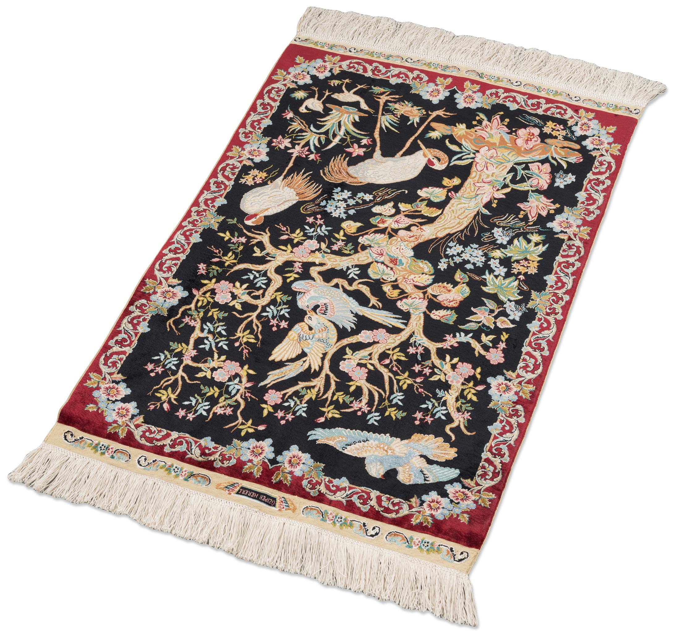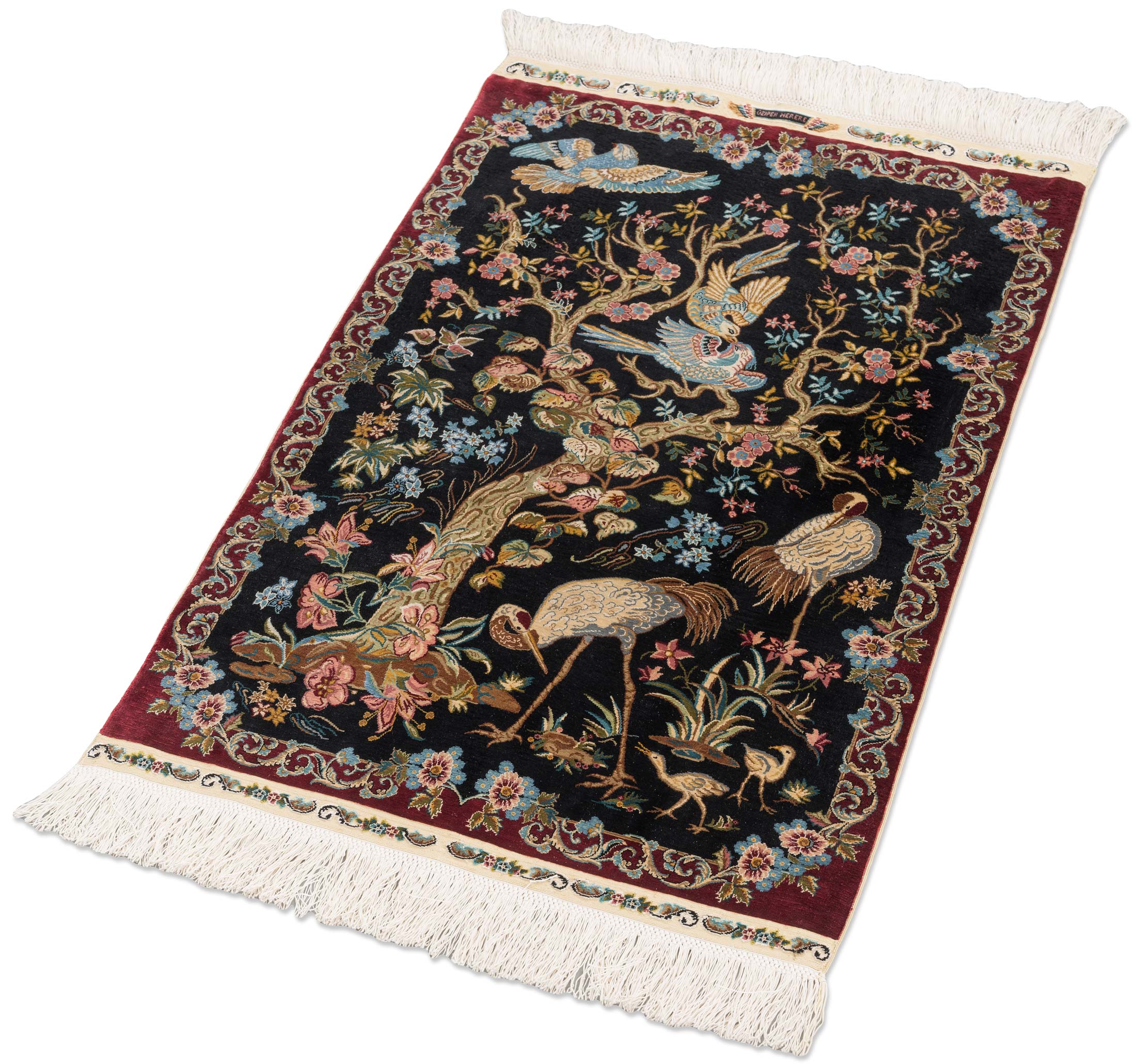 Dieser atemberaubende Hereke-Teppich aus reiner Naturseide, gefertigt in der renommierten Meisterwerkstatt Özipek, besticht durch seine extrem feine Handwerkskunst und die beeindruckende Anzahl von ca. 1.800.000 Knoten pro Quadratmeter. Die Hauptfarbe des Teppichs ist ein tiefes Schwarz, das eine elegante und edle Basis für die kunstvollen Muster bildet. Ergänzt wird dies durch ein reiches Burgunderrot, das die Bordüre schmückt und dem Teppich eine warme, luxuriöse Ausstrahlung verleiht. ...mehr Beschreibung