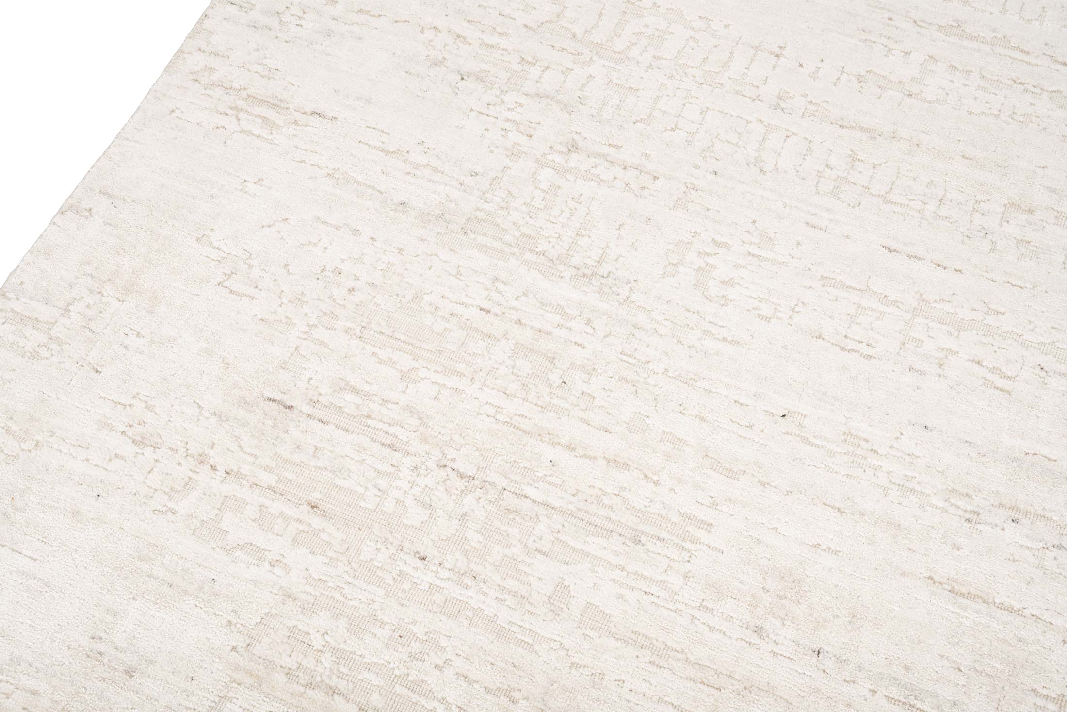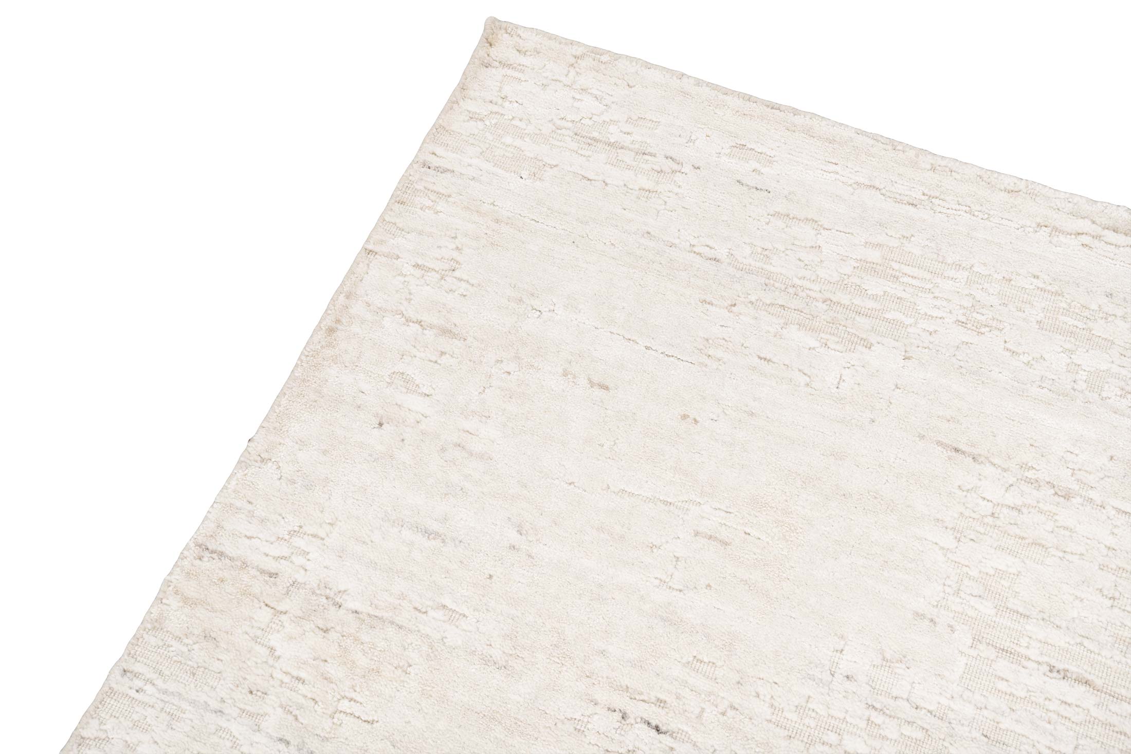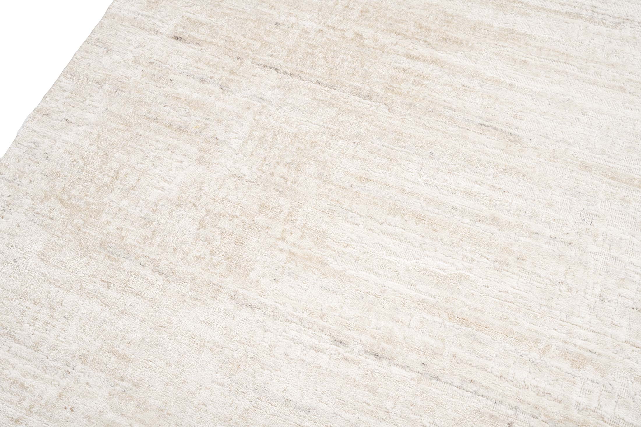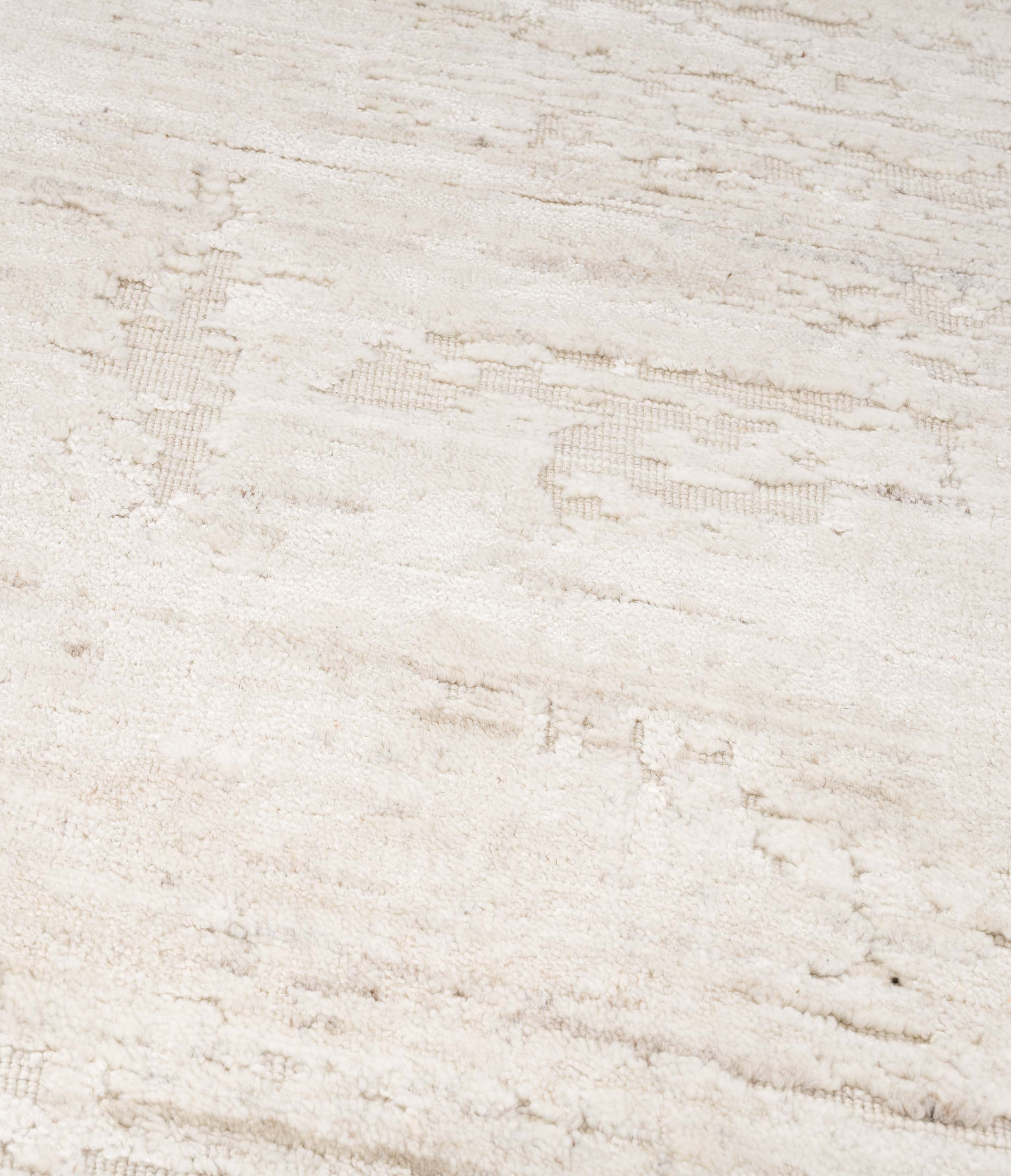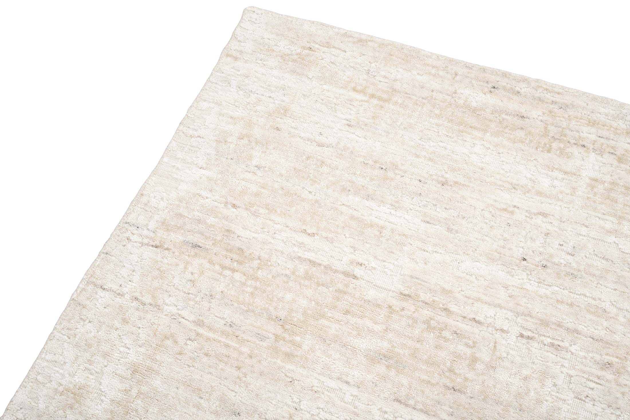 Dieser handgewebte Eterno-Basic Teppich aus Indien präsentiert sich in einem eleganten Creme als Hauptfarbe. Die dezente Farbpalette wird durch sanfte Beige- und Elfenbeintöne ergänzt, die dem Teppich eine zeitlose und ruhige Ausstrahlung verleihen. Vereinzelte, kaum wahrnehmbare Akzente in hellem Graubraun fügen dem Design eine subtile Tiefe hinzu. Die harmonische Kombination dieser Farben sorgt für eine warme, einladende Atmosphäre in jedem Raum.Das Muster des Teppichs ist von einer ...
