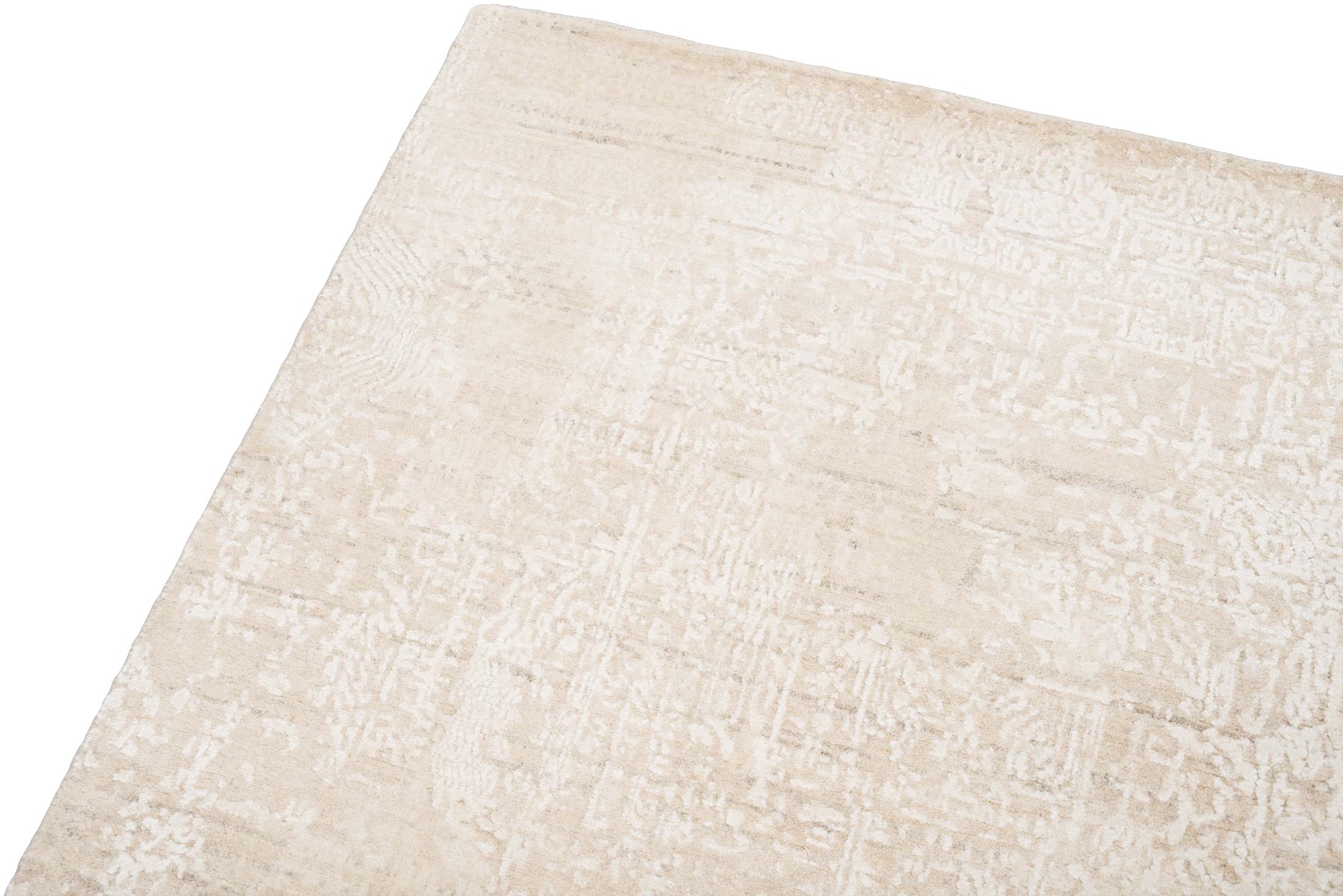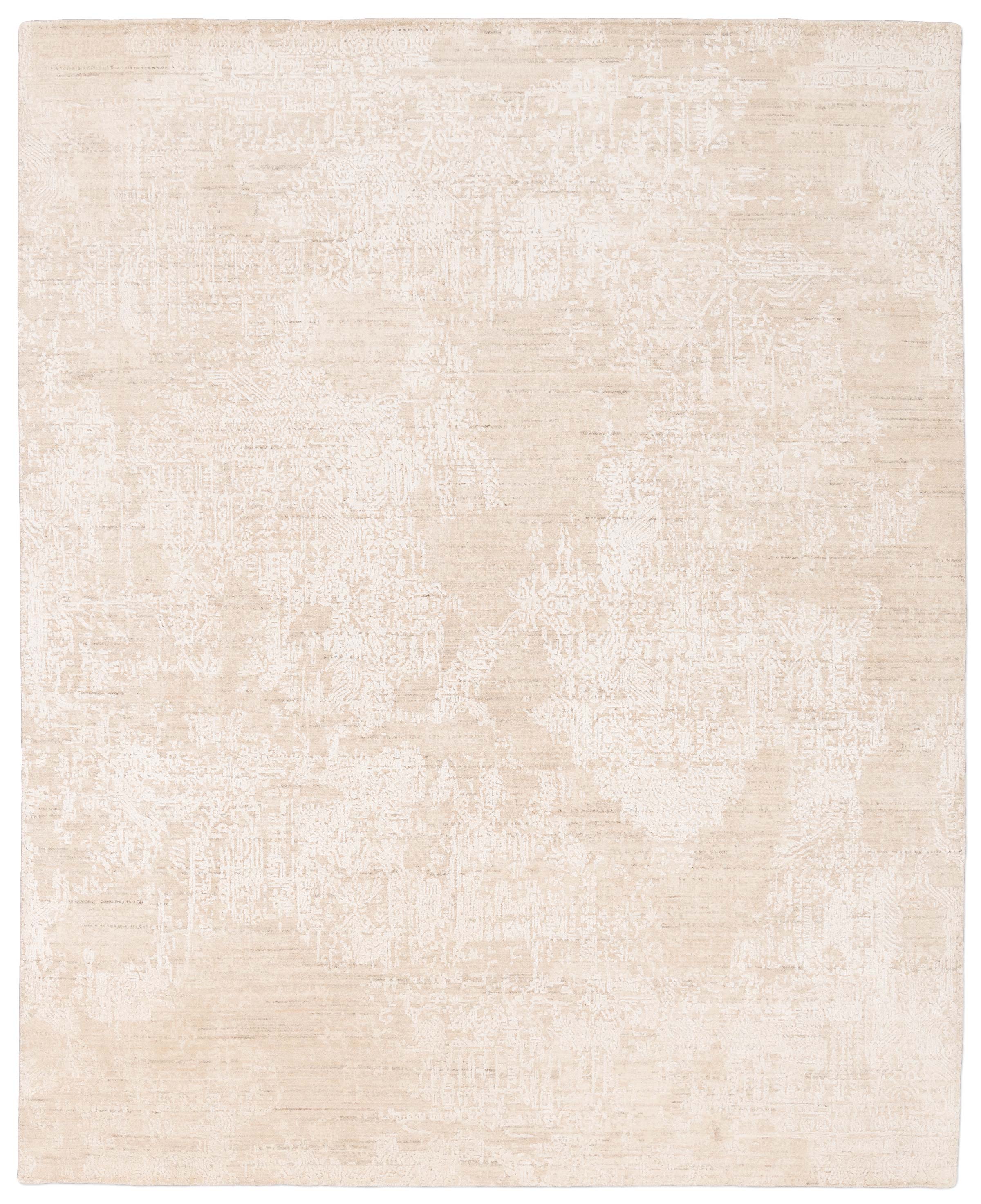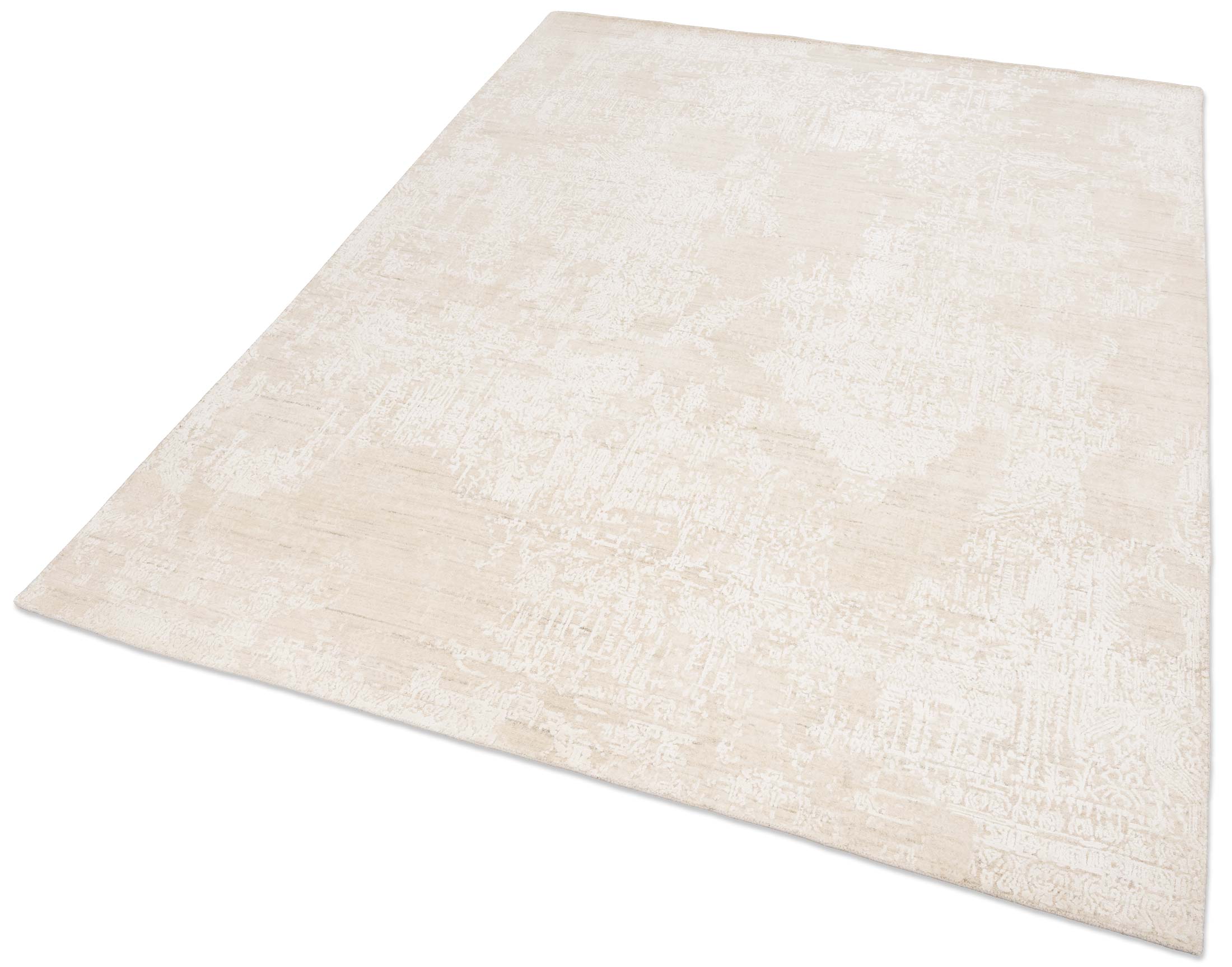 Dieser handgewebte Teppich aus Indien, bekannt als Eterno-Basic, präsentiert sich in einer eleganten, hellen Farbpalette. Die Hauptfarbe ist ein zartes Beige, das eine warme, einladende Atmosphäre schafft. Ergänzt wird diese durch sanfte Creme- und Elfenbeintöne, die dem Teppich eine leichte, luftige Anmutung verleihen. Diese harmonische Farbkomposition wird durch subtile, fast unsichtbare Muster akzentuiert, die sich wie ein feines Relief über die Oberfläche ziehen.Das Muster des ...