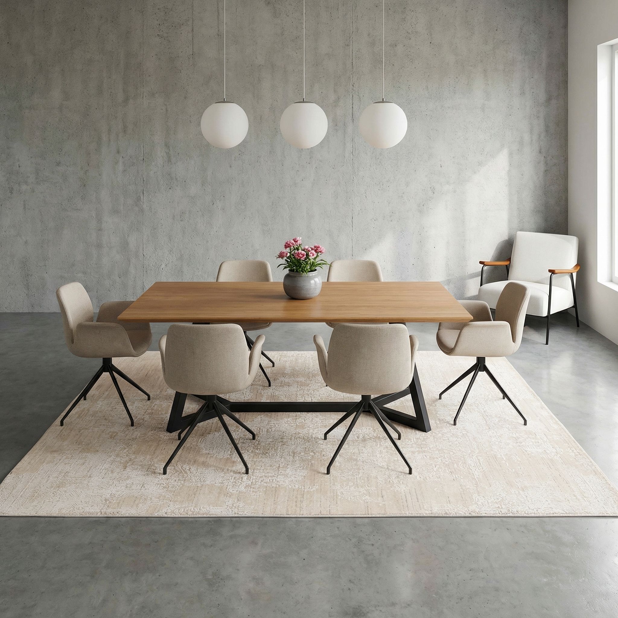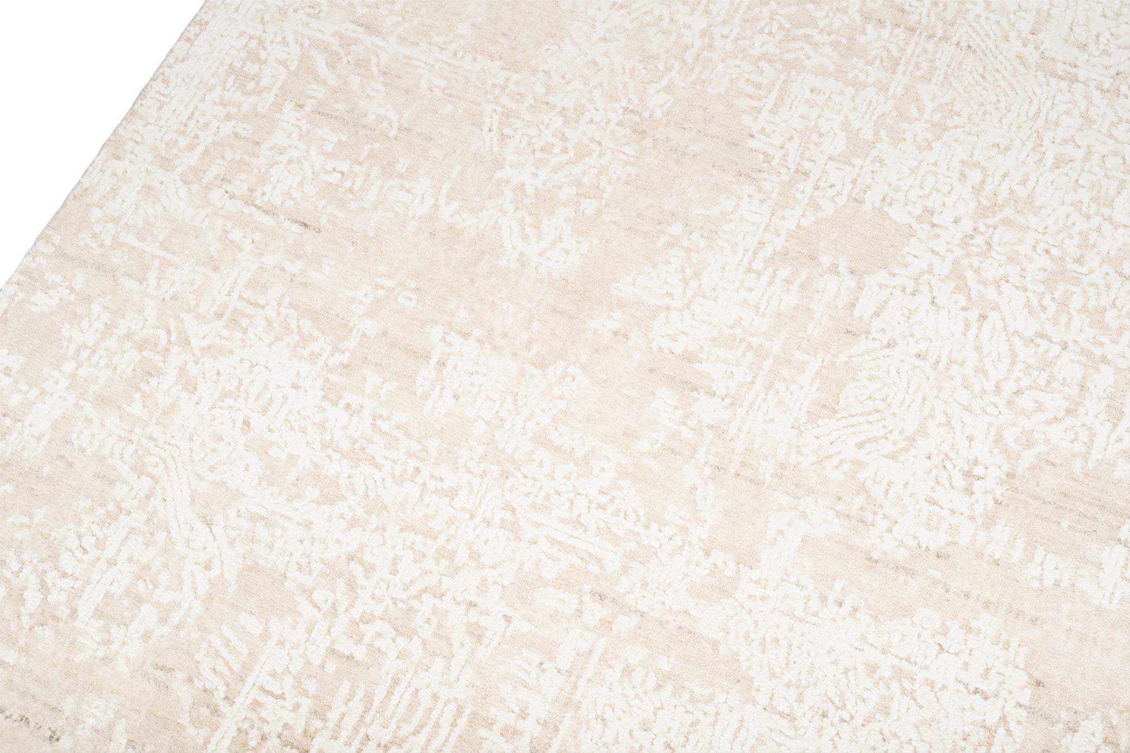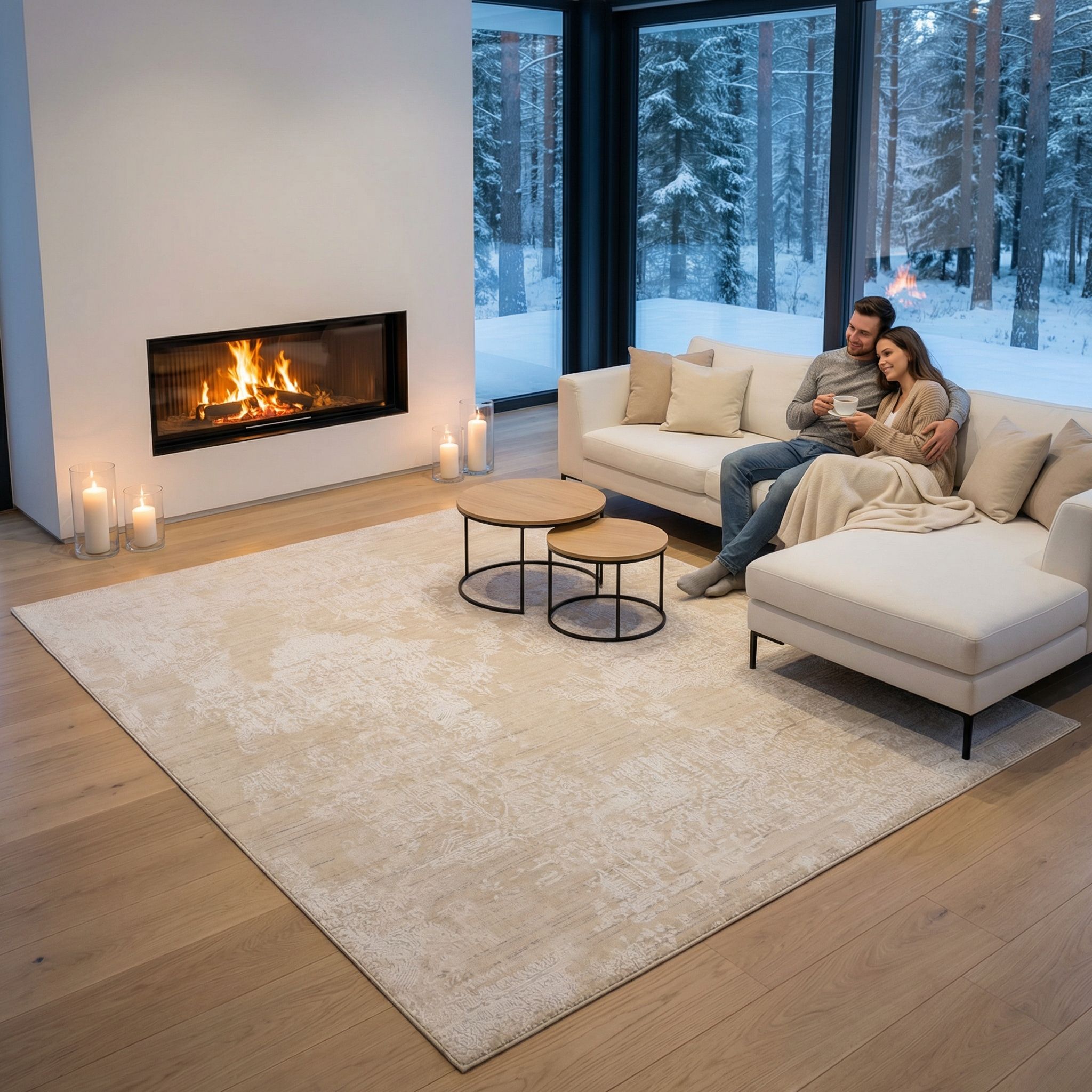 Dieser handgewebte Teppich aus Indien, bekannt als Eterno-Basic, präsentiert sich in einer eleganten, hellen Farbpalette. Die Hauptfarbe ist ein zartes Beige, das eine warme, einladende Atmosphäre schafft. Ergänzt wird diese durch sanfte Creme- und Elfenbeintöne, die dem Teppich eine leichte, luftige Anmutung verleihen. Diese harmonische Farbkomposition wird durch subtile, fast unsichtbare Muster akzentuiert, die sich wie ein feines Relief über die Oberfläche ziehen.Das Muster des ...