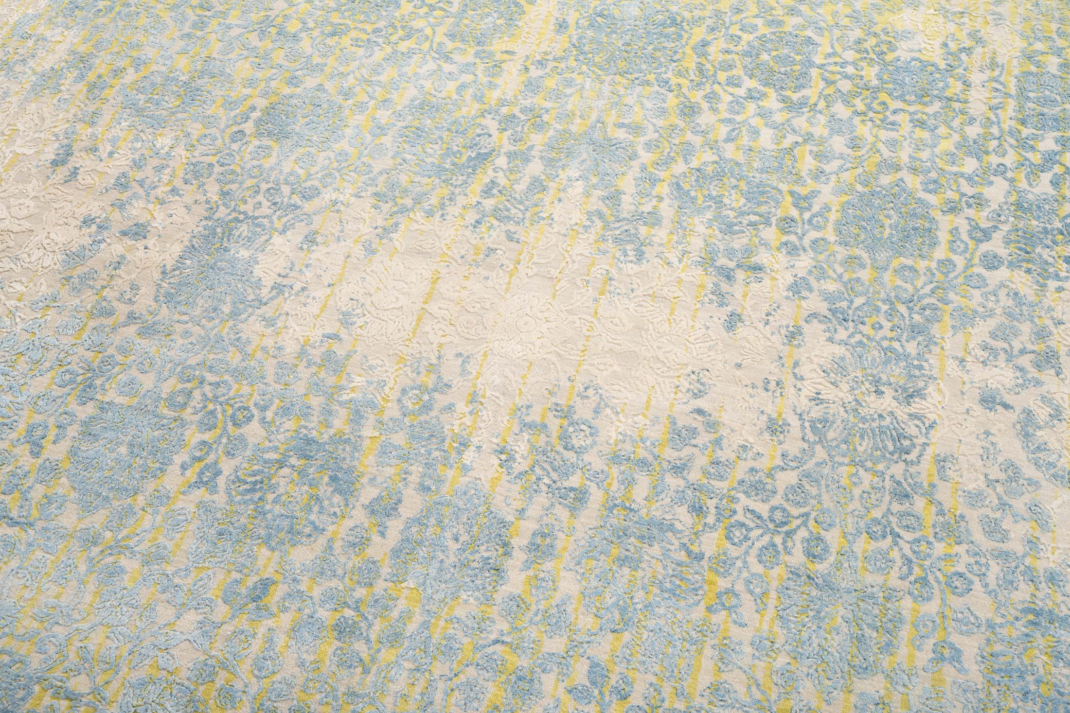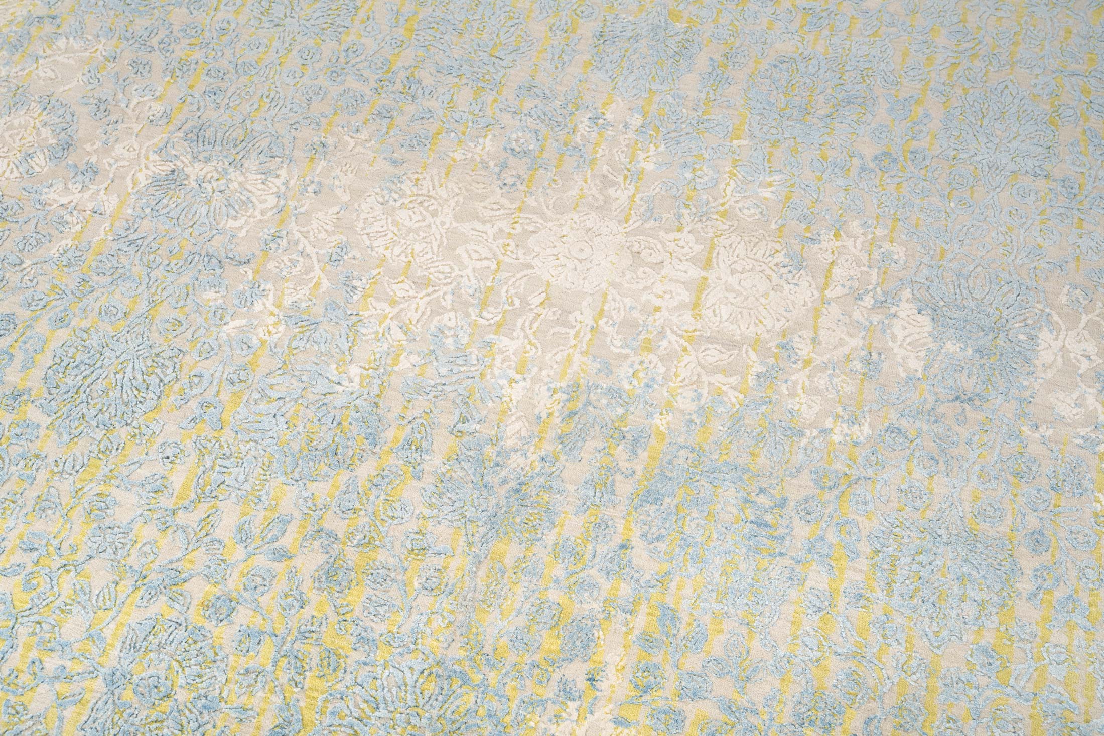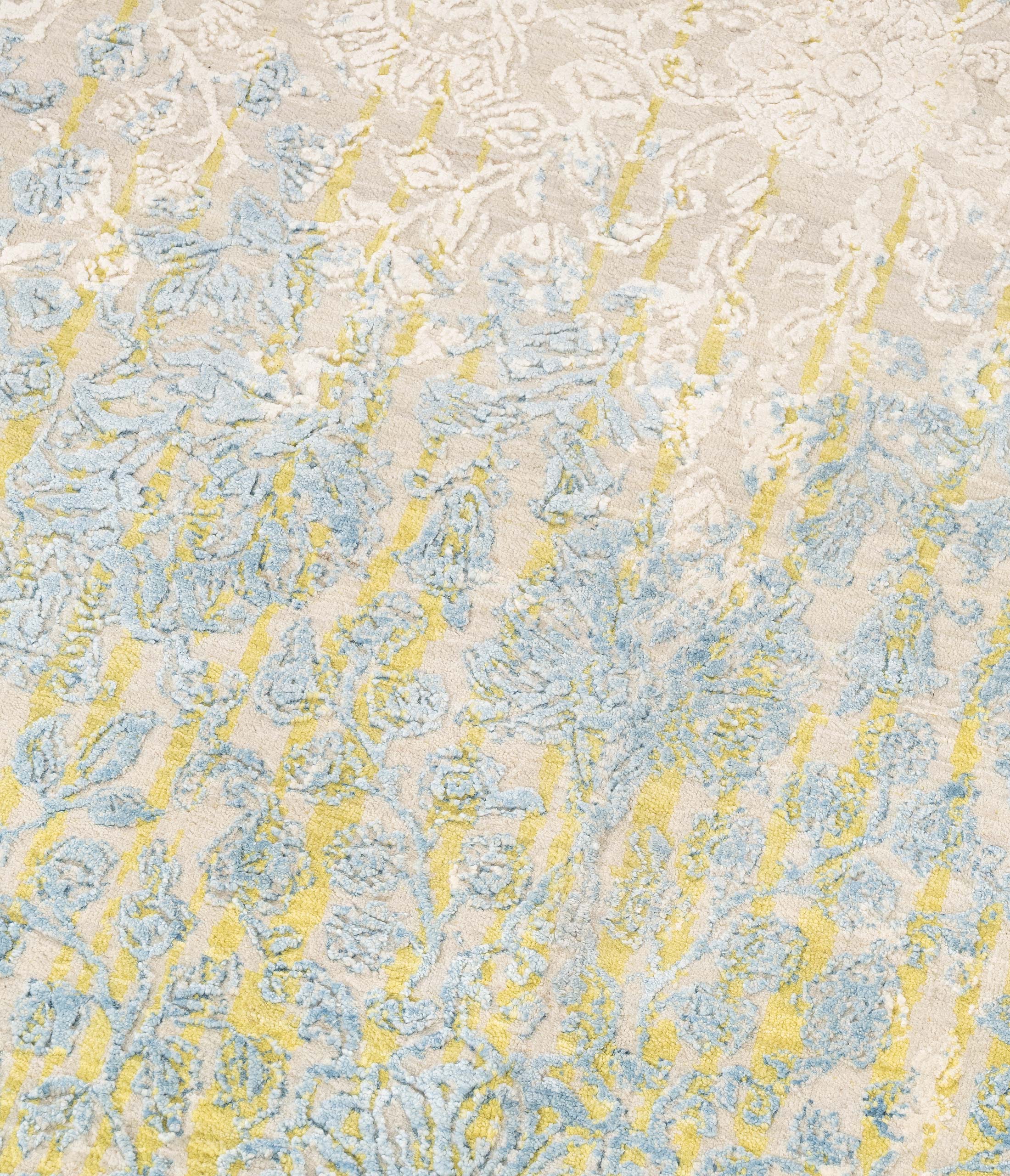 Hier präsentieren wir den handgeknüpften Designerteppich Eterno Prime aus Indien. Die Hauptfarbe ist ein warmes Sandbeige bis Creme, darüber liegen als wichtigste Akzente ein zartes Himmelblau, ein gedämpftes Goldgelb und helle Elfenbeintöne. Insgesamt wirkt die Farbwelt freundlich und ruhig, mit vielen fein nuancierten Übergängen und einem leichten Vintage Charakter. Durch den aufwendigen Reliefschnitt und den Glanz der Naturseide entstehen je nach Lichteinfall sichtbare Wechsel von ...mehr Beschreibung