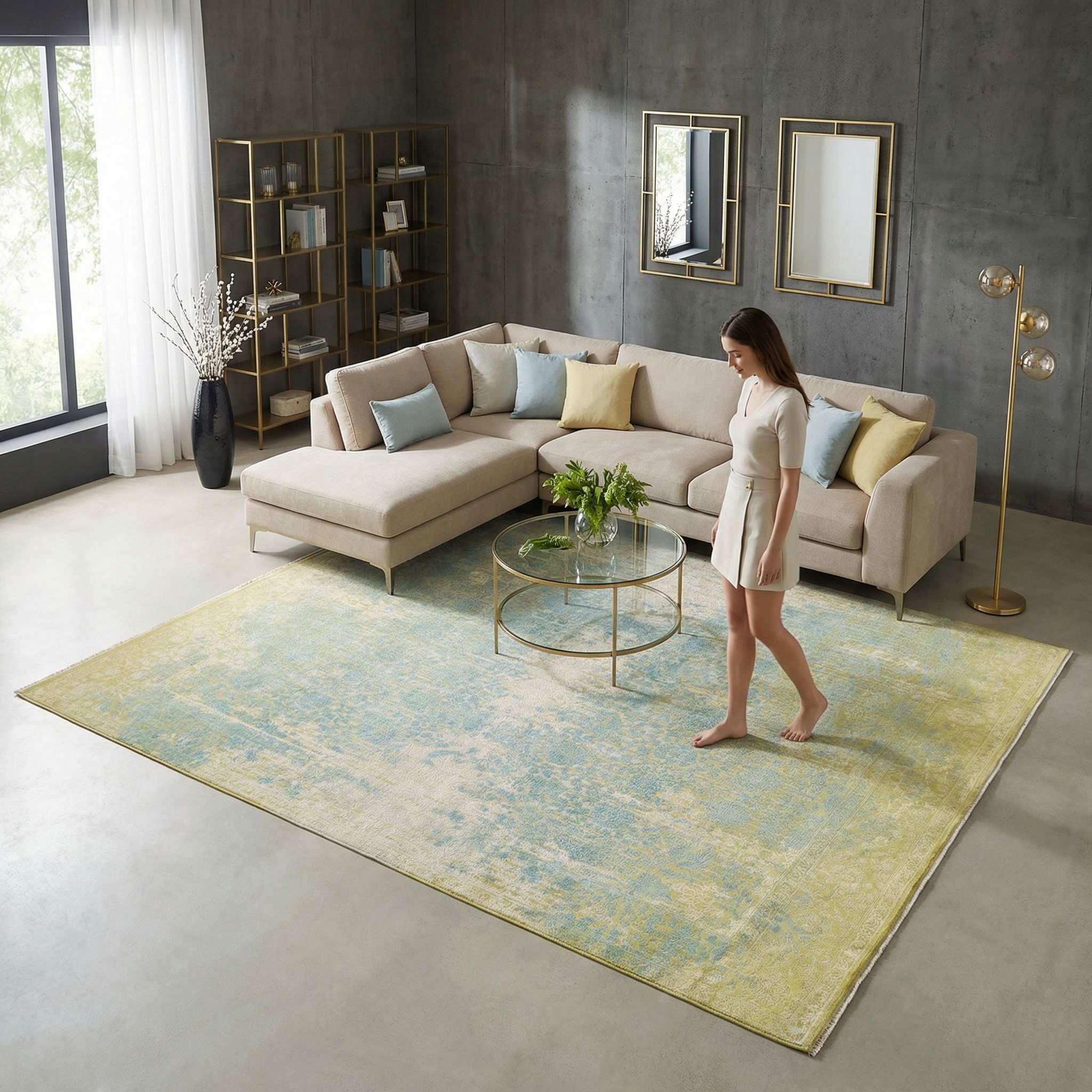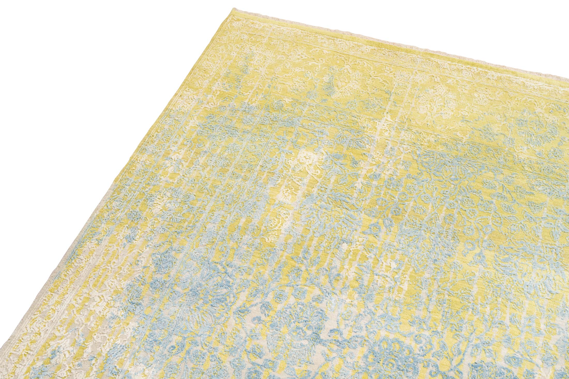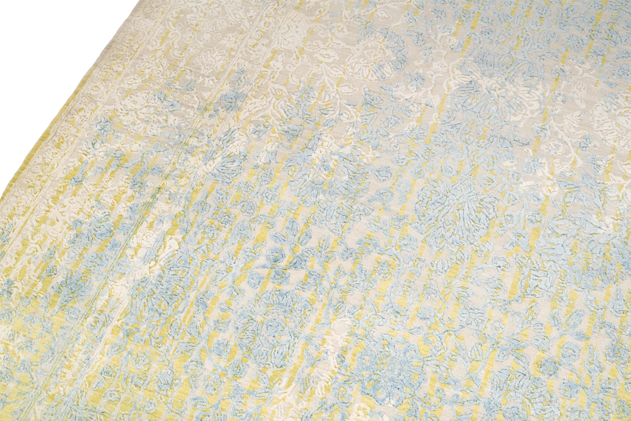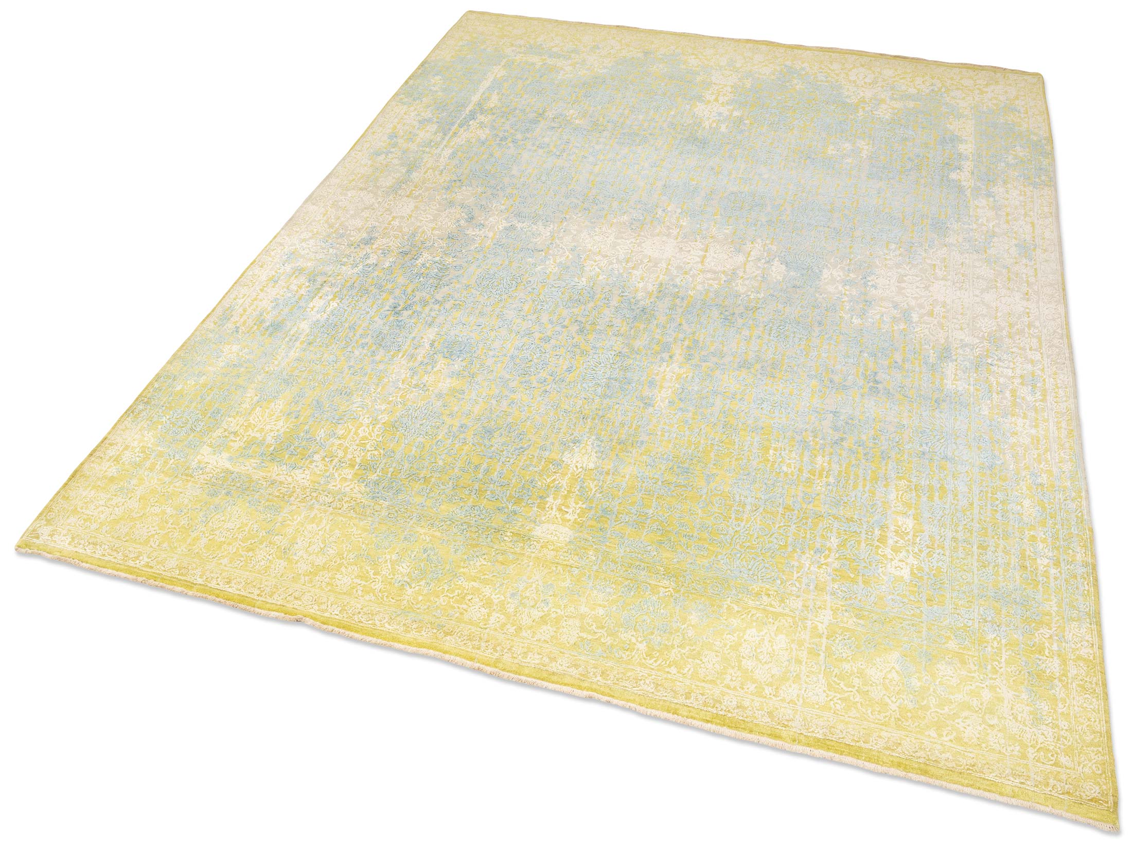 Hier präsentieren wir den handgeknüpften Designerteppich Eterno Prime aus Indien. Die Hauptfarbe ist ein warmes Sandbeige bis Creme, darüber liegen als wichtigste Akzente ein zartes Himmelblau, ein gedämpftes Goldgelb und helle Elfenbeintöne. Insgesamt wirkt die Farbwelt freundlich und ruhig, mit vielen fein nuancierten Übergängen und einem leichten Vintage Charakter. Durch den aufwendigen Reliefschnitt und den Glanz der Naturseide entstehen je nach Lichteinfall sichtbare Wechsel von ...mehr Beschreibung