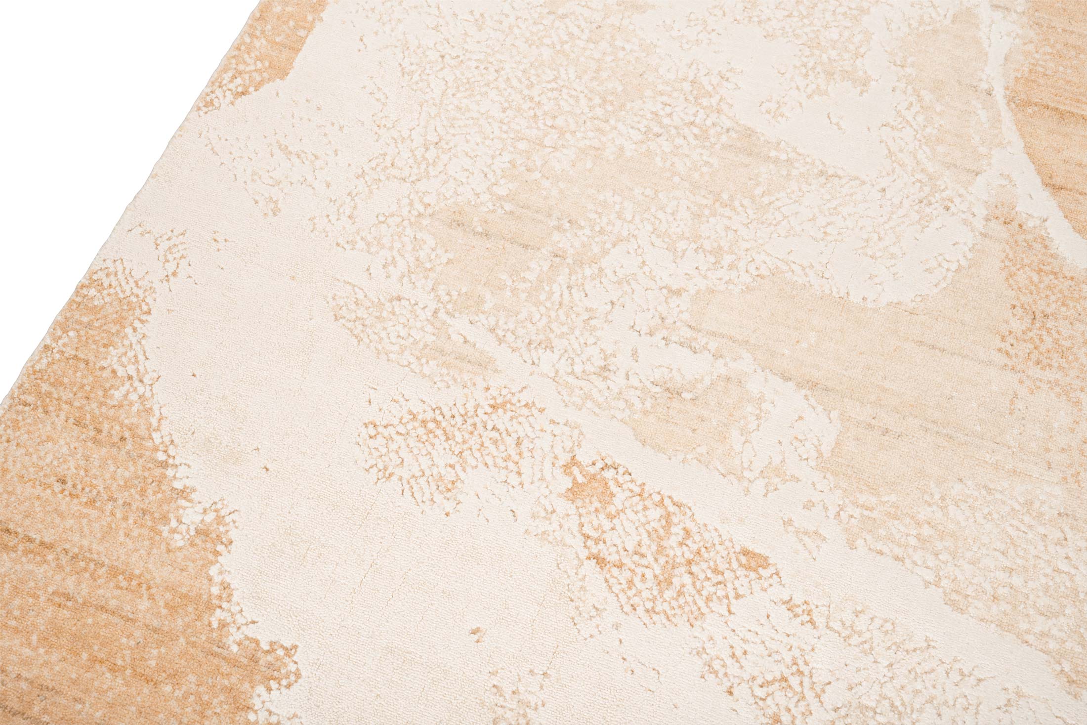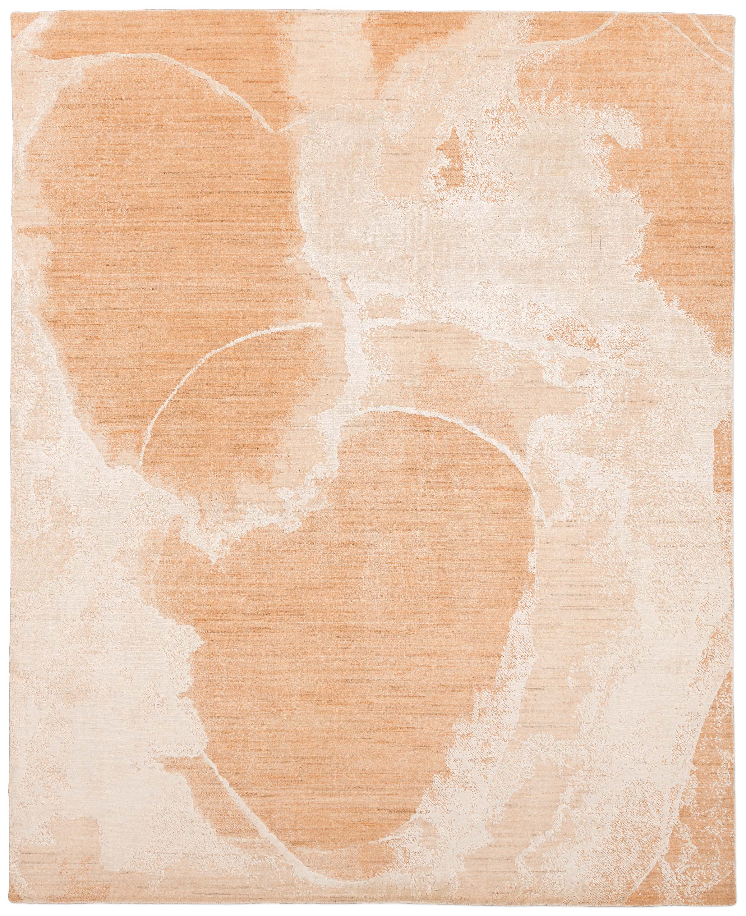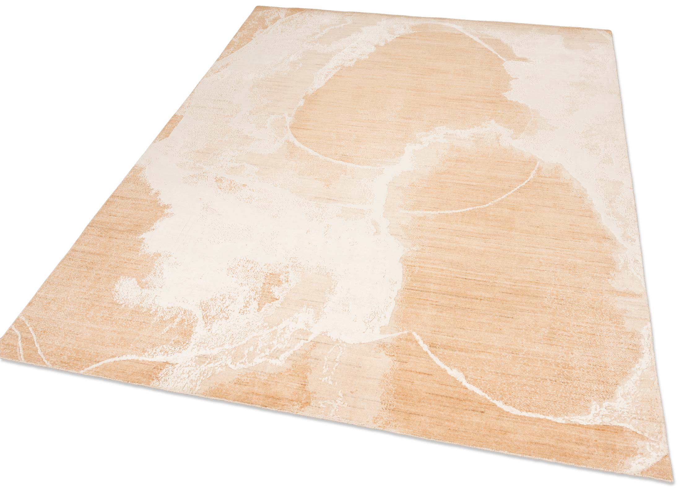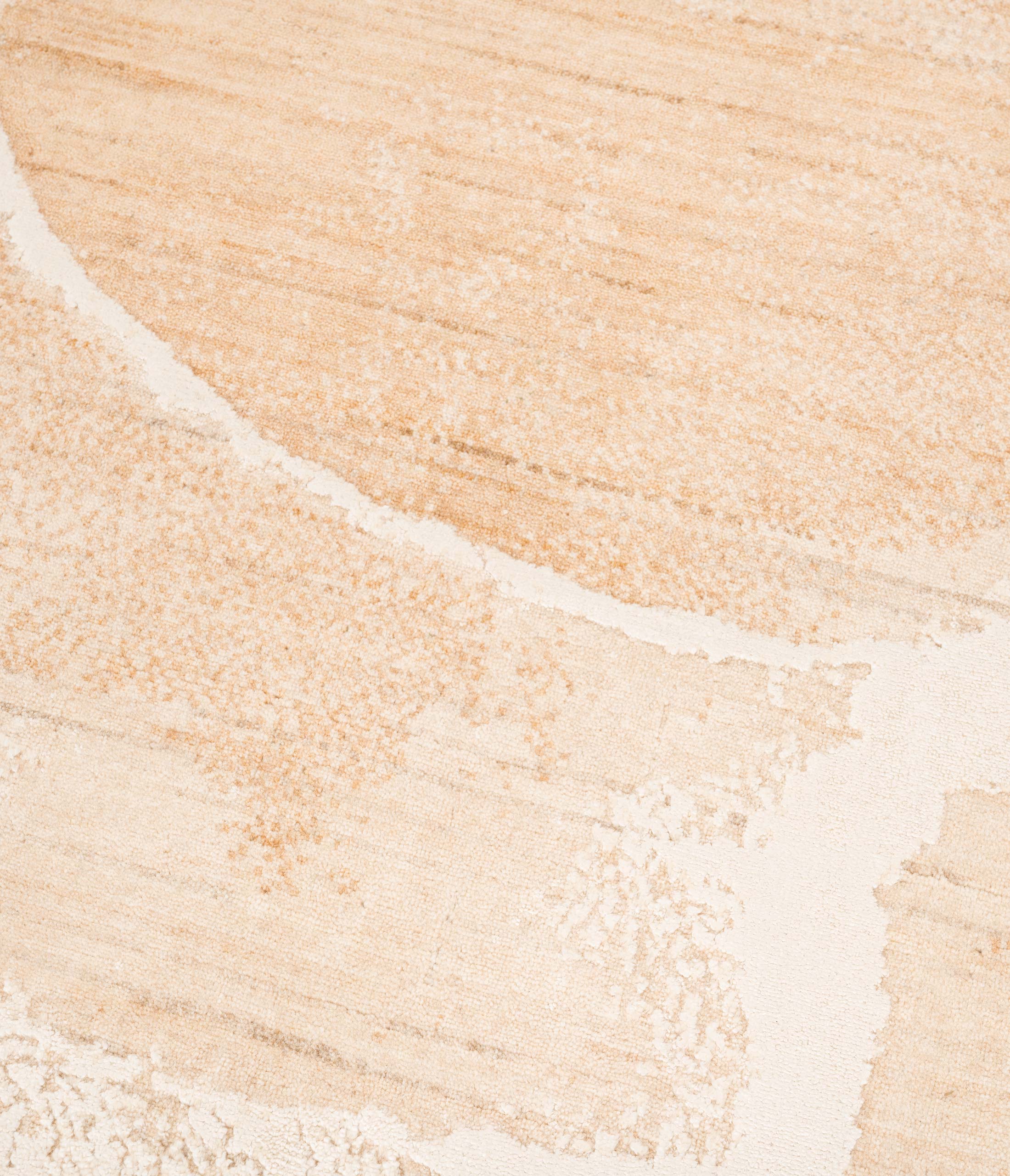 Das Muster ist modern und abstrakt angelegt: großflächige, wolkige Formen und geschwungene Linien überlagern sich wie organische Inseln auf einem ruhigen Grund. Die Konturen sind nicht hart, sondern wie mit Pinsel oder Kalklinie angedeutet, was dem Teppich eine elegante Leichtigkeit verleiht. Durch die handwerkliche Webstruktur entsteht eine lebendige Oberfläche, die das Motiv subtil betont, ohne den Raum zu dominieren. Gefertigt aus natürlichen Materialien wie Schafwolle und Bambusseide, passt dieser Teppich besonders gut in moderne, skandinavische oder minimalistische Einrichtungen und bringt Wärme in helle wie auch in neutrale Wohnkonzepte.