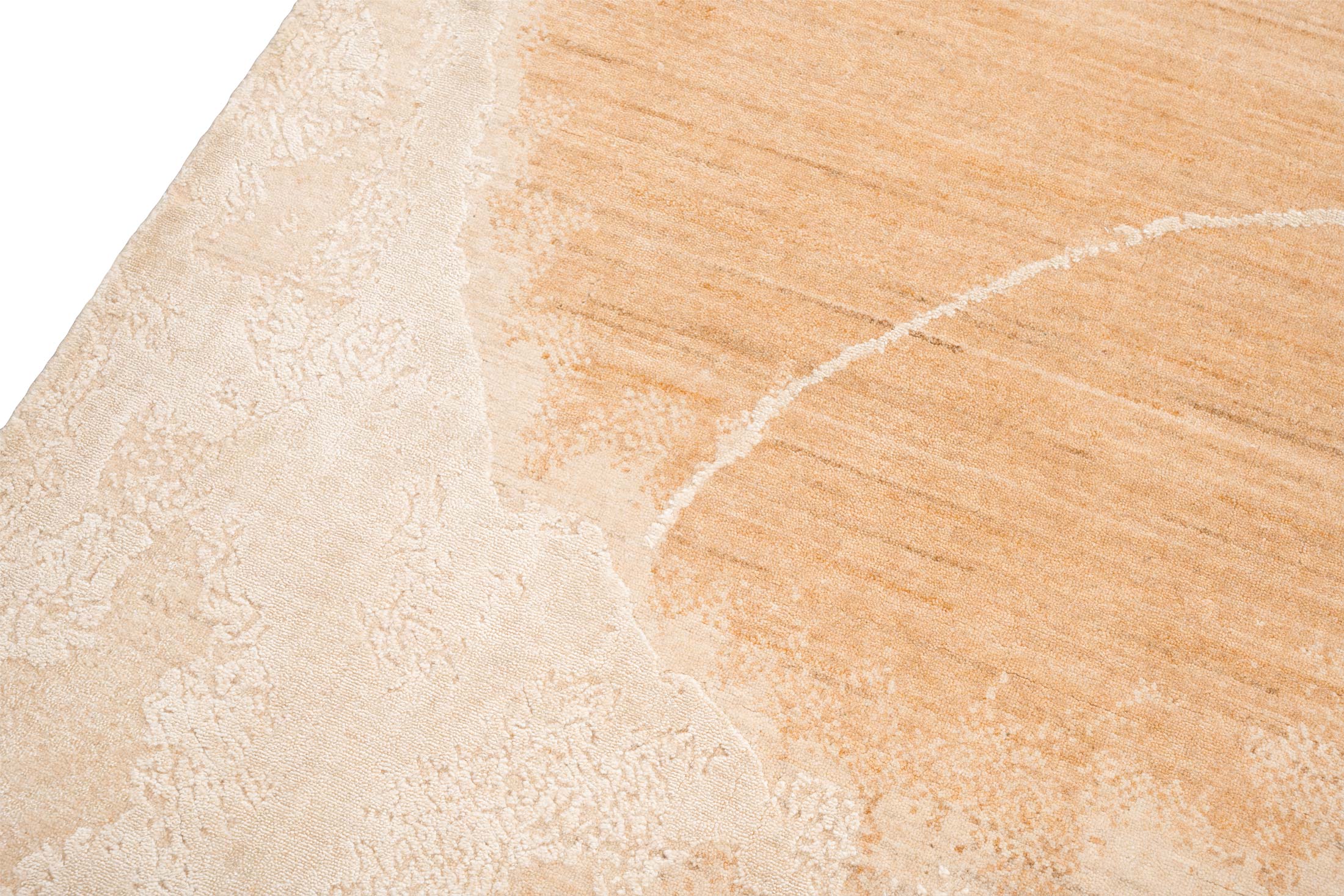 Die naturverbundene Leichtigkeit dieses Meisterwerks harmoniert perfekt mit der reduzierten, hellen Ästhetik des skandinavischen Wohnstils. Dank der Verwendung von hochwertiger Schafwolle und natürlichen Pflanzenfarben bringt der Teppich genau jene organische Wärme und Gemütlichkeit in den Raum, die das nordische "Hygge"-Gefühl ausmachen. Seine fließenden, an Naturphänomene erinnernden Formen in sanften Sand- und Apricottönen lockern geradlinige Holzmöbel auf elegante Weise auf. Erleben Sie ein Stück traditioneller Handwerkskunst, das durch seine unaufdringliche, aber luxuriöse Präsenz das skandinavische Designkonzept auf ein völlig neues Niveau hebt.