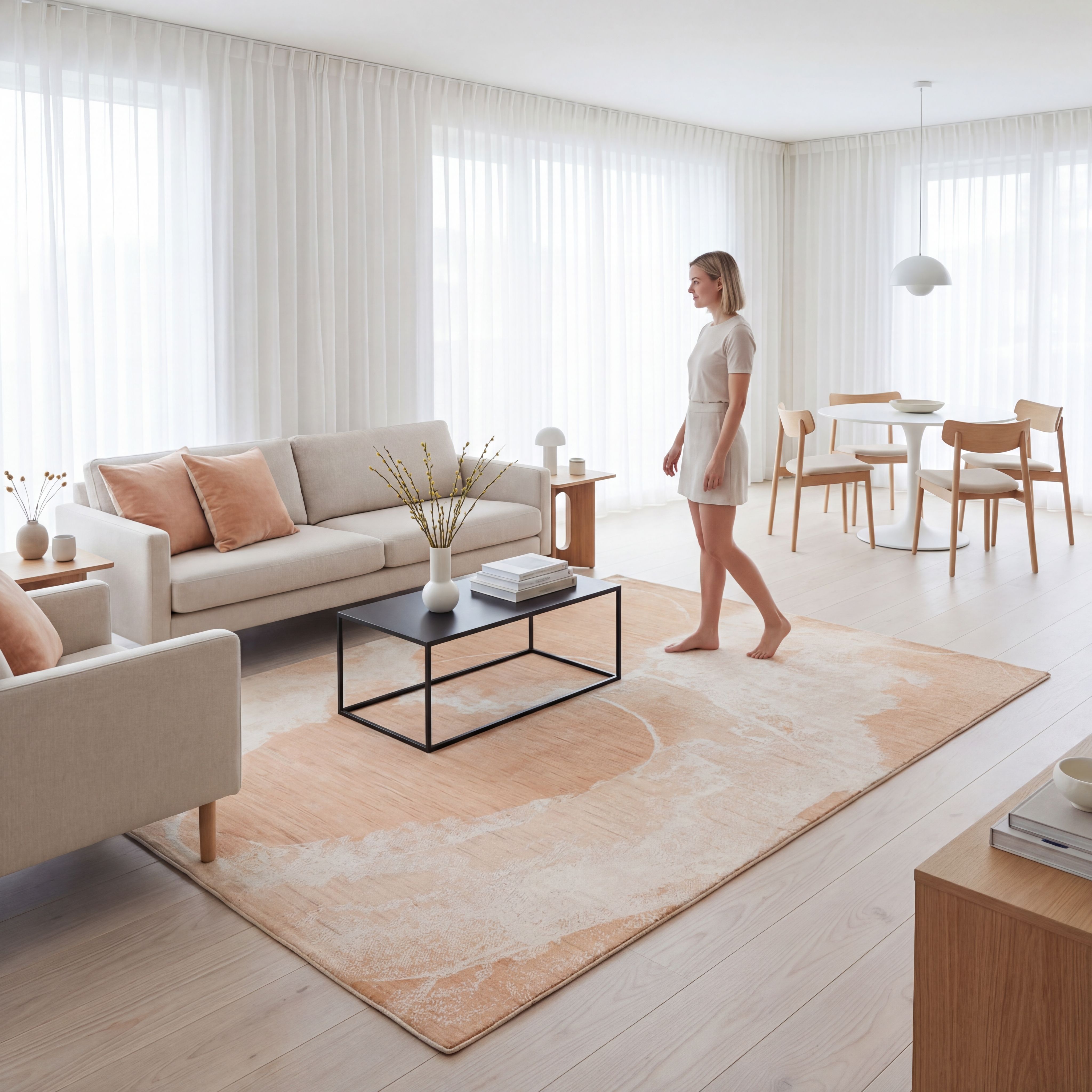 Im New-Country-Style überzeugt dieser Teppich durch seine warme, weiche Farbgebung und seine handwerkliche Ausstrahlung. Die Kombination aus Schafwolle und Bambusseide wirkt besonders hochwertig und passt perfekt zu natürlichen Materialien wie Holz oder hellen Stoffen. Sein ruhiges, leicht künstlerisches Muster bringt Lebendigkeit in den Raum, ohne die gemütliche Atmosphäre zu stören. Dadurch entsteht ein stilvolles, wohnliches Ambiente mit viel Charakter.