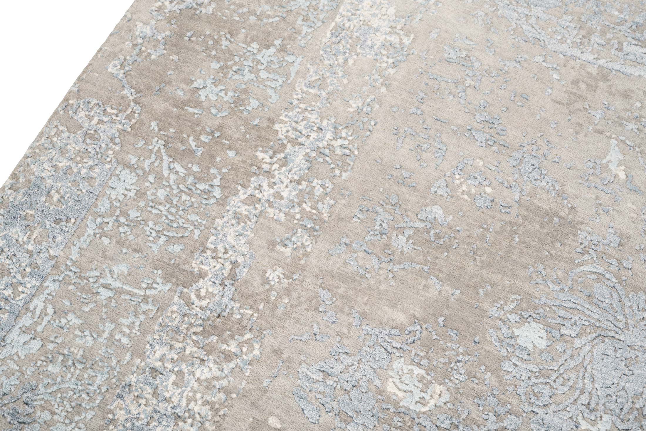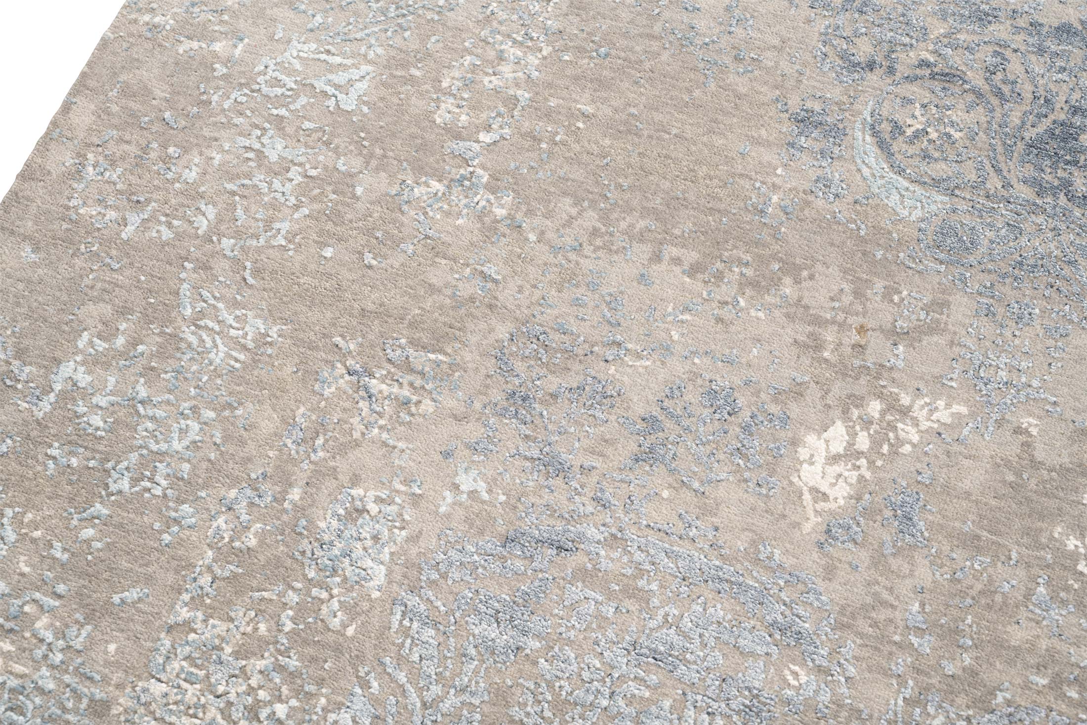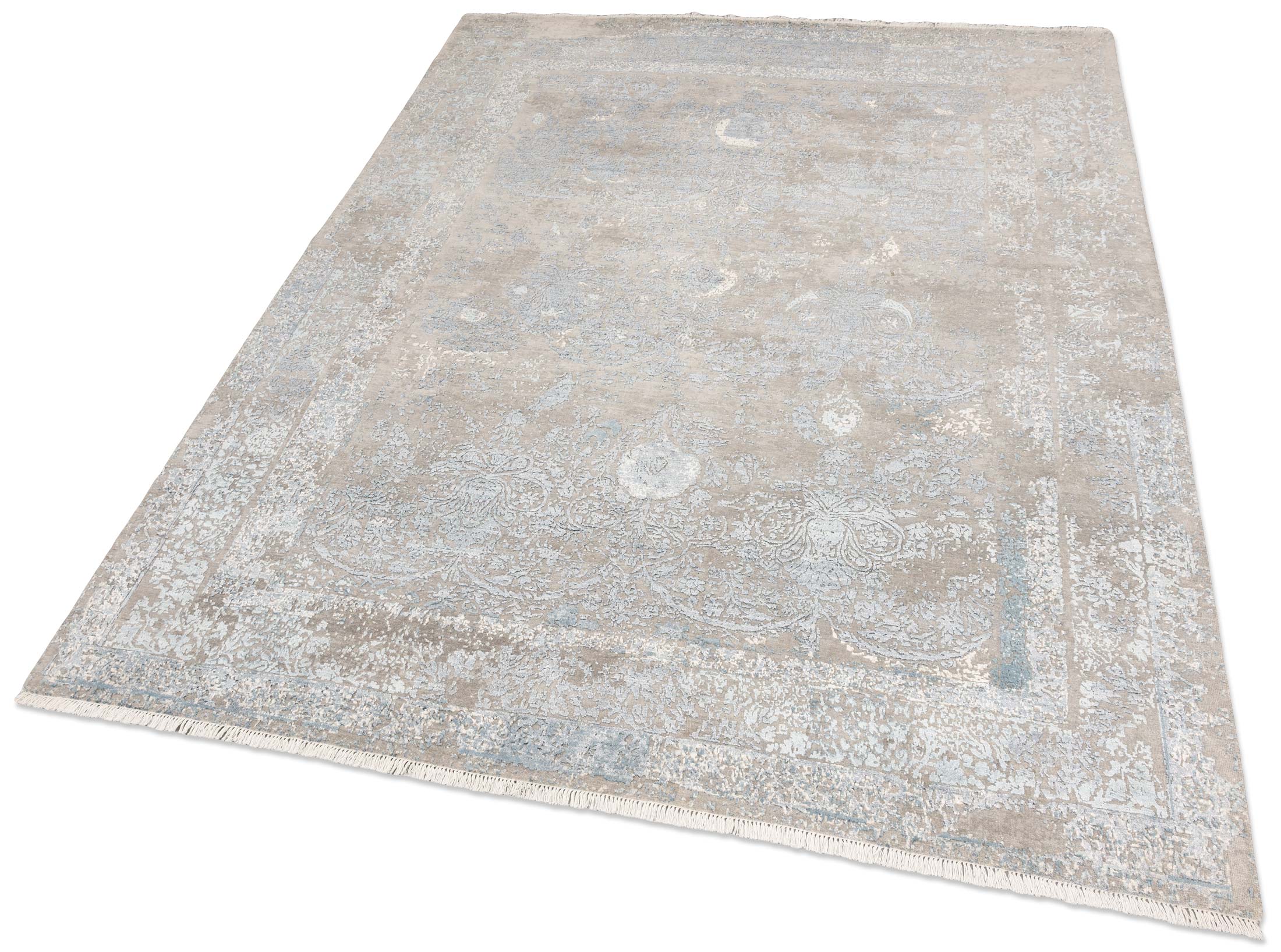 Das Muster greift klassische Ornamente auf, interpretiert sie jedoch hochmodern: In der Mitte liegt ein angedeutetes Medaillon, umgeben von floralen Ranken und feinen Arabesken, die stellenweise wie verwittert erscheinen. Eine breite Bordüre rahmt das Feld, ebenfalls mit verwaschenen Ornamentlinien, sodass ein edler Used Look entsteht. Gefertigt ist dieser Designerteppich im persischen Knoten aus rein natürlichen Materialien, handgekardeter Schafwolle von höchster Qualität kombiniert mit erstklassiger Bambusseide. Die feine Knüpfung und der aufwendige, von Hand gearbeitete Reliefschnitt sorgen für spürbare Struktur und einen dezenten Glanzwechsel je nach Lichteinfall.