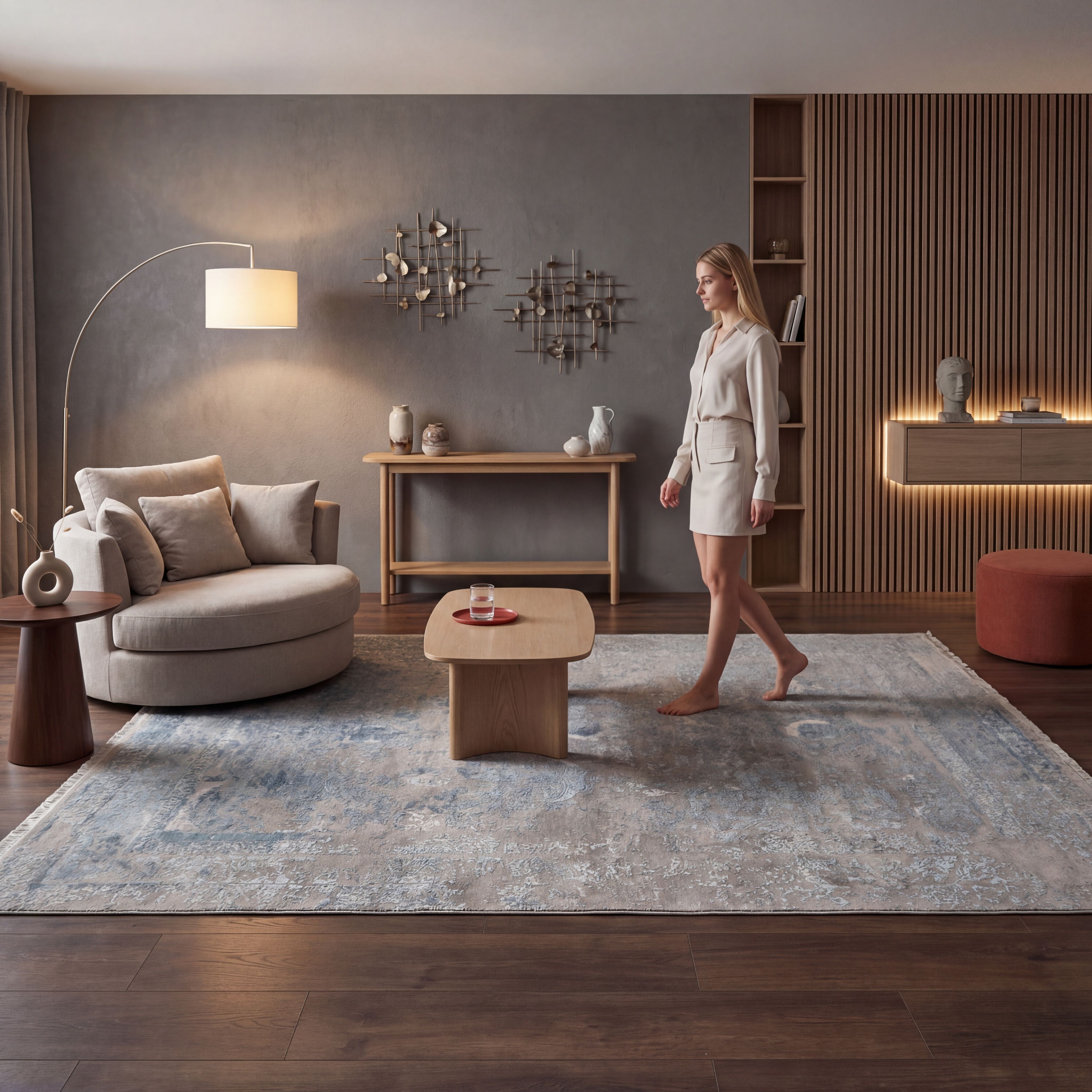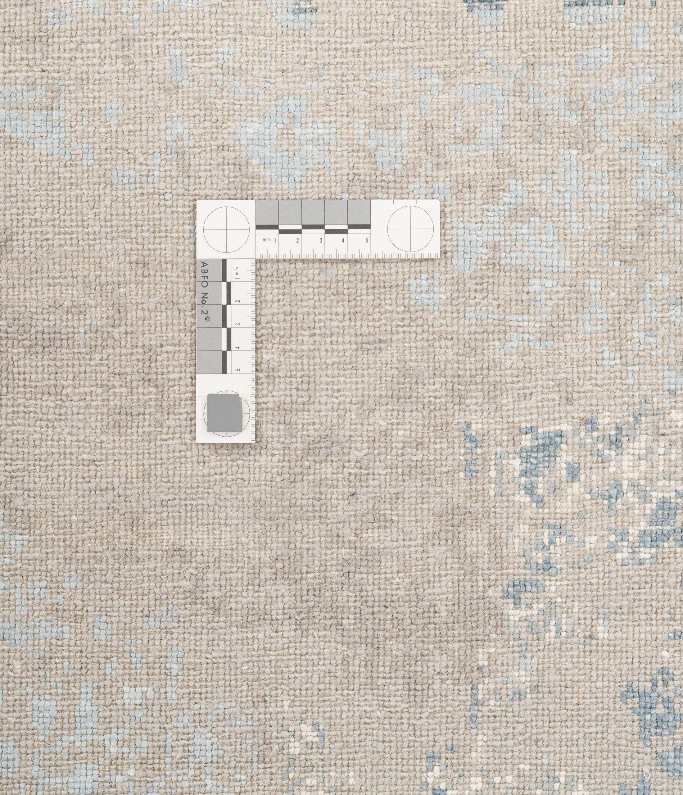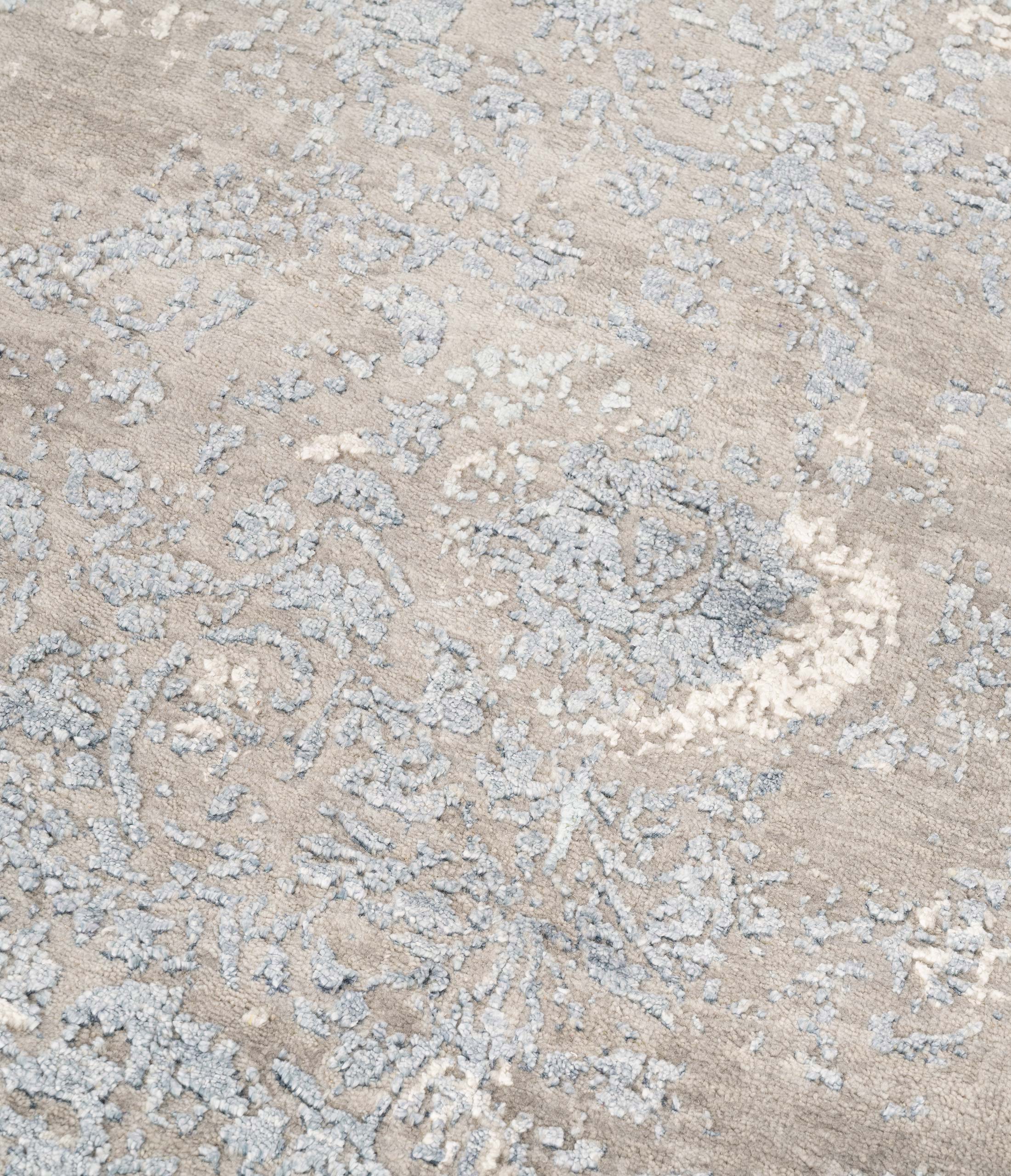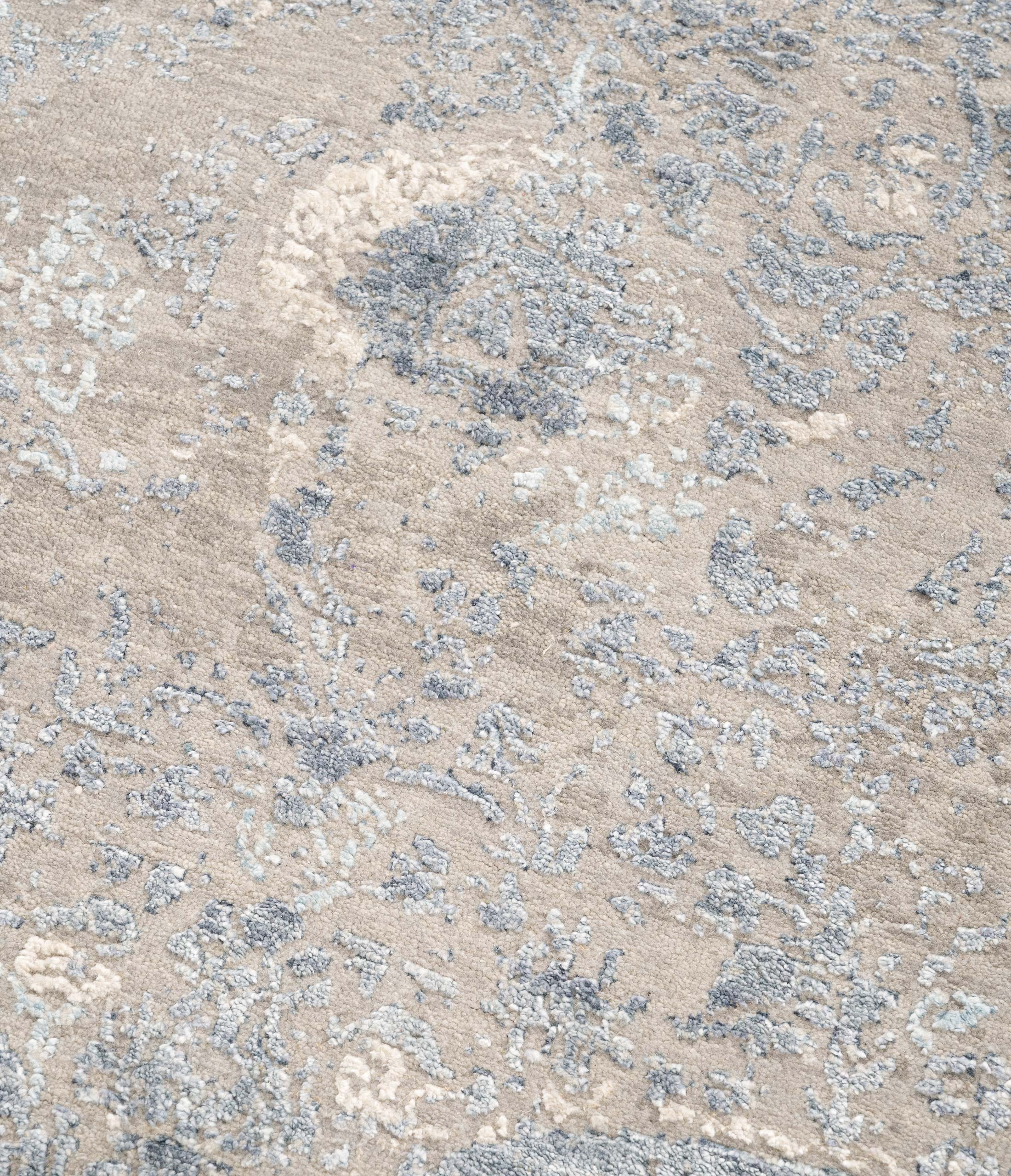 Hier präsentieren wir den handgeknüpften Teppich Eterno aus Indien in einer ruhigen, eleganten Farbwelt. Die Hauptfarbe ist ein warmes Greige zwischen Beige und hellem Taupe, das dem Raum sofort eine natürliche, wohnliche Basis gibt. Dazu kommen als wichtigste Akzentfarben ein kühles Eisblau bis Taubenblau sowie sanfte Silbergrau Nuancen, die wie feiner Abrieb über der Fläche liegen und dem Teppich seinen modernen Vintage Charakter verleihen. Kleine Aufhellungen in Creme und gebrochenem Weiß setzen lichte Highlights und lassen einzelne Partien subtil schimmern. Insgesamt wirkt die Farbgebung bewusst zurückhaltend und harmonisch, ohne bunt zu sein, ideal für moderne Interieurs und ruhige Farbkonzepte.